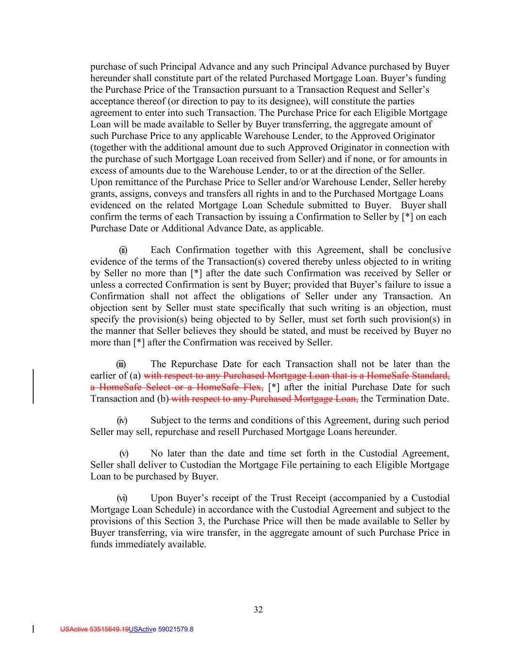 32 USActive 53515649.19USActive 59021579.8 purchase of such Principal Advance and any such Principal Advance purchased by Buyer hereunder shall constitute part of the related Purchased Mortgage Loan. Buyer’s funding the Purchase Price of the Transaction pursuant to a Transaction Request and Seller’s acceptance thereof (or direction to pay to its designee), will constitute the parties agreement to enter into such Transaction. The Purchase Price for each Eligible Mortgage Loan will be made available to Seller by Buyer transferring, the aggregate amount of such Purchase Price to any applicable Warehouse Lender, to the Approved Originator (together with the additional amount due to such Approved Originator in connection with the purchase of such Mortgage Loan received from Seller) and if none, or for amounts in excess of amounts due to the Warehouse Lender, to or at the direction of the Seller. Upon remittance of the Purchase Price to Seller and/or Warehouse Lender, Seller hereby grants, assigns, conveys and transfers all rights in and to the Purchased Mortgage Loans evidenced on the related Mortgage Loan Schedule submitted to Buyer. Buyer shall confirm the terms of each Transaction by issuing a Confirmation to Seller by [*] on each Purchase Date or Additional Advance Date, as applicable. (ii) Each Confirmation together with this Agreement, shall be conclusive evidence of the terms of the Transaction(s) covered thereby unless objected to in writing by Seller no more than [*] after the date such Confirmation was received by Seller or unless a corrected Confirmation is sent by Buyer; provided that Buyer’s failure to issue a Confirmation shall not affect the obligations of Seller under any Transaction. An objection sent by Seller must state specifically that such writing is an objection, must specify the provision(s) being objected to by Seller, must set forth such provision(s) in the manner that Seller believes they should be stated, and must be received by Buyer no more than [*] after the Confirmation was received by Seller. (iii) The Repurchase Date for each Transaction shall not be later than the earlier of (a) with respect to any Purchased Mortgage Loan that is a HomeSafe Standard, a HomeSafe Select or a HomeSafe Flex, [*] after the initial Purchase Date for such Transaction and (b) with respect to any Purchased Mortgage Loan, the Termination Date. (iv) Subject to the terms and conditions of this Agreement, during such period Seller may sell, repurchase and resell Purchased Mortgage Loans hereunder. (v) No later than the date and time set forth in the Custodial Agreement, Seller shall deliver to Custodian the Mortgage File pertaining to each Eligible Mortgage Loan to be purchased by Buyer. (vi) Upon Buyer’s receipt of the Trust Receipt (accompanied by a Custodial Mortgage Loan Schedule) in accordance with the Custodial Agreement and subject to the provisions of this Section 3, the Purchase Price will then be made available to Seller by Buyer transferring, via wire transfer, in the aggregate amount of such Purchase Price in funds immediately available.