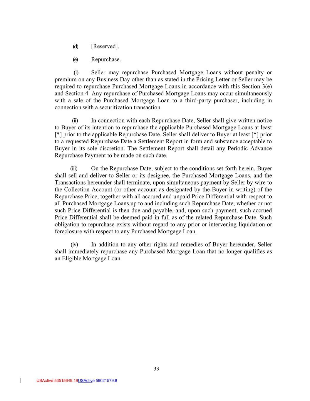 33 USActive 53515649.19USActive 59021579.8 (d) [Reserved]. (e) Repurchase. (i) Seller may repurchase Purchased Mortgage Loans without penalty or premium on any Business Day other than as stated in the Pricing Letter or Seller may be required to repurchase Purchased Mortgage Loans in accordance with this Section 3(e) and Section 4. Any repurchase of Purchased Mortgage Loans may occur simultaneously with a sale of the Purchased Mortgage Loan to a third-party purchaser, including in connection with a securitization transaction. (ii) In connection with each Repurchase Date, Seller shall give written notice to Buyer of its intention to repurchase the applicable Purchased Mortgage Loans at least [*] prior to the applicable Repurchase Date. Seller shall deliver to Buyer at least [*] prior to a requested Repurchase Date a Settlement Report in form and substance acceptable to Buyer in its sole discretion. The Settlement Report shall detail any Periodic Advance Repurchase Payment to be made on such date. (iii) On the Repurchase Date, subject to the conditions set forth herein, Buyer shall sell and deliver to Seller or its designee, the Purchased Mortgage Loans, and the Transactions hereunder shall terminate, upon simultaneous payment by Seller by wire to the Collection Account (or other account as designated by the Buyer in writing) of the Repurchase Price, together with all accrued and unpaid Price Differential with respect to all Purchased Mortgage Loans up to and including such Repurchase Date, whether or not such Price Differential is then due and payable, and, upon such payment, such accrued Price Differential shall be deemed paid in full as of the related Repurchase Date. Such obligation to repurchase exists without regard to any prior or intervening liquidation or foreclosure with respect to any Purchased Mortgage Loan. (iv) In addition to any other rights and remedies of Buyer hereunder, Seller shall immediately repurchase any Purchased Mortgage Loan that no longer qualifies as an Eligible Mortgage Loan.