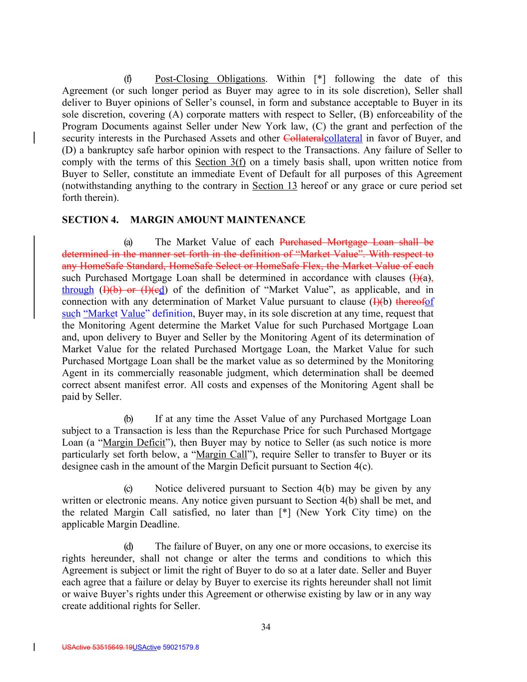 34 USActive 53515649.19USActive 59021579.8 (f) Post-Closing Obligations. Within [*] following the date of this Agreement (or such longer period as Buyer may agree to in its sole discretion), Seller shall deliver to Buyer opinions of Seller’s counsel, in form and substance acceptable to Buyer in its sole discretion, covering (A) corporate matters with respect to Seller, (B) enforceability of the Program Documents against Seller under New York law, (C) the grant and perfection of the security interests in the Purchased Assets and other Collateralcollateral in favor of Buyer, and (D) a bankruptcy safe harbor opinion with respect to the Transactions. Any failure of Seller to comply with the terms of this Section 3(f) on a timely basis shall, upon written notice from Buyer to Seller, constitute an immediate Event of Default for all purposes of this Agreement (notwithstanding anything to the contrary in Section 13 hereof or any grace or cure period set forth therein). SECTION 4. MARGIN AMOUNT MAINTENANCE (a) The Market Value of each Purchased Mortgage Loan shall be determined in the manner set forth in the definition of “Market Value”. With respect to any HomeSafe Standard, HomeSafe Select or HomeSafe Flex, the Market Value of each such Purchased Mortgage Loan shall be determined in accordance with clauses (I)(a), through (I)(b) or (I)(cd) of the definition of “Market Value”, as applicable, and in connection with any determination of Market Value pursuant to clause (I)(b) thereofof such “Market Value” definition, Buyer may, in its sole discretion at any time, request that the Monitoring Agent determine the Market Value for such Purchased Mortgage Loan and, upon delivery to Buyer and Seller by the Monitoring Agent of its determination of Market Value for the related Purchased Mortgage Loan, the Market Value for such Purchased Mortgage Loan shall be the market value as so determined by the Monitoring Agent in its commercially reasonable judgment, which determination shall be deemed correct absent manifest error. All costs and expenses of the Monitoring Agent shall be paid by Seller. (b) If at any time the Asset Value of any Purchased Mortgage Loan subject to a Transaction is less than the Repurchase Price for such Purchased Mortgage Loan (a “Margin Deficit”), then Buyer may by notice to Seller (as such notice is more particularly set forth below, a “Margin Call”), require Seller to transfer to Buyer or its designee cash in the amount of the Margin Deficit pursuant to Section 4(c). (c) Notice delivered pursuant to Section 4(b) may be given by any written or electronic means. Any notice given pursuant to Section 4(b) shall be met, and the related Margin Call satisfied, no later than [*] (New York City time) on the applicable Margin Deadline. (d) The failure of Buyer, on any one or more occasions, to exercise its rights hereunder, shall not change or alter the terms and conditions to which this Agreement is subject or limit the right of Buyer to do so at a later date. Seller and Buyer each agree that a failure or delay by Buyer to exercise its rights hereunder shall not limit or waive Buyer’s rights under this Agreement or otherwise existing by law or in any way create additional rights for Seller.