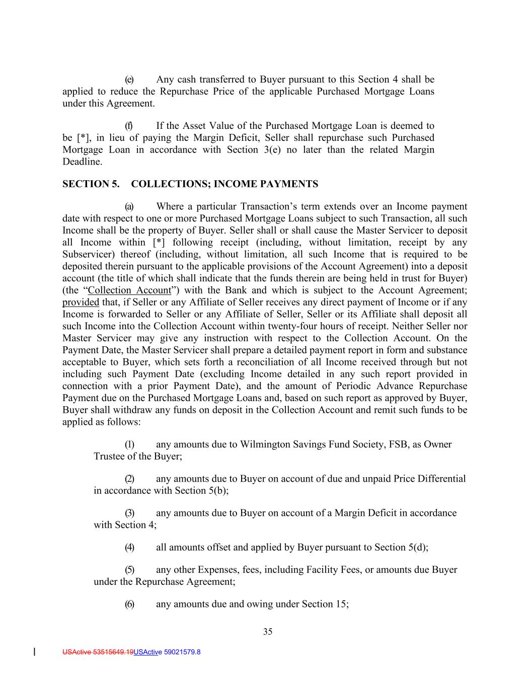 35 USActive 53515649.19USActive 59021579.8 (e) Any cash transferred to Buyer pursuant to this Section 4 shall be applied to reduce the Repurchase Price of the applicable Purchased Mortgage Loans under this Agreement. (f) If the Asset Value of the Purchased Mortgage Loan is deemed to be [*], in lieu of paying the Margin Deficit, Seller shall repurchase such Purchased Mortgage Loan in accordance with Section 3(e) no later than the related Margin Deadline. SECTION 5. COLLECTIONS; INCOME PAYMENTS (a) Where a particular Transaction’s term extends over an Income payment date with respect to one or more Purchased Mortgage Loans subject to such Transaction, all such Income shall be the property of Buyer. Seller shall or shall cause the Master Servicer to deposit all Income within [*] following receipt (including, without limitation, receipt by any Subservicer) thereof (including, without limitation, all such Income that is required to be deposited therein pursuant to the applicable provisions of the Account Agreement) into a deposit account (the title of which shall indicate that the funds therein are being held in trust for Buyer) (the “Collection Account”) with the Bank and which is subject to the Account Agreement; provided that, if Seller or any Affiliate of Seller receives any direct payment of Income or if any Income is forwarded to Seller or any Affiliate of Seller, Seller or its Affiliate shall deposit all such Income into the Collection Account within twenty-four hours of receipt. Neither Seller nor Master Servicer may give any instruction with respect to the Collection Account. On the Payment Date, the Master Servicer shall prepare a detailed payment report in form and substance acceptable to Buyer, which sets forth a reconciliation of all Income received through but not including such Payment Date (excluding Income detailed in any such report provided in connection with a prior Payment Date), and the amount of Periodic Advance Repurchase Payment due on the Purchased Mortgage Loans and, based on such report as approved by Buyer, Buyer shall withdraw any funds on deposit in the Collection Account and remit such funds to be applied as follows: (1) any amounts due to Wilmington Savings Fund Society, FSB, as Owner Trustee of the Buyer; (2) any amounts due to Buyer on account of due and unpaid Price Differential in accordance with Section 5(b); (3) any amounts due to Buyer on account of a Margin Deficit in accordance with Section 4; (4) all amounts offset and applied by Buyer pursuant to Section 5(d); (5) any other Expenses, fees, including Facility Fees, or amounts due Buyer under the Repurchase Agreement; (6) any amounts due and owing under Section 15;