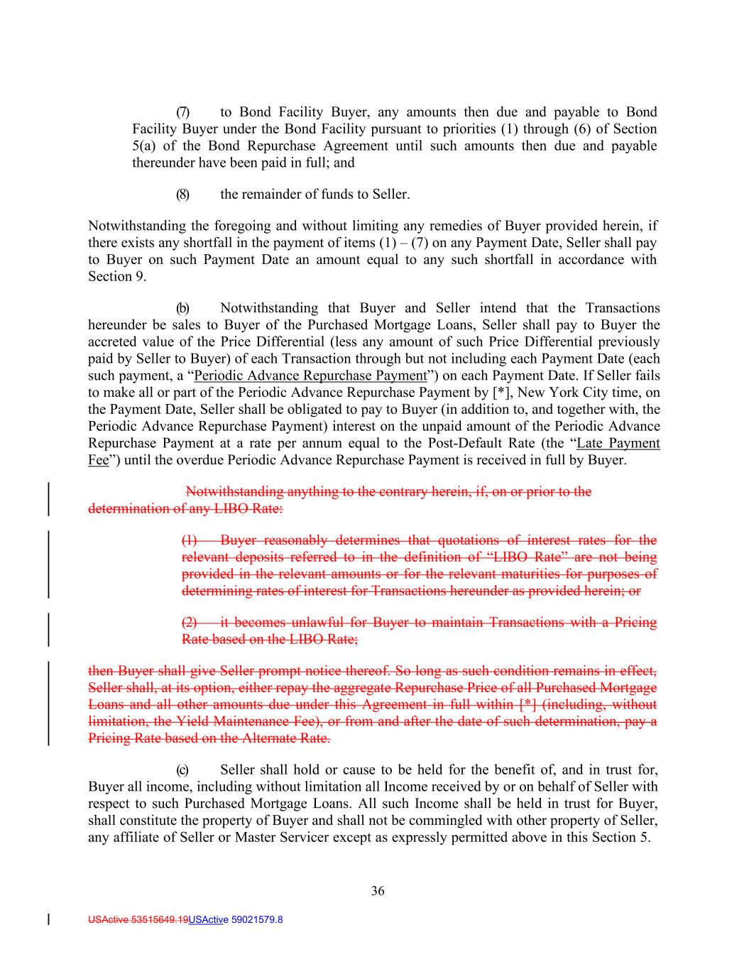36 USActive 53515649.19USActive 59021579.8 (7) to Bond Facility Buyer, any amounts then due and payable to Bond Facility Buyer under the Bond Facility pursuant to priorities (1) through (6) of Section 5(a) of the Bond Repurchase Agreement until such amounts then due and payable thereunder have been paid in full; and (8) the remainder of funds to Seller. Notwithstanding the foregoing and without limiting any remedies of Buyer provided herein, if there exists any shortfall in the payment of items (1) – (7) on any Payment Date, Seller shall pay to Buyer on such Payment Date an amount equal to any such shortfall in accordance with Section 9. (b) Notwithstanding that Buyer and Seller intend that the Transactions hereunder be sales to Buyer of the Purchased Mortgage Loans, Seller shall pay to Buyer the accreted value of the Price Differential (less any amount of such Price Differential previously paid by Seller to Buyer) of each Transaction through but not including each Payment Date (each such payment, a “Periodic Advance Repurchase Payment”) on each Payment Date. If Seller fails to make all or part of the Periodic Advance Repurchase Payment by [*], New York City time, on the Payment Date, Seller shall be obligated to pay to Buyer (in addition to, and together with, the Periodic Advance Repurchase Payment) interest on the unpaid amount of the Periodic Advance Repurchase Payment at a rate per annum equal to the Post-Default Rate (the “Late Payment Fee”) until the overdue Periodic Advance Repurchase Payment is received in full by Buyer. Notwithstanding anything to the contrary herein, if, on or prior to the determination of any LIBO Rate: (1) Buyer reasonably determines that quotations of interest rates for the relevant deposits referred to in the definition of “LIBO Rate” are not being provided in the relevant amounts or for the relevant maturities for purposes of determining rates of interest for Transactions hereunder as provided herein; or (2) it becomes unlawful for Buyer to maintain Transactions with a Pricing Rate based on the LIBO Rate; then Buyer shall give Seller prompt notice thereof. So long as such condition remains in effect, Seller shall, at its option, either repay the aggregate Repurchase Price of all Purchased Mortgage Loans and all other amounts due under this Agreement in full within [*] (including, without limitation, the Yield Maintenance Fee), or from and after the date of such determination, pay a Pricing Rate based on the Alternate Rate. (c) Seller shall hold or cause to be held for the benefit of, and in trust for, Buyer all income, including without limitation all Income received by or on behalf of Seller with respect to such Purchased Mortgage Loans. All such Income shall be held in trust for Buyer, shall constitute the property of Buyer and shall not be commingled with other property of Seller, any affiliate of Seller or Master Servicer except as expressly permitted above in this Section 5.
