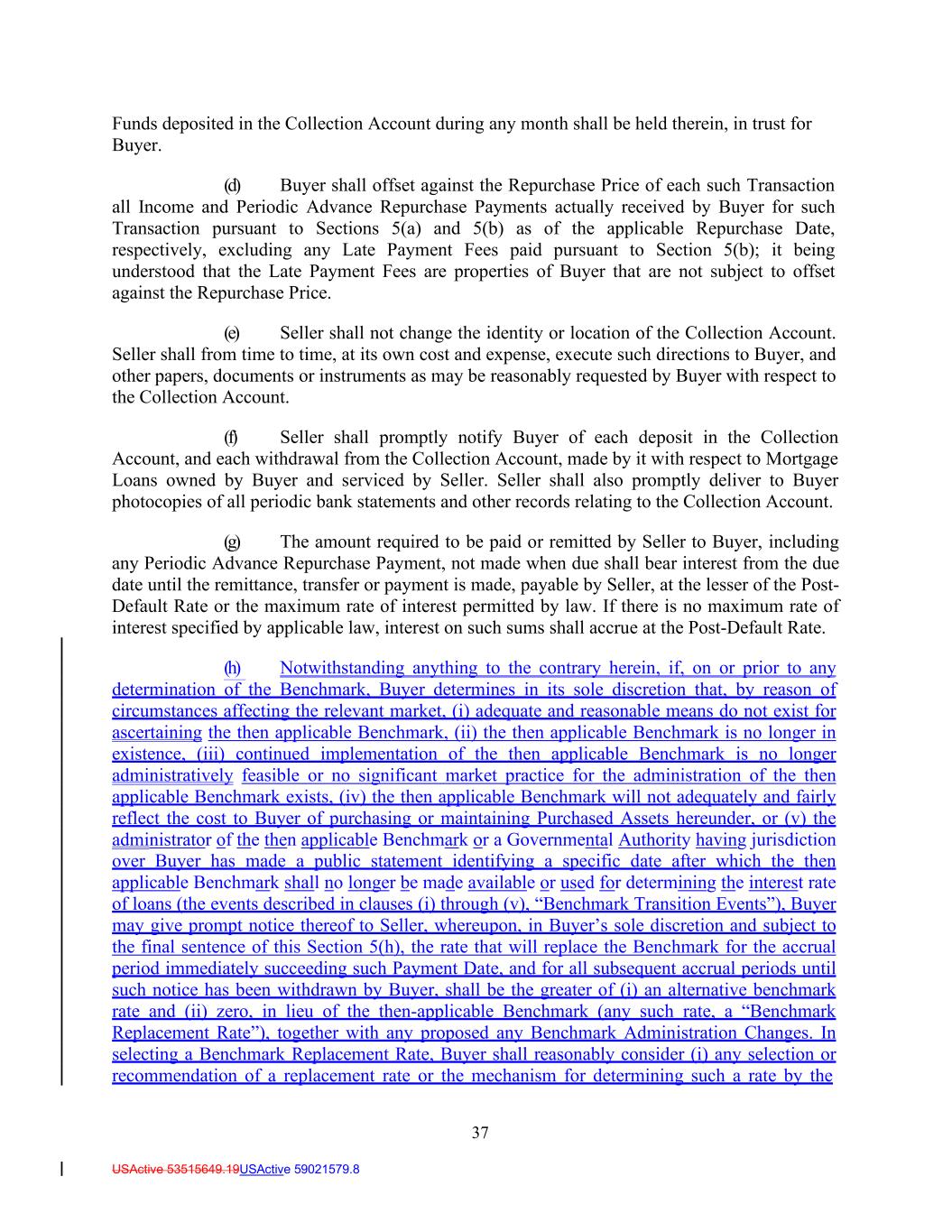 37 USActive 53515649.19USActive 59021579.8 Funds deposited in the Collection Account during any month shall be held therein, in trust for Buyer. (d) Buyer shall offset against the Repurchase Price of each such Transaction all Income and Periodic Advance Repurchase Payments actually received by Buyer for such Transaction pursuant to Sections 5(a) and 5(b) as of the applicable Repurchase Date, respectively, excluding any Late Payment Fees paid pursuant to Section 5(b); it being understood that the Late Payment Fees are properties of Buyer that are not subject to offset against the Repurchase Price. (e) Seller shall not change the identity or location of the Collection Account. Seller shall from time to time, at its own cost and expense, execute such directions to Buyer, and other papers, documents or instruments as may be reasonably requested by Buyer with respect to the Collection Account. (f) Seller shall promptly notify Buyer of each deposit in the Collection Account, and each withdrawal from the Collection Account, made by it with respect to Mortgage Loans owned by Buyer and serviced by Seller. Seller shall also promptly deliver to Buyer photocopies of all periodic bank statements and other records relating to the Collection Account. (g) The amount required to be paid or remitted by Seller to Buyer, including any Periodic Advance Repurchase Payment, not made when due shall bear interest from the due date until the remittance, transfer or payment is made, payable by Seller, at the lesser of the Post- Default Rate or the maximum rate of interest permitted by law. If there is no maximum rate of interest specified by applicable law, interest on such sums shall accrue at the Post-Default Rate. (h) Notwithstanding anything to the contrary herein, if, on or prior to any determination of the Benchmark, Buyer determines in its sole discretion that, by reason of circumstances affecting the relevant market, (i) adequate and reasonable means do not exist for ascertaining the then applicable Benchmark, (ii) the then applicable Benchmark is no longer in existence, (iii) continued implementation of the then applicable Benchmark is no longer administratively feasible or no significant market practice for the administration of the then applicable Benchmark exists, (iv) the then applicable Benchmark will not adequately and fairly reflect the cost to Buyer of purchasing or maintaining Purchased Assets hereunder, or (v) the administrator of the then applicable Benchmark or a Governmental Authority having jurisdiction over Buyer has made a public statement identifying a specific date after which the then applicable Benchmark shall no longer be made available or used for determining the interest rate of loans (the events described in clauses (i) through (v), “Benchmark Transition Events”), Buyer may give prompt notice thereof to Seller, whereupon, in Buyer’s sole discretion and subject to the final sentence of this Section 5(h), the rate that will replace the Benchmark for the accrual period immediately succeeding such Payment Date, and for all subsequent accrual periods until such notice has been withdrawn by Buyer, shall be the greater of (i) an alternative benchmark rate and (ii) zero, in lieu of the then-applicable Benchmark (any such rate, a “Benchmark Replacement Rate”), together with any proposed any Benchmark Administration Changes. In selecting a Benchmark Replacement Rate, Buyer shall reasonably consider (i) any selection or recommendation of a replacement rate or the mechanism for determining such a rate by the