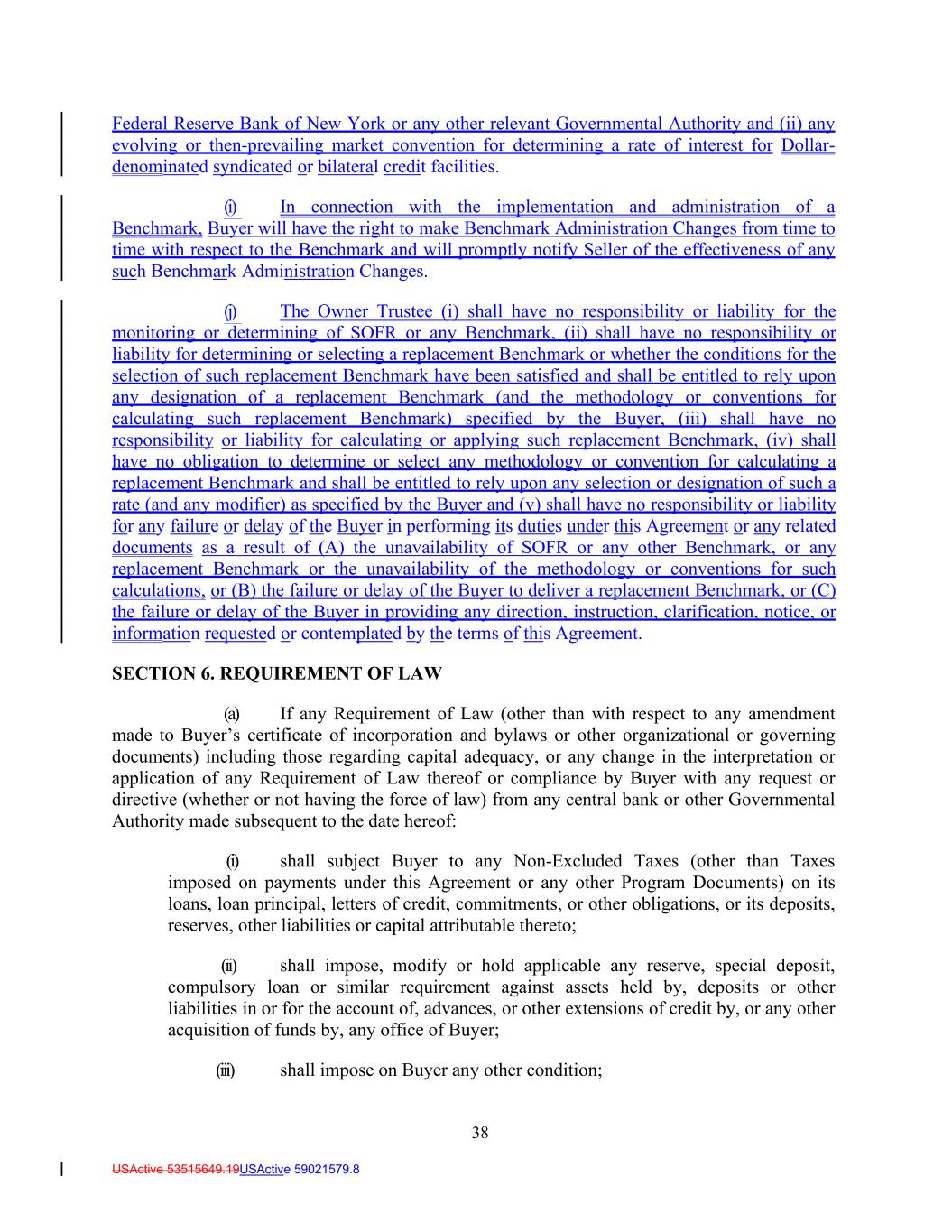 38 USActive 53515649.19USActive 59021579.8 Federal Reserve Bank of New York or any other relevant Governmental Authority and (ii) any evolving or then-prevailing market convention for determining a rate of interest for Dollar- denominated syndicated or bilateral credit facilities. (i) In connection with the implementation and administration of a Benchmark, Buyer will have the right to make Benchmark Administration Changes from time to time with respect to the Benchmark and will promptly notify Seller of the effectiveness of any such Benchmark Administration Changes. (j) The Owner Trustee (i) shall have no responsibility or liability for the monitoring or determining of SOFR or any Benchmark, (ii) shall have no responsibility or liability for determining or selecting a replacement Benchmark or whether the conditions for the selection of such replacement Benchmark have been satisfied and shall be entitled to rely upon any designation of a replacement Benchmark (and the methodology or conventions for calculating such replacement Benchmark) specified by the Buyer, (iii) shall have no responsibility or liability for calculating or applying such replacement Benchmark, (iv) shall have no obligation to determine or select any methodology or convention for calculating a replacement Benchmark and shall be entitled to rely upon any selection or designation of such a rate (and any modifier) as specified by the Buyer and (v) shall have no responsibility or liability for any failure or delay of the Buyer in performing its duties under this Agreement or any related documents as a result of (A) the unavailability of SOFR or any other Benchmark, or any replacement Benchmark or the unavailability of the methodology or conventions for such calculations, or (B) the failure or delay of the Buyer to deliver a replacement Benchmark, or (C) the failure or delay of the Buyer in providing any direction, instruction, clarification, notice, or information requested or contemplated by the terms of this Agreement. SECTION 6. REQUIREMENT OF LAW (a) If any Requirement of Law (other than with respect to any amendment made to Buyer’s certificate of incorporation and bylaws or other organizational or governing documents) including those regarding capital adequacy, or any change in the interpretation or application of any Requirement of Law thereof or compliance by Buyer with any request or directive (whether or not having the force of law) from any central bank or other Governmental Authority made subsequent to the date hereof: (i) shall subject Buyer to any Non-Excluded Taxes (other than Taxes imposed on payments under this Agreement or any other Program Documents) on its loans, loan principal, letters of credit, commitments, or other obligations, or its deposits, reserves, other liabilities or capital attributable thereto; (ii) shall impose, modify or hold applicable any reserve, special deposit, compulsory loan or similar requirement against assets held by, deposits or other liabilities in or for the account of, advances, or other extensions of credit by, or any other acquisition of funds by, any office of Buyer; (iii) shall impose on Buyer any other condition;