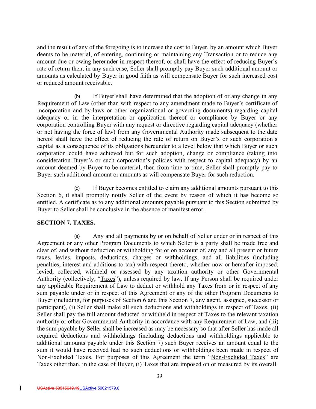 39 USActive 53515649.19USActive 59021579.8 and the result of any of the foregoing is to increase the cost to Buyer, by an amount which Buyer deems to be material, of entering, continuing or maintaining any Transaction or to reduce any amount due or owing hereunder in respect thereof, or shall have the effect of reducing Buyer’s rate of return then, in any such case, Seller shall promptly pay Buyer such additional amount or amounts as calculated by Buyer in good faith as will compensate Buyer for such increased cost or reduced amount receivable. (b) If Buyer shall have determined that the adoption of or any change in any Requirement of Law (other than with respect to any amendment made to Buyer’s certificate of incorporation and by-laws or other organizational or governing documents) regarding capital adequacy or in the interpretation or application thereof or compliance by Buyer or any corporation controlling Buyer with any request or directive regarding capital adequacy (whether or not having the force of law) from any Governmental Authority made subsequent to the date hereof shall have the effect of reducing the rate of return on Buyer’s or such corporation’s capital as a consequence of its obligations hereunder to a level below that which Buyer or such corporation could have achieved but for such adoption, change or compliance (taking into consideration Buyer’s or such corporation’s policies with respect to capital adequacy) by an amount deemed by Buyer to be material, then from time to time, Seller shall promptly pay to Buyer such additional amount or amounts as will compensate Buyer for such reduction. (c) If Buyer becomes entitled to claim any additional amounts pursuant to this Section 6, it shall promptly notify Seller of the event by reason of which it has become so entitled. A certificate as to any additional amounts payable pursuant to this Section submitted by Buyer to Seller shall be conclusive in the absence of manifest error. SECTION 7. TAXES. (a) Any and all payments by or on behalf of Seller under or in respect of this Agreement or any other Program Documents to which Seller is a party shall be made free and clear of, and without deduction or withholding for or on account of, any and all present or future taxes, levies, imposts, deductions, charges or withholdings, and all liabilities (including penalties, interest and additions to tax) with respect thereto, whether now or hereafter imposed, levied, collected, withheld or assessed by any taxation authority or other Governmental Authority (collectively, “Taxes”), unless required by law. If any Person shall be required under any applicable Requirement of Law to deduct or withhold any Taxes from or in respect of any sum payable under or in respect of this Agreement or any of the other Program Documents to Buyer (including, for purposes of Section 6 and this Section 7, any agent, assignee, successor or participant), (i) Seller shall make all such deductions and withholdings in respect of Taxes, (ii) Seller shall pay the full amount deducted or withheld in respect of Taxes to the relevant taxation authority or other Governmental Authority in accordance with any Requirement of Law, and (iii) the sum payable by Seller shall be increased as may be necessary so that after Seller has made all required deductions and withholdings (including deductions and withholdings applicable to additional amounts payable under this Section 7) such Buyer receives an amount equal to the sum it would have received had no such deductions or withholdings been made in respect of Non-Excluded Taxes. For purposes of this Agreement the term “Non-Excluded Taxes” are Taxes other than, in the case of Buyer, (i) Taxes that are imposed on or measured by its overall