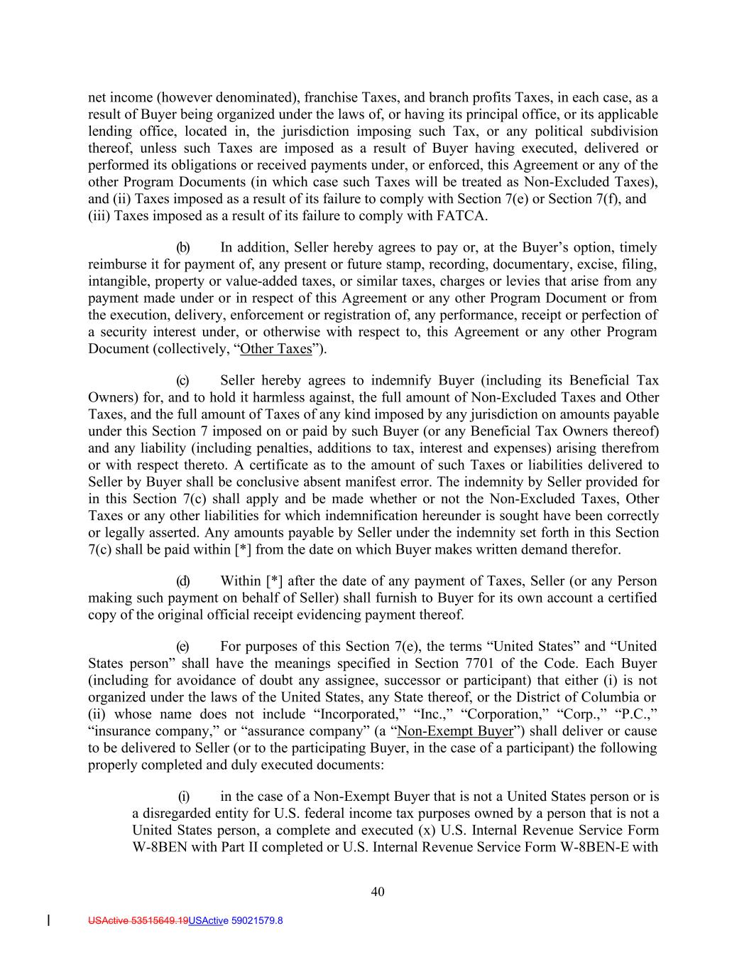 40 USActive 53515649.19USActive 59021579.8 net income (however denominated), franchise Taxes, and branch profits Taxes, in each case, as a result of Buyer being organized under the laws of, or having its principal office, or its applicable lending office, located in, the jurisdiction imposing such Tax, or any political subdivision thereof, unless such Taxes are imposed as a result of Buyer having executed, delivered or performed its obligations or received payments under, or enforced, this Agreement or any of the other Program Documents (in which case such Taxes will be treated as Non-Excluded Taxes), and (ii) Taxes imposed as a result of its failure to comply with Section 7(e) or Section 7(f), and (iii) Taxes imposed as a result of its failure to comply with FATCA. (b) In addition, Seller hereby agrees to pay or, at the Buyer’s option, timely reimburse it for payment of, any present or future stamp, recording, documentary, excise, filing, intangible, property or value-added taxes, or similar taxes, charges or levies that arise from any payment made under or in respect of this Agreement or any other Program Document or from the execution, delivery, enforcement or registration of, any performance, receipt or perfection of a security interest under, or otherwise with respect to, this Agreement or any other Program Document (collectively, “Other Taxes”). (c) Seller hereby agrees to indemnify Buyer (including its Beneficial Tax Owners) for, and to hold it harmless against, the full amount of Non-Excluded Taxes and Other Taxes, and the full amount of Taxes of any kind imposed by any jurisdiction on amounts payable under this Section 7 imposed on or paid by such Buyer (or any Beneficial Tax Owners thereof) and any liability (including penalties, additions to tax, interest and expenses) arising therefrom or with respect thereto. A certificate as to the amount of such Taxes or liabilities delivered to Seller by Buyer shall be conclusive absent manifest error. The indemnity by Seller provided for in this Section 7(c) shall apply and be made whether or not the Non-Excluded Taxes, Other Taxes or any other liabilities for which indemnification hereunder is sought have been correctly or legally asserted. Any amounts payable by Seller under the indemnity set forth in this Section 7(c) shall be paid within [*] from the date on which Buyer makes written demand therefor. (d) Within [*] after the date of any payment of Taxes, Seller (or any Person making such payment on behalf of Seller) shall furnish to Buyer for its own account a certified copy of the original official receipt evidencing payment thereof. (e) For purposes of this Section 7(e), the terms “United States” and “United States person” shall have the meanings specified in Section 7701 of the Code. Each Buyer (including for avoidance of doubt any assignee, successor or participant) that either (i) is not organized under the laws of the United States, any State thereof, or the District of Columbia or (ii) whose name does not include “Incorporated,” “Inc.,” “Corporation,” “Corp.,” “P.C.,” “insurance company,” or “assurance company” (a “Non-Exempt Buyer”) shall deliver or cause to be delivered to Seller (or to the participating Buyer, in the case of a participant) the following properly completed and duly executed documents: (i) in the case of a Non-Exempt Buyer that is not a United States person or is a disregarded entity for U.S. federal income tax purposes owned by a person that is not a United States person, a complete and executed (x) U.S. Internal Revenue Service Form W-8BEN with Part II completed or U.S. Internal Revenue Service Form W-8BEN-E with