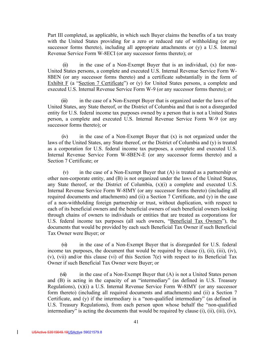 41 USActive 53515649.19USActive 59021579.8 Part III completed, as applicable, in which such Buyer claims the benefits of a tax treaty with the United States providing for a zero or reduced rate of withholding (or any successor forms thereto), including all appropriate attachments or (y) a U.S. Internal Revenue Service Form W-8ECI (or any successor forms thereto); or (ii) in the case of a Non-Exempt Buyer that is an individual, (x) for non- United States persons, a complete and executed U.S. Internal Revenue Service Form W- 8BEN (or any successor forms thereto) and a certificate substantially in the form of Exhibit F (a “Section 7 Certificate”) or (y) for United States persons, a complete and executed U.S. Internal Revenue Service Form W-9 (or any successor forms thereto); or (iii) in the case of a Non-Exempt Buyer that is organized under the laws of the United States, any State thereof, or the District of Columbia and that is not a disregarded entity for U.S. federal income tax purposes owned by a person that is not a United States person, a complete and executed U.S. Internal Revenue Service Form W-9 (or any successor forms thereto); or (iv) in the case of a Non-Exempt Buyer that (x) is not organized under the laws of the United States, any State thereof, or the District of Columbia and (y) is treated as a corporation for U.S. federal income tax purposes, a complete and executed U.S. Internal Revenue Service Form W-8BEN-E (or any successor forms thereto) and a Section 7 Certificate; or (v) in the case of a Non-Exempt Buyer that (A) is treated as a partnership or other non-corporate entity, and (B) is not organized under the laws of the United States, any State thereof, or the District of Columbia, (x)(i) a complete and executed U.S. Internal Revenue Service Form W-8IMY (or any successor forms thereto) (including all required documents and attachments) and (ii) a Section 7 Certificate, and (y) in the case of a non-withholding foreign partnership or trust, without duplication, with respect to each of its beneficial owners and the beneficial owners of such beneficial owners looking through chains of owners to individuals or entities that are treated as corporations for U.S. federal income tax purposes (all such owners, “Beneficial Tax Owners”), the documents that would be provided by each such Beneficial Tax Owner if such Beneficial Tax Owner were Buyer; or (vi) in the case of a Non-Exempt Buyer that is disregarded for U.S. federal income tax purposes, the document that would be required by clause (i), (ii), (iii), (iv), (v), (vii) and/or this clause (vi) of this Section 7(e) with respect to its Beneficial Tax Owner if such Beneficial Tax Owner were Buyer; or (vii) in the case of a Non-Exempt Buyer that (A) is not a United States person and (B) is acting in the capacity of an “intermediary” (as defined in U.S. Treasury Regulations), (x)(i) a U.S. Internal Revenue Service Form W-8IMY (or any successor form thereto) (including all required documents and attachments) and (ii) a Section 7 Certificate, and (y) if the intermediary is a “non-qualified intermediary” (as defined in U.S. Treasury Regulations), from each person upon whose behalf the “non-qualified intermediary” is acting the documents that would be required by clause (i), (ii), (iii), (iv),