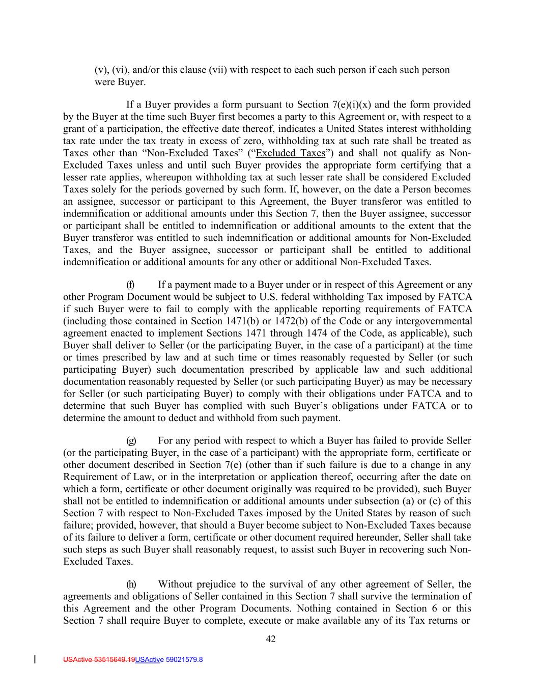 42 USActive 53515649.19USActive 59021579.8 (v), (vi), and/or this clause (vii) with respect to each such person if each such person were Buyer. If a Buyer provides a form pursuant to Section 7(e)(i)(x) and the form provided by the Buyer at the time such Buyer first becomes a party to this Agreement or, with respect to a grant of a participation, the effective date thereof, indicates a United States interest withholding tax rate under the tax treaty in excess of zero, withholding tax at such rate shall be treated as Taxes other than “Non-Excluded Taxes” (“Excluded Taxes”) and shall not qualify as Non- Excluded Taxes unless and until such Buyer provides the appropriate form certifying that a lesser rate applies, whereupon withholding tax at such lesser rate shall be considered Excluded Taxes solely for the periods governed by such form. If, however, on the date a Person becomes an assignee, successor or participant to this Agreement, the Buyer transferor was entitled to indemnification or additional amounts under this Section 7, then the Buyer assignee, successor or participant shall be entitled to indemnification or additional amounts to the extent that the Buyer transferor was entitled to such indemnification or additional amounts for Non-Excluded Taxes, and the Buyer assignee, successor or participant shall be entitled to additional indemnification or additional amounts for any other or additional Non-Excluded Taxes. (f) If a payment made to a Buyer under or in respect of this Agreement or any other Program Document would be subject to U.S. federal withholding Tax imposed by FATCA if such Buyer were to fail to comply with the applicable reporting requirements of FATCA (including those contained in Section 1471(b) or 1472(b) of the Code or any intergovernmental agreement enacted to implement Sections 1471 through 1474 of the Code, as applicable), such Buyer shall deliver to Seller (or the participating Buyer, in the case of a participant) at the time or times prescribed by law and at such time or times reasonably requested by Seller (or such participating Buyer) such documentation prescribed by applicable law and such additional documentation reasonably requested by Seller (or such participating Buyer) as may be necessary for Seller (or such participating Buyer) to comply with their obligations under FATCA and to determine that such Buyer has complied with such Buyer’s obligations under FATCA or to determine the amount to deduct and withhold from such payment. (g) For any period with respect to which a Buyer has failed to provide Seller (or the participating Buyer, in the case of a participant) with the appropriate form, certificate or other document described in Section 7(e) (other than if such failure is due to a change in any Requirement of Law, or in the interpretation or application thereof, occurring after the date on which a form, certificate or other document originally was required to be provided), such Buyer shall not be entitled to indemnification or additional amounts under subsection (a) or (c) of this Section 7 with respect to Non-Excluded Taxes imposed by the United States by reason of such failure; provided, however, that should a Buyer become subject to Non-Excluded Taxes because of its failure to deliver a form, certificate or other document required hereunder, Seller shall take such steps as such Buyer shall reasonably request, to assist such Buyer in recovering such Non- Excluded Taxes. (h) Without prejudice to the survival of any other agreement of Seller, the agreements and obligations of Seller contained in this Section 7 shall survive the termination of this Agreement and the other Program Documents. Nothing contained in Section 6 or this Section 7 shall require Buyer to complete, execute or make available any of its Tax returns or