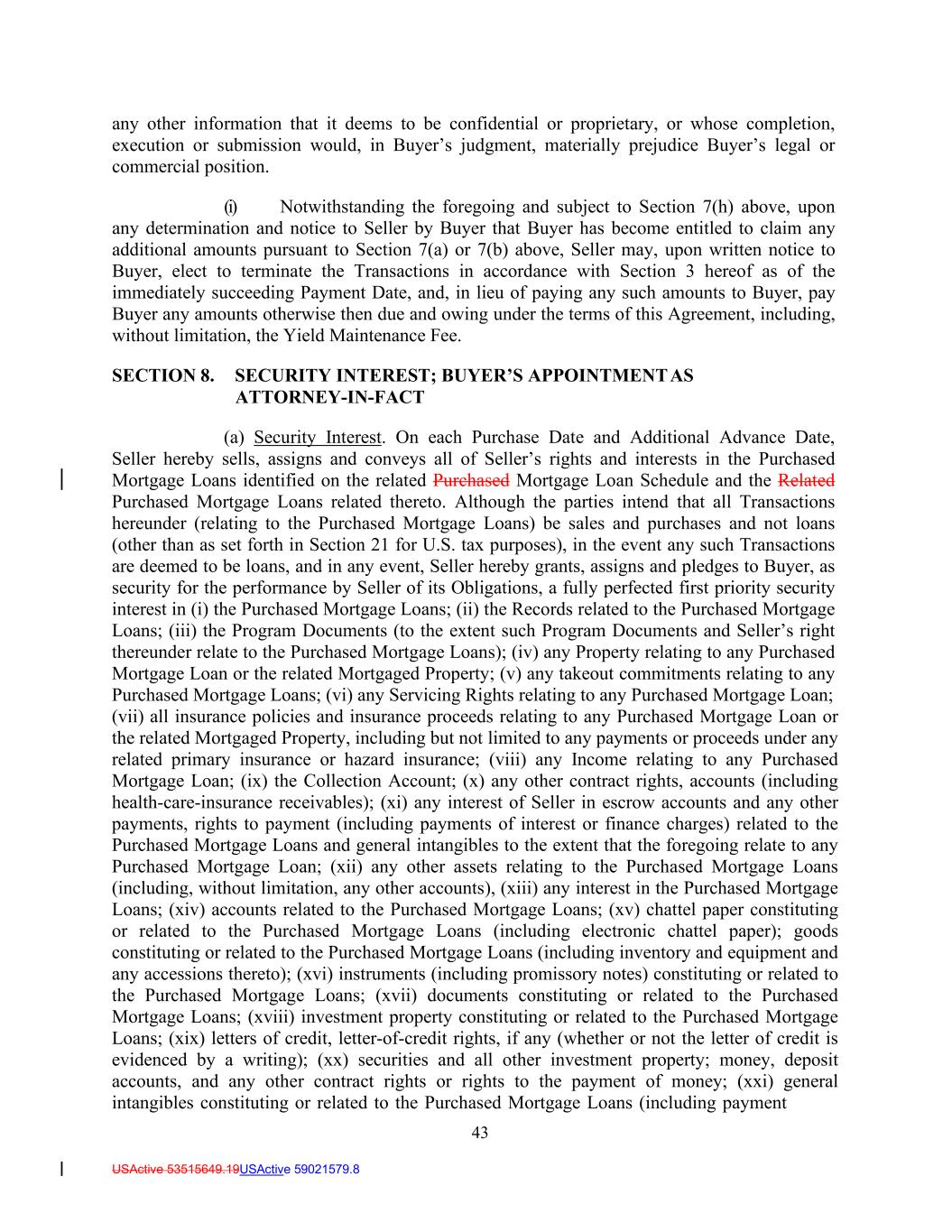 43 USActive 53515649.19USActive 59021579.8 any other information that it deems to be confidential or proprietary, or whose completion, execution or submission would, in Buyer’s judgment, materially prejudice Buyer’s legal or commercial position. (i) Notwithstanding the foregoing and subject to Section 7(h) above, upon any determination and notice to Seller by Buyer that Buyer has become entitled to claim any additional amounts pursuant to Section 7(a) or 7(b) above, Seller may, upon written notice to Buyer, elect to terminate the Transactions in accordance with Section 3 hereof as of the immediately succeeding Payment Date, and, in lieu of paying any such amounts to Buyer, pay Buyer any amounts otherwise then due and owing under the terms of this Agreement, including, without limitation, the Yield Maintenance Fee. SECTION 8. SECURITY INTEREST; BUYER’S APPOINTMENT AS ATTORNEY-IN-FACT (a) Security Interest. On each Purchase Date and Additional Advance Date, Seller hereby sells, assigns and conveys all of Seller’s rights and interests in the Purchased Mortgage Loans identified on the related Purchased Mortgage Loan Schedule and the Related Purchased Mortgage Loans related thereto. Although the parties intend that all Transactions hereunder (relating to the Purchased Mortgage Loans) be sales and purchases and not loans (other than as set forth in Section 21 for U.S. tax purposes), in the event any such Transactions are deemed to be loans, and in any event, Seller hereby grants, assigns and pledges to Buyer, as security for the performance by Seller of its Obligations, a fully perfected first priority security interest in (i) the Purchased Mortgage Loans; (ii) the Records related to the Purchased Mortgage Loans; (iii) the Program Documents (to the extent such Program Documents and Seller’s right thereunder relate to the Purchased Mortgage Loans); (iv) any Property relating to any Purchased Mortgage Loan or the related Mortgaged Property; (v) any takeout commitments relating to any Purchased Mortgage Loans; (vi) any Servicing Rights relating to any Purchased Mortgage Loan; (vii) all insurance policies and insurance proceeds relating to any Purchased Mortgage Loan or the related Mortgaged Property, including but not limited to any payments or proceeds under any related primary insurance or hazard insurance; (viii) any Income relating to any Purchased Mortgage Loan; (ix) the Collection Account; (x) any other contract rights, accounts (including health-care-insurance receivables); (xi) any interest of Seller in escrow accounts and any other payments, rights to payment (including payments of interest or finance charges) related to the Purchased Mortgage Loans and general intangibles to the extent that the foregoing relate to any Purchased Mortgage Loan; (xii) any other assets relating to the Purchased Mortgage Loans (including, without limitation, any other accounts), (xiii) any interest in the Purchased Mortgage Loans; (xiv) accounts related to the Purchased Mortgage Loans; (xv) chattel paper constituting or related to the Purchased Mortgage Loans (including electronic chattel paper); goods constituting or related to the Purchased Mortgage Loans (including inventory and equipment and any accessions thereto); (xvi) instruments (including promissory notes) constituting or related to the Purchased Mortgage Loans; (xvii) documents constituting or related to the Purchased Mortgage Loans; (xviii) investment property constituting or related to the Purchased Mortgage Loans; (xix) letters of credit, letter-of-credit rights, if any (whether or not the letter of credit is evidenced by a writing); (xx) securities and all other investment property; money, deposit accounts, and any other contract rights or rights to the payment of money; (xxi) general intangibles constituting or related to the Purchased Mortgage Loans (including payment