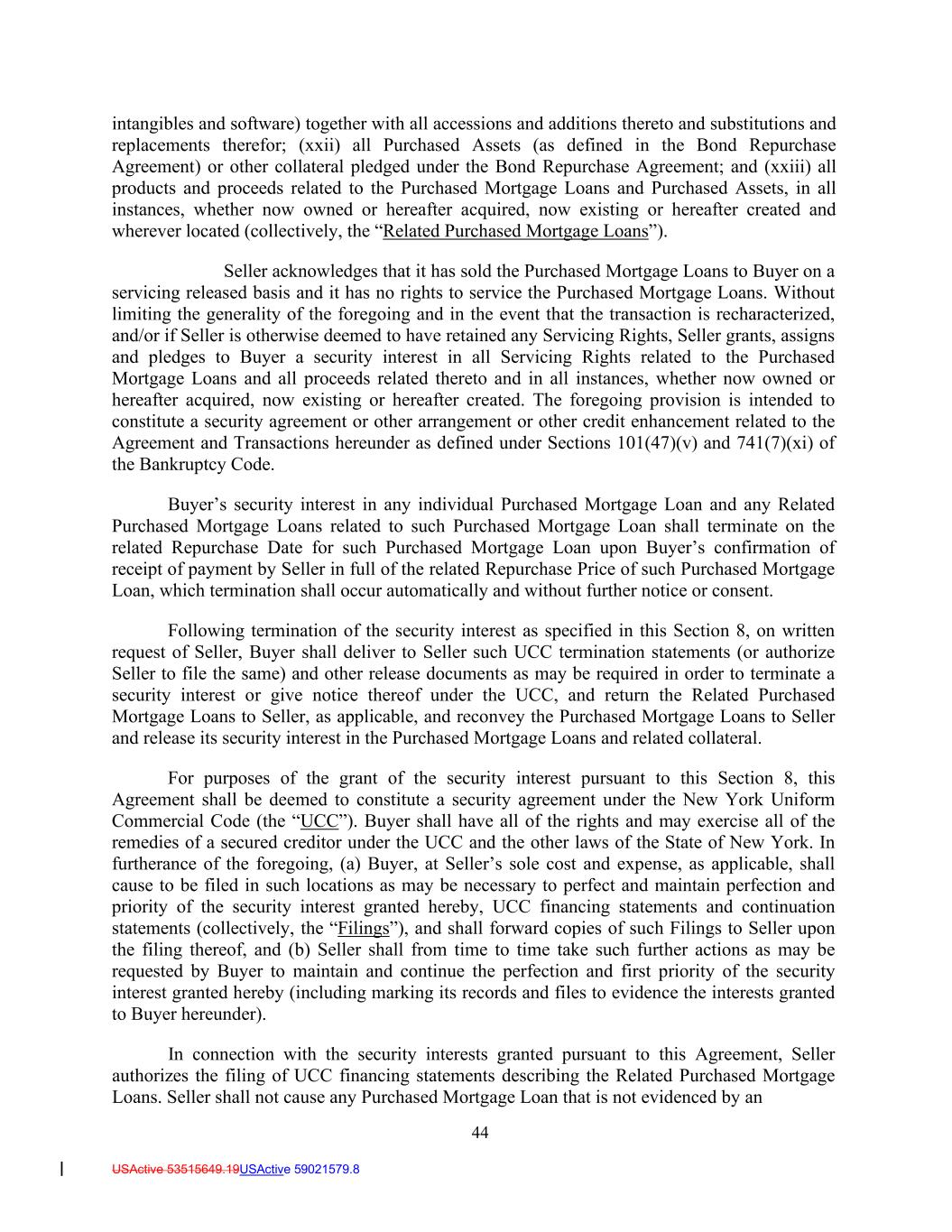 44 USActive 53515649.19USActive 59021579.8 intangibles and software) together with all accessions and additions thereto and substitutions and replacements therefor; (xxii) all Purchased Assets (as defined in the Bond Repurchase Agreement) or other collateral pledged under the Bond Repurchase Agreement; and (xxiii) all products and proceeds related to the Purchased Mortgage Loans and Purchased Assets, in all instances, whether now owned or hereafter acquired, now existing or hereafter created and wherever located (collectively, the “Related Purchased Mortgage Loans”). Seller acknowledges that it has sold the Purchased Mortgage Loans to Buyer on a servicing released basis and it has no rights to service the Purchased Mortgage Loans. Without limiting the generality of the foregoing and in the event that the transaction is recharacterized, and/or if Seller is otherwise deemed to have retained any Servicing Rights, Seller grants, assigns and pledges to Buyer a security interest in all Servicing Rights related to the Purchased Mortgage Loans and all proceeds related thereto and in all instances, whether now owned or hereafter acquired, now existing or hereafter created. The foregoing provision is intended to constitute a security agreement or other arrangement or other credit enhancement related to the Agreement and Transactions hereunder as defined under Sections 101(47)(v) and 741(7)(xi) of the Bankruptcy Code. Buyer’s security interest in any individual Purchased Mortgage Loan and any Related Purchased Mortgage Loans related to such Purchased Mortgage Loan shall terminate on the related Repurchase Date for such Purchased Mortgage Loan upon Buyer’s confirmation of receipt of payment by Seller in full of the related Repurchase Price of such Purchased Mortgage Loan, which termination shall occur automatically and without further notice or consent. Following termination of the security interest as specified in this Section 8, on written request of Seller, Buyer shall deliver to Seller such UCC termination statements (or authorize Seller to file the same) and other release documents as may be required in order to terminate a security interest or give notice thereof under the UCC, and return the Related Purchased Mortgage Loans to Seller, as applicable, and reconvey the Purchased Mortgage Loans to Seller and release its security interest in the Purchased Mortgage Loans and related collateral. For purposes of the grant of the security interest pursuant to this Section 8, this Agreement shall be deemed to constitute a security agreement under the New York Uniform Commercial Code (the “UCC”). Buyer shall have all of the rights and may exercise all of the remedies of a secured creditor under the UCC and the other laws of the State of New York. In furtherance of the foregoing, (a) Buyer, at Seller’s sole cost and expense, as applicable, shall cause to be filed in such locations as may be necessary to perfect and maintain perfection and priority of the security interest granted hereby, UCC financing statements and continuation statements (collectively, the “Filings”), and shall forward copies of such Filings to Seller upon the filing thereof, and (b) Seller shall from time to time take such further actions as may be requested by Buyer to maintain and continue the perfection and first priority of the security interest granted hereby (including marking its records and files to evidence the interests granted to Buyer hereunder). In connection with the security interests granted pursuant to this Agreement, Seller authorizes the filing of UCC financing statements describing the Related Purchased Mortgage Loans. Seller shall not cause any Purchased Mortgage Loan that is not evidenced by an
