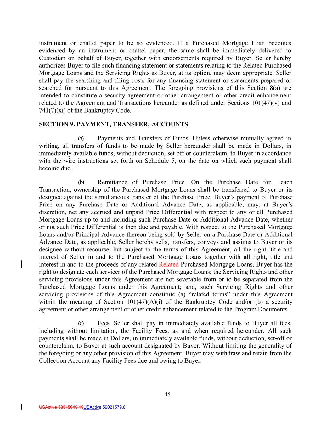 45 USActive 53515649.19USActive 59021579.8 instrument or chattel paper to be so evidenced. If a Purchased Mortgage Loan becomes evidenced by an instrument or chattel paper, the same shall be immediately delivered to Custodian on behalf of Buyer, together with endorsements required by Buyer. Seller hereby authorizes Buyer to file such financing statement or statements relating to the Related Purchased Mortgage Loans and the Servicing Rights as Buyer, at its option, may deem appropriate. Seller shall pay the searching and filing costs for any financing statement or statements prepared or searched for pursuant to this Agreement. The foregoing provisions of this Section 8(a) are intended to constitute a security agreement or other arrangement or other credit enhancement related to the Agreement and Transactions hereunder as defined under Sections 101(47)(v) and 741(7)(xi) of the Bankruptcy Code. SECTION 9. PAYMENT, TRANSFER; ACCOUNTS (a) Payments and Transfers of Funds. Unless otherwise mutually agreed in writing, all transfers of funds to be made by Seller hereunder shall be made in Dollars, in immediately available funds, without deduction, set off or counterclaim, to Buyer in accordance with the wire instructions set forth on Schedule 5, on the date on which such payment shall become due. (b) Remittance of Purchase Price. On the Purchase Date for each Transaction, ownership of the Purchased Mortgage Loans shall be transferred to Buyer or its designee against the simultaneous transfer of the Purchase Price. Buyer’s payment of Purchase Price on any Purchase Date or Additional Advance Date, as applicable, may, at Buyer’s discretion, net any accrued and unpaid Price Differential with respect to any or all Purchased Mortgage Loans up to and including such Purchase Date or Additional Advance Date, whether or not such Price Differential is then due and payable. With respect to the Purchased Mortgage Loans and/or Principal Advance thereon being sold by Seller on a Purchase Date or Additional Advance Date, as applicable, Seller hereby sells, transfers, conveys and assigns to Buyer or its designee without recourse, but subject to the terms of this Agreement, all the right, title and interest of Seller in and to the Purchased Mortgage Loans together with all right, title and interest in and to the proceeds of any related Related Purchased Mortgage Loans. Buyer has the right to designate each servicer of the Purchased Mortgage Loans; the Servicing Rights and other servicing provisions under this Agreement are not severable from or to be separated from the Purchased Mortgage Loans under this Agreement; and, such Servicing Rights and other servicing provisions of this Agreement constitute (a) “related terms” under this Agreement within the meaning of Section 101(47)(A)(i) of the Bankruptcy Code and/or (b) a security agreement or other arrangement or other credit enhancement related to the Program Documents. (c) Fees. Seller shall pay in immediately available funds to Buyer all fees, including without limitation, the Facility Fees, as and when required hereunder. All such payments shall be made in Dollars, in immediately available funds, without deduction, set-off or counterclaim, to Buyer at such account designated by Buyer. Without limiting the generality of the foregoing or any other provision of this Agreement, Buyer may withdraw and retain from the Collection Account any Facility Fees due and owing to Buyer.