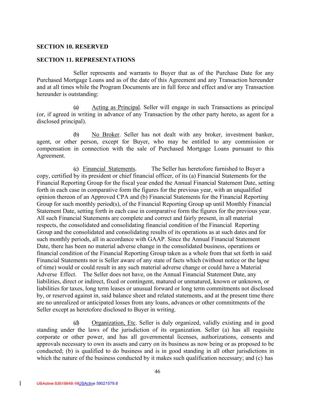 46 USActive 53515649.19USActive 59021579.8 SECTION 10. RESERVED SECTION 11. REPRESENTATIONS Seller represents and warrants to Buyer that as of the Purchase Date for any Purchased Mortgage Loans and as of the date of this Agreement and any Transaction hereunder and at all times while the Program Documents are in full force and effect and/or any Transaction hereunder is outstanding: (a) Acting as Principal. Seller will engage in such Transactions as principal (or, if agreed in writing in advance of any Transaction by the other party hereto, as agent for a disclosed principal). (b) No Broker. Seller has not dealt with any broker, investment banker, agent, or other person, except for Buyer, who may be entitled to any commission or compensation in connection with the sale of Purchased Mortgage Loans pursuant to this Agreement. (c) Financial Statements. The Seller has heretofore furnished to Buyer a copy, certified by its president or chief financial officer, of its (a) Financial Statements for the Financial Reporting Group for the fiscal year ended the Annual Financial Statement Date, setting forth in each case in comparative form the figures for the previous year, with an unqualified opinion thereon of an Approved CPA and (b) Financial Statements for the Financial Reporting Group for such monthly period(s), of the Financial Reporting Group up until Monthly Financial Statement Date, setting forth in each case in comparative form the figures for the previous year. All such Financial Statements are complete and correct and fairly present, in all material respects, the consolidated and consolidating financial condition of the Financial Reporting Group and the consolidated and consolidating results of its operations as at such dates and for such monthly periods, all in accordance with GAAP. Since the Annual Financial Statement Date, there has been no material adverse change in the consolidated business, operations or financial condition of the Financial Reporting Group taken as a whole from that set forth in said Financial Statements nor is Seller aware of any state of facts which (without notice or the lapse of time) would or could result in any such material adverse change or could have a Material Adverse Effect. The Seller does not have, on the Annual Financial Statement Date, any liabilities, direct or indirect, fixed or contingent, matured or unmatured, known or unknown, or liabilities for taxes, long term leases or unusual forward or long term commitments not disclosed by, or reserved against in, said balance sheet and related statements, and at the present time there are no unrealized or anticipated losses from any loans, advances or other commitments of the Seller except as heretofore disclosed to Buyer in writing. (d) Organization, Etc. Seller is duly organized, validly existing and in good standing under the laws of the jurisdiction of its organization. Seller (a) has all requisite corporate or other power, and has all governmental licenses, authorizations, consents and approvals necessary to own its assets and carry on its business as now being or as proposed to be conducted; (b) is qualified to do business and is in good standing in all other jurisdictions in which the nature of the business conducted by it makes such qualification necessary; and (c) has