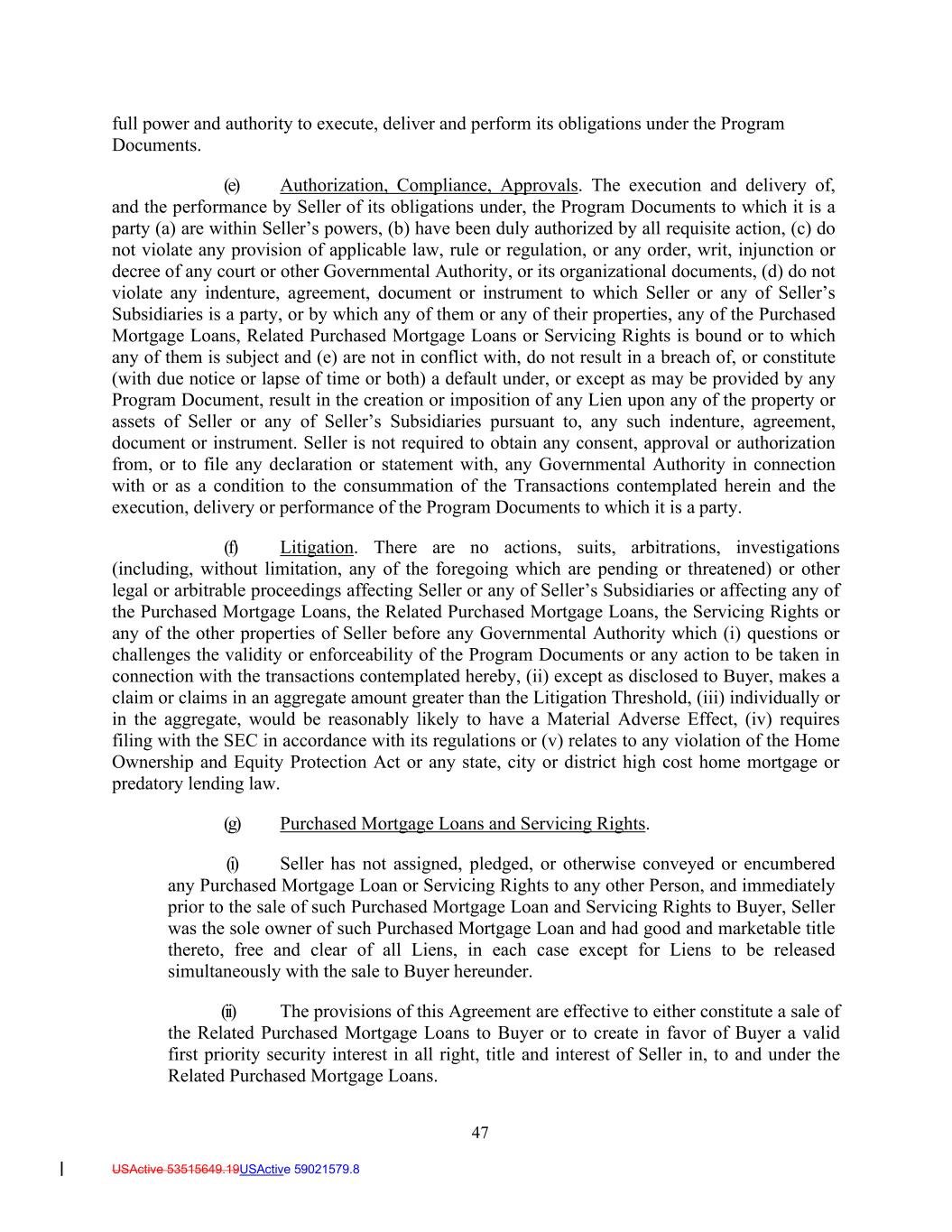 47 USActive 53515649.19USActive 59021579.8 full power and authority to execute, deliver and perform its obligations under the Program Documents. (e) Authorization, Compliance, Approvals. The execution and delivery of, and the performance by Seller of its obligations under, the Program Documents to which it is a party (a) are within Seller’s powers, (b) have been duly authorized by all requisite action, (c) do not violate any provision of applicable law, rule or regulation, or any order, writ, injunction or decree of any court or other Governmental Authority, or its organizational documents, (d) do not violate any indenture, agreement, document or instrument to which Seller or any of Seller’s Subsidiaries is a party, or by which any of them or any of their properties, any of the Purchased Mortgage Loans, Related Purchased Mortgage Loans or Servicing Rights is bound or to which any of them is subject and (e) are not in conflict with, do not result in a breach of, or constitute (with due notice or lapse of time or both) a default under, or except as may be provided by any Program Document, result in the creation or imposition of any Lien upon any of the property or assets of Seller or any of Seller’s Subsidiaries pursuant to, any such indenture, agreement, document or instrument. Seller is not required to obtain any consent, approval or authorization from, or to file any declaration or statement with, any Governmental Authority in connection with or as a condition to the consummation of the Transactions contemplated herein and the execution, delivery or performance of the Program Documents to which it is a party. (f) Litigation. There are no actions, suits, arbitrations, investigations (including, without limitation, any of the foregoing which are pending or threatened) or other legal or arbitrable proceedings affecting Seller or any of Seller’s Subsidiaries or affecting any of the Purchased Mortgage Loans, the Related Purchased Mortgage Loans, the Servicing Rights or any of the other properties of Seller before any Governmental Authority which (i) questions or challenges the validity or enforceability of the Program Documents or any action to be taken in connection with the transactions contemplated hereby, (ii) except as disclosed to Buyer, makes a claim or claims in an aggregate amount greater than the Litigation Threshold, (iii) individually or in the aggregate, would be reasonably likely to have a Material Adverse Effect, (iv) requires filing with the SEC in accordance with its regulations or (v) relates to any violation of the Home Ownership and Equity Protection Act or any state, city or district high cost home mortgage or predatory lending law. (g) Purchased Mortgage Loans and Servicing Rights. (i) Seller has not assigned, pledged, or otherwise conveyed or encumbered any Purchased Mortgage Loan or Servicing Rights to any other Person, and immediately prior to the sale of such Purchased Mortgage Loan and Servicing Rights to Buyer, Seller was the sole owner of such Purchased Mortgage Loan and had good and marketable title thereto, free and clear of all Liens, in each case except for Liens to be released simultaneously with the sale to Buyer hereunder. (ii) The provisions of this Agreement are effective to either constitute a sale of the Related Purchased Mortgage Loans to Buyer or to create in favor of Buyer a valid first priority security interest in all right, title and interest of Seller in, to and under the Related Purchased Mortgage Loans.
