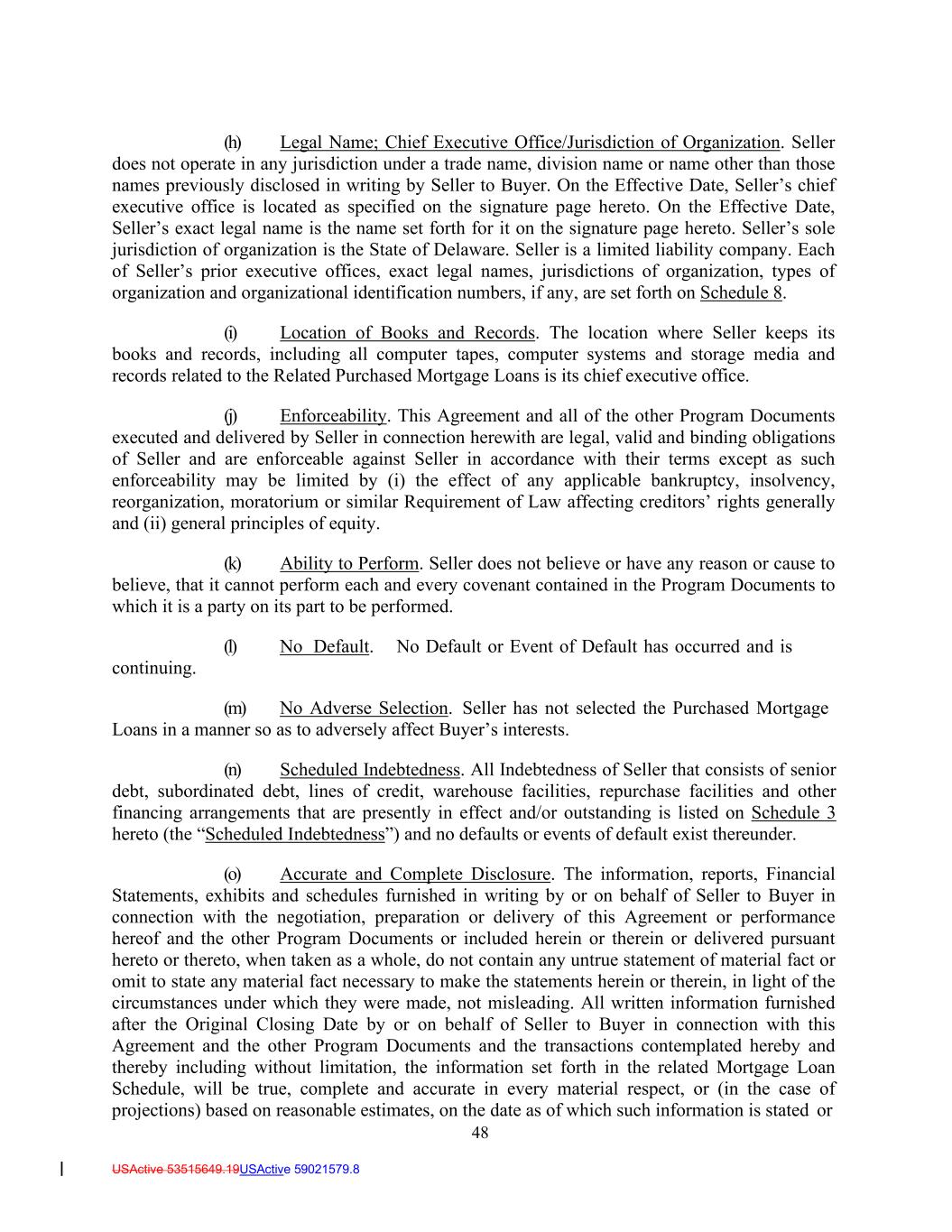 48 USActive 53515649.19USActive 59021579.8 (h) Legal Name; Chief Executive Office/Jurisdiction of Organization. Seller does not operate in any jurisdiction under a trade name, division name or name other than those names previously disclosed in writing by Seller to Buyer. On the Effective Date, Seller’s chief executive office is located as specified on the signature page hereto. On the Effective Date, Seller’s exact legal name is the name set forth for it on the signature page hereto. Seller’s sole jurisdiction of organization is the State of Delaware. Seller is a limited liability company. Each of Seller’s prior executive offices, exact legal names, jurisdictions of organization, types of organization and organizational identification numbers, if any, are set forth on Schedule 8. (i) Location of Books and Records. The location where Seller keeps its books and records, including all computer tapes, computer systems and storage media and records related to the Related Purchased Mortgage Loans is its chief executive office. (j) Enforceability. This Agreement and all of the other Program Documents executed and delivered by Seller in connection herewith are legal, valid and binding obligations of Seller and are enforceable against Seller in accordance with their terms except as such enforceability may be limited by (i) the effect of any applicable bankruptcy, insolvency, reorganization, moratorium or similar Requirement of Law affecting creditors’ rights generally and (ii) general principles of equity. (k) Ability to Perform. Seller does not believe or have any reason or cause to believe, that it cannot perform each and every covenant contained in the Program Documents to which it is a party on its part to be performed. (l) No Default. No Default or Event of Default has occurred and is continuing. (m) No Adverse Selection. Seller has not selected the Purchased Mortgage Loans in a manner so as to adversely affect Buyer’s interests. (n) Scheduled Indebtedness. All Indebtedness of Seller that consists of senior debt, subordinated debt, lines of credit, warehouse facilities, repurchase facilities and other financing arrangements that are presently in effect and/or outstanding is listed on Schedule 3 hereto (the “Scheduled Indebtedness”) and no defaults or events of default exist thereunder. (o) Accurate and Complete Disclosure. The information, reports, Financial Statements, exhibits and schedules furnished in writing by or on behalf of Seller to Buyer in connection with the negotiation, preparation or delivery of this Agreement or performance hereof and the other Program Documents or included herein or therein or delivered pursuant hereto or thereto, when taken as a whole, do not contain any untrue statement of material fact or omit to state any material fact necessary to make the statements herein or therein, in light of the circumstances under which they were made, not misleading. All written information furnished after the Original Closing Date by or on behalf of Seller to Buyer in connection with this Agreement and the other Program Documents and the transactions contemplated hereby and thereby including without limitation, the information set forth in the related Mortgage Loan Schedule, will be true, complete and accurate in every material respect, or (in the case of projections) based on reasonable estimates, on the date as of which such information is stated or