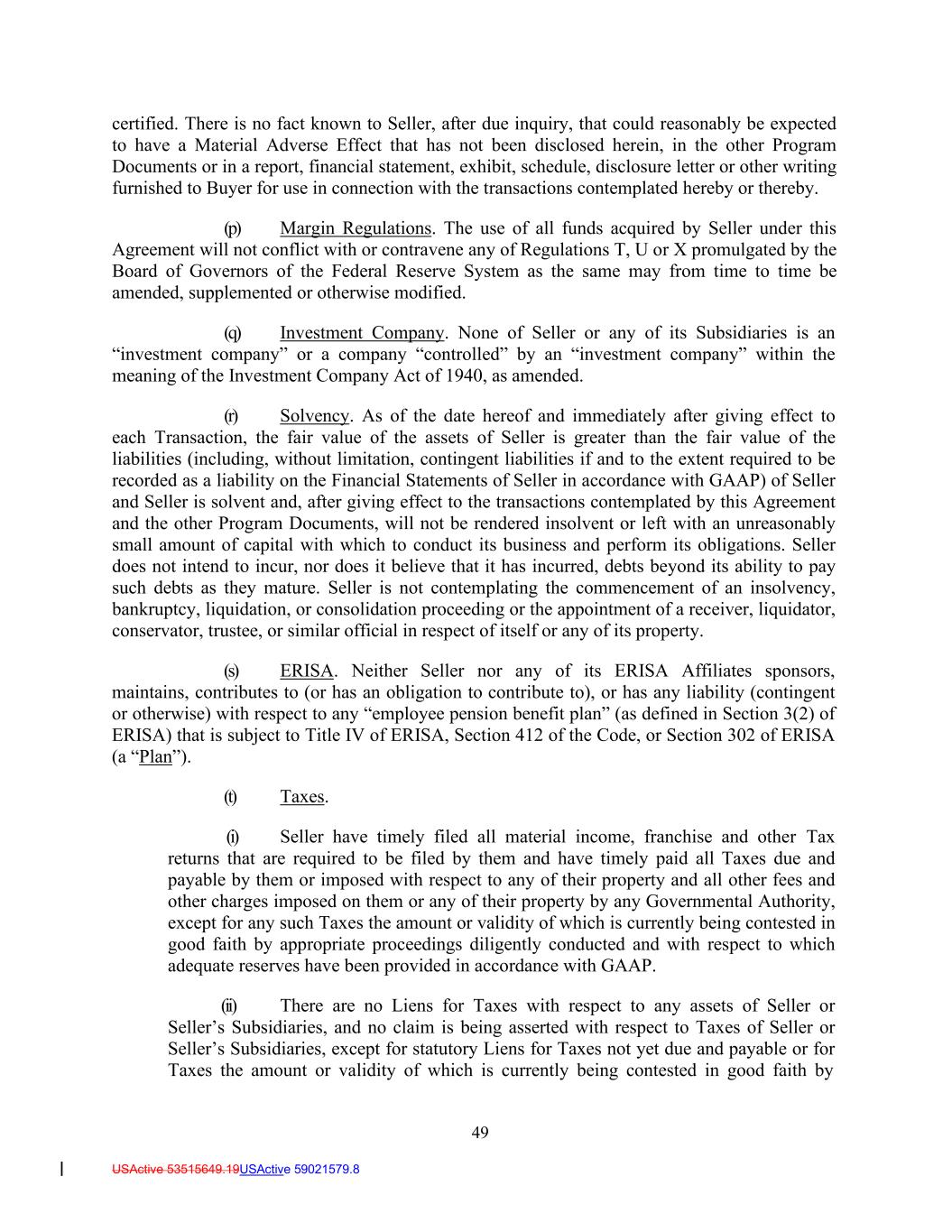 49 USActive 53515649.19USActive 59021579.8 certified. There is no fact known to Seller, after due inquiry, that could reasonably be expected to have a Material Adverse Effect that has not been disclosed herein, in the other Program Documents or in a report, financial statement, exhibit, schedule, disclosure letter or other writing furnished to Buyer for use in connection with the transactions contemplated hereby or thereby. (p) Margin Regulations. The use of all funds acquired by Seller under this Agreement will not conflict with or contravene any of Regulations T, U or X promulgated by the Board of Governors of the Federal Reserve System as the same may from time to time be amended, supplemented or otherwise modified. (q) Investment Company. None of Seller or any of its Subsidiaries is an “investment company” or a company “controlled” by an “investment company” within the meaning of the Investment Company Act of 1940, as amended. (r) Solvency. As of the date hereof and immediately after giving effect to each Transaction, the fair value of the assets of Seller is greater than the fair value of the liabilities (including, without limitation, contingent liabilities if and to the extent required to be recorded as a liability on the Financial Statements of Seller in accordance with GAAP) of Seller and Seller is solvent and, after giving effect to the transactions contemplated by this Agreement and the other Program Documents, will not be rendered insolvent or left with an unreasonably small amount of capital with which to conduct its business and perform its obligations. Seller does not intend to incur, nor does it believe that it has incurred, debts beyond its ability to pay such debts as they mature. Seller is not contemplating the commencement of an insolvency, bankruptcy, liquidation, or consolidation proceeding or the appointment of a receiver, liquidator, conservator, trustee, or similar official in respect of itself or any of its property. (s) ERISA. Neither Seller nor any of its ERISA Affiliates sponsors, maintains, contributes to (or has an obligation to contribute to), or has any liability (contingent or otherwise) with respect to any “employee pension benefit plan” (as defined in Section 3(2) of ERISA) that is subject to Title IV of ERISA, Section 412 of the Code, or Section 302 of ERISA (a “Plan”). (t) Taxes. (i) Seller have timely filed all material income, franchise and other Tax returns that are required to be filed by them and have timely paid all Taxes due and payable by them or imposed with respect to any of their property and all other fees and other charges imposed on them or any of their property by any Governmental Authority, except for any such Taxes the amount or validity of which is currently being contested in good faith by appropriate proceedings diligently conducted and with respect to which adequate reserves have been provided in accordance with GAAP. (ii) There are no Liens for Taxes with respect to any assets of Seller or Seller’s Subsidiaries, and no claim is being asserted with respect to Taxes of Seller or Seller’s Subsidiaries, except for statutory Liens for Taxes not yet due and payable or for Taxes the amount or validity of which is currently being contested in good faith by