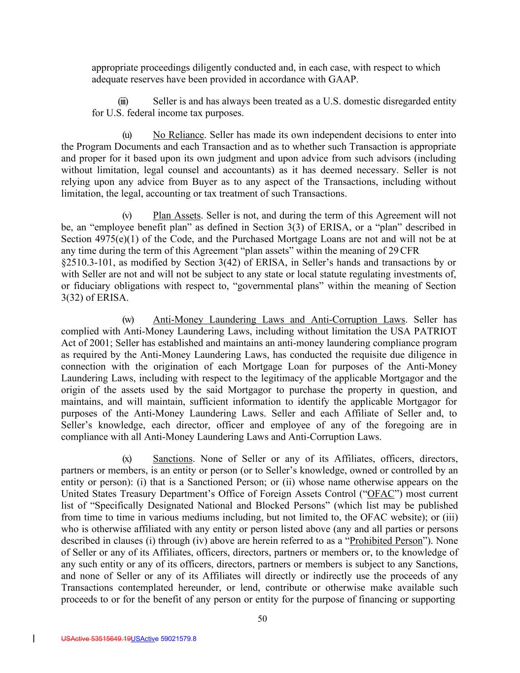 50 USActive 53515649.19USActive 59021579.8 appropriate proceedings diligently conducted and, in each case, with respect to which adequate reserves have been provided in accordance with GAAP. (iii) Seller is and has always been treated as a U.S. domestic disregarded entity for U.S. federal income tax purposes. (u) No Reliance. Seller has made its own independent decisions to enter into the Program Documents and each Transaction and as to whether such Transaction is appropriate and proper for it based upon its own judgment and upon advice from such advisors (including without limitation, legal counsel and accountants) as it has deemed necessary. Seller is not relying upon any advice from Buyer as to any aspect of the Transactions, including without limitation, the legal, accounting or tax treatment of such Transactions. (v) Plan Assets. Seller is not, and during the term of this Agreement will not be, an “employee benefit plan” as defined in Section 3(3) of ERISA, or a “plan” described in Section 4975(e)(1) of the Code, and the Purchased Mortgage Loans are not and will not be at any time during the term of this Agreement “plan assets” within the meaning of 29 CFR §2510.3-101, as modified by Section 3(42) of ERISA, in Seller’s hands and transactions by or with Seller are not and will not be subject to any state or local statute regulating investments of, or fiduciary obligations with respect to, “governmental plans” within the meaning of Section 3(32) of ERISA. (w) Anti-Money Laundering Laws and Anti-Corruption Laws. Seller has complied with Anti-Money Laundering Laws, including without limitation the USA PATRIOT Act of 2001; Seller has established and maintains an anti-money laundering compliance program as required by the Anti-Money Laundering Laws, has conducted the requisite due diligence in connection with the origination of each Mortgage Loan for purposes of the Anti-Money Laundering Laws, including with respect to the legitimacy of the applicable Mortgagor and the origin of the assets used by the said Mortgagor to purchase the property in question, and maintains, and will maintain, sufficient information to identify the applicable Mortgagor for purposes of the Anti-Money Laundering Laws. Seller and each Affiliate of Seller and, to Seller’s knowledge, each director, officer and employee of any of the foregoing are in compliance with all Anti-Money Laundering Laws and Anti-Corruption Laws. (x) Sanctions. None of Seller or any of its Affiliates, officers, directors, partners or members, is an entity or person (or to Seller’s knowledge, owned or controlled by an entity or person): (i) that is a Sanctioned Person; or (ii) whose name otherwise appears on the United States Treasury Department’s Office of Foreign Assets Control (“OFAC”) most current list of “Specifically Designated National and Blocked Persons” (which list may be published from time to time in various mediums including, but not limited to, the OFAC website); or (iii) who is otherwise affiliated with any entity or person listed above (any and all parties or persons described in clauses (i) through (iv) above are herein referred to as a “Prohibited Person”). None of Seller or any of its Affiliates, officers, directors, partners or members or, to the knowledge of any such entity or any of its officers, directors, partners or members is subject to any Sanctions, and none of Seller or any of its Affiliates will directly or indirectly use the proceeds of any Transactions contemplated hereunder, or lend, contribute or otherwise make available such proceeds to or for the benefit of any person or entity for the purpose of financing or supporting