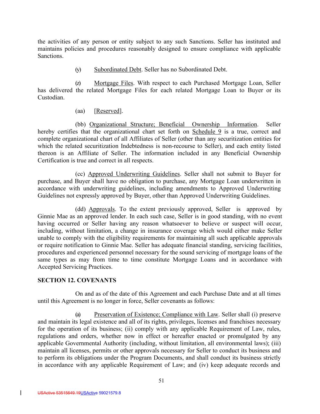 51 USActive 53515649.19USActive 59021579.8 the activities of any person or entity subject to any such Sanctions. Seller has instituted and maintains policies and procedures reasonably designed to ensure compliance with applicable Sanctions. (y) Subordinated Debt. Seller has no Subordinated Debt. (z) Mortgage Files. With respect to each Purchased Mortgage Loan, Seller has delivered the related Mortgage Files for each related Mortgage Loan to Buyer or its Custodian. (aa) [Reserved]. (bb) Organizational Structure; Beneficial Ownership Information. Seller hereby certifies that the organizational chart set forth on Schedule 9 is a true, correct and complete organizational chart of all Affiliates of Seller (other than any securitization entities for which the related securitization Indebtedness is non-recourse to Seller), and each entity listed thereon is an Affiliate of Seller. The information included in any Beneficial Ownership Certification is true and correct in all respects. (cc) Approved Underwriting Guidelines. Seller shall not submit to Buyer for purchase, and Buyer shall have no obligation to purchase, any Mortgage Loan underwritten in accordance with underwriting guidelines, including amendments to Approved Underwriting Guidelines not expressly approved by Buyer, other than Approved Underwriting Guidelines. (dd) Approvals. To the extent previously approved, Seller is approved by Ginnie Mae as an approved lender. In each such case, Seller is in good standing, with no event having occurred or Seller having any reason whatsoever to believe or suspect will occur, including, without limitation, a change in insurance coverage which would either make Seller unable to comply with the eligibility requirements for maintaining all such applicable approvals or require notification to Ginnie Mae. Seller has adequate financial standing, servicing facilities, procedures and experienced personnel necessary for the sound servicing of mortgage loans of the same types as may from time to time constitute Mortgage Loans and in accordance with Accepted Servicing Practices. SECTION 12. COVENANTS On and as of the date of this Agreement and each Purchase Date and at all times until this Agreement is no longer in force, Seller covenants as follows: (a) Preservation of Existence; Compliance with Law. Seller shall (i) preserve and maintain its legal existence and all of its rights, privileges, licenses and franchises necessary for the operation of its business; (ii) comply with any applicable Requirement of Law, rules, regulations and orders, whether now in effect or hereafter enacted or promulgated by any applicable Governmental Authority (including, without limitation, all environmental laws); (iii) maintain all licenses, permits or other approvals necessary for Seller to conduct its business and to perform its obligations under the Program Documents, and shall conduct its business strictly in accordance with any applicable Requirement of Law; and (iv) keep adequate records and