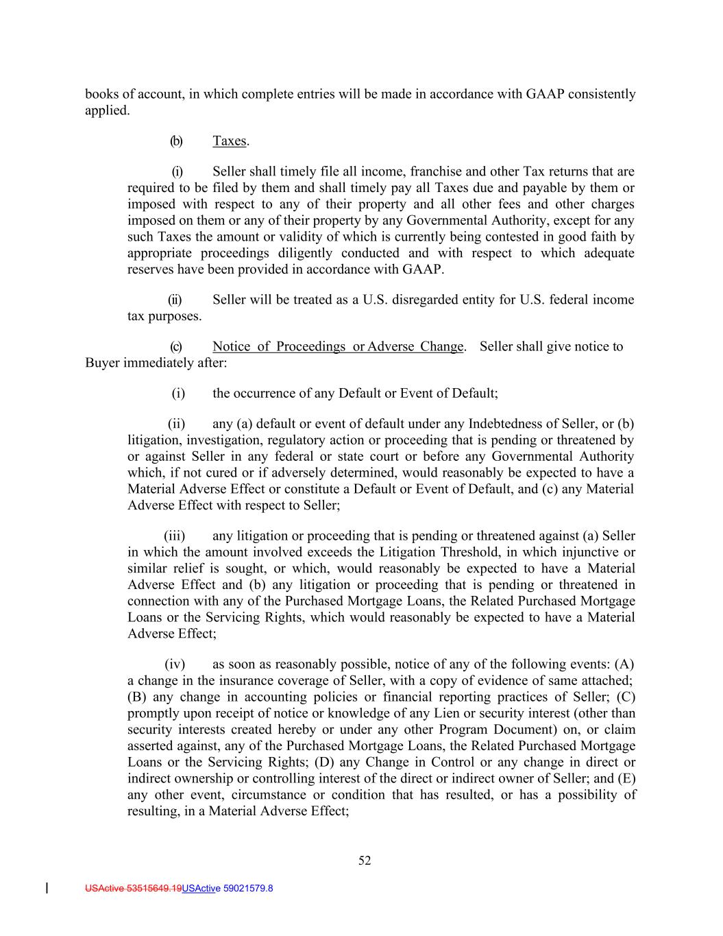 52 USActive 53515649.19USActive 59021579.8 books of account, in which complete entries will be made in accordance with GAAP consistently applied. (b) Taxes. (i) Seller shall timely file all income, franchise and other Tax returns that are required to be filed by them and shall timely pay all Taxes due and payable by them or imposed with respect to any of their property and all other fees and other charges imposed on them or any of their property by any Governmental Authority, except for any such Taxes the amount or validity of which is currently being contested in good faith by appropriate proceedings diligently conducted and with respect to which adequate reserves have been provided in accordance with GAAP. (ii) Seller will be treated as a U.S. disregarded entity for U.S. federal income tax purposes. (c) Notice of Proceedings or Adverse Change. Seller shall give notice to Buyer immediately after: (i) the occurrence of any Default or Event of Default; (ii) any (a) default or event of default under any Indebtedness of Seller, or (b) litigation, investigation, regulatory action or proceeding that is pending or threatened by or against Seller in any federal or state court or before any Governmental Authority which, if not cured or if adversely determined, would reasonably be expected to have a Material Adverse Effect or constitute a Default or Event of Default, and (c) any Material Adverse Effect with respect to Seller; (iii) any litigation or proceeding that is pending or threatened against (a) Seller in which the amount involved exceeds the Litigation Threshold, in which injunctive or similar relief is sought, or which, would reasonably be expected to have a Material Adverse Effect and (b) any litigation or proceeding that is pending or threatened in connection with any of the Purchased Mortgage Loans, the Related Purchased Mortgage Loans or the Servicing Rights, which would reasonably be expected to have a Material Adverse Effect; (iv) as soon as reasonably possible, notice of any of the following events: (A) a change in the insurance coverage of Seller, with a copy of evidence of same attached; (B) any change in accounting policies or financial reporting practices of Seller; (C) promptly upon receipt of notice or knowledge of any Lien or security interest (other than security interests created hereby or under any other Program Document) on, or claim asserted against, any of the Purchased Mortgage Loans, the Related Purchased Mortgage Loans or the Servicing Rights; (D) any Change in Control or any change in direct or indirect ownership or controlling interest of the direct or indirect owner of Seller; and (E) any other event, circumstance or condition that has resulted, or has a possibility of resulting, in a Material Adverse Effect;