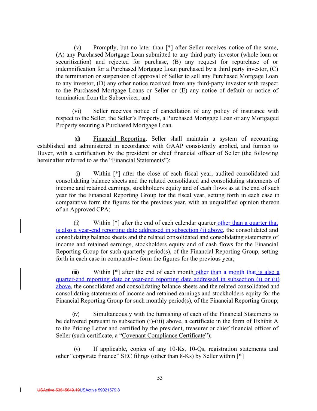 53 USActive 53515649.19USActive 59021579.8 (v) Promptly, but no later than [*] after Seller receives notice of the same, (A) any Purchased Mortgage Loan submitted to any third party investor (whole loan or securitization) and rejected for purchase, (B) any request for repurchase of or indemnification for a Purchased Mortgage Loan purchased by a third party investor, (C) the termination or suspension of approval of Seller to sell any Purchased Mortgage Loan to any investor, (D) any other notice received from any third-party investor with respect to the Purchased Mortgage Loans or Seller or (E) any notice of default or notice of termination from the Subservicer; and (vi) Seller receives notice of cancellation of any policy of insurance with respect to the Seller, the Seller’s Property, a Purchased Mortgage Loan or any Mortgaged Property securing a Purchased Mortgage Loan. (d) Financial Reporting. Seller shall maintain a system of accounting established and administered in accordance with GAAP consistently applied, and furnish to Buyer, with a certification by the president or chief financial officer of Seller (the following hereinafter referred to as the “Financial Statements”): (i) Within [*] after the close of each fiscal year, audited consolidated and consolidating balance sheets and the related consolidated and consolidating statements of income and retained earnings, stockholders equity and of cash flows as at the end of such year for the Financial Reporting Group for the fiscal year, setting forth in each case in comparative form the figures for the previous year, with an unqualified opinion thereon of an Approved CPA; (ii) Within [*] after the end of each calendar quarter other than a quarter that is also a year-end reporting date addressed in subsection (i) above, the consolidated and consolidating balance sheets and the related consolidated and consolidating statements of income and retained earnings, stockholders equity and of cash flows for the Financial Reporting Group for such quarterly period(s), of the Financial Reporting Group, setting forth in each case in comparative form the figures for the previous year; (iii) Within [*] after the end of each month other than a month that is also a quarter-end reporting date or year-end reporting date addressed in subsection (i) or (ii) above, the consolidated and consolidating balance sheets and the related consolidated and consolidating statements of income and retained earnings and stockholders equity for the Financial Reporting Group for such monthly period(s), of the Financial Reporting Group; (iv) Simultaneously with the furnishing of each of the Financial Statements to be delivered pursuant to subsection (i)-(iii) above, a certificate in the form of Exhibit A to the Pricing Letter and certified by the president, treasurer or chief financial officer of Seller (such certificate, a “Covenant Compliance Certificate”); (v) If applicable, copies of any 10-Ks, 10-Qs, registration statements and other “corporate finance” SEC filings (other than 8-Ks) by Seller within [*]