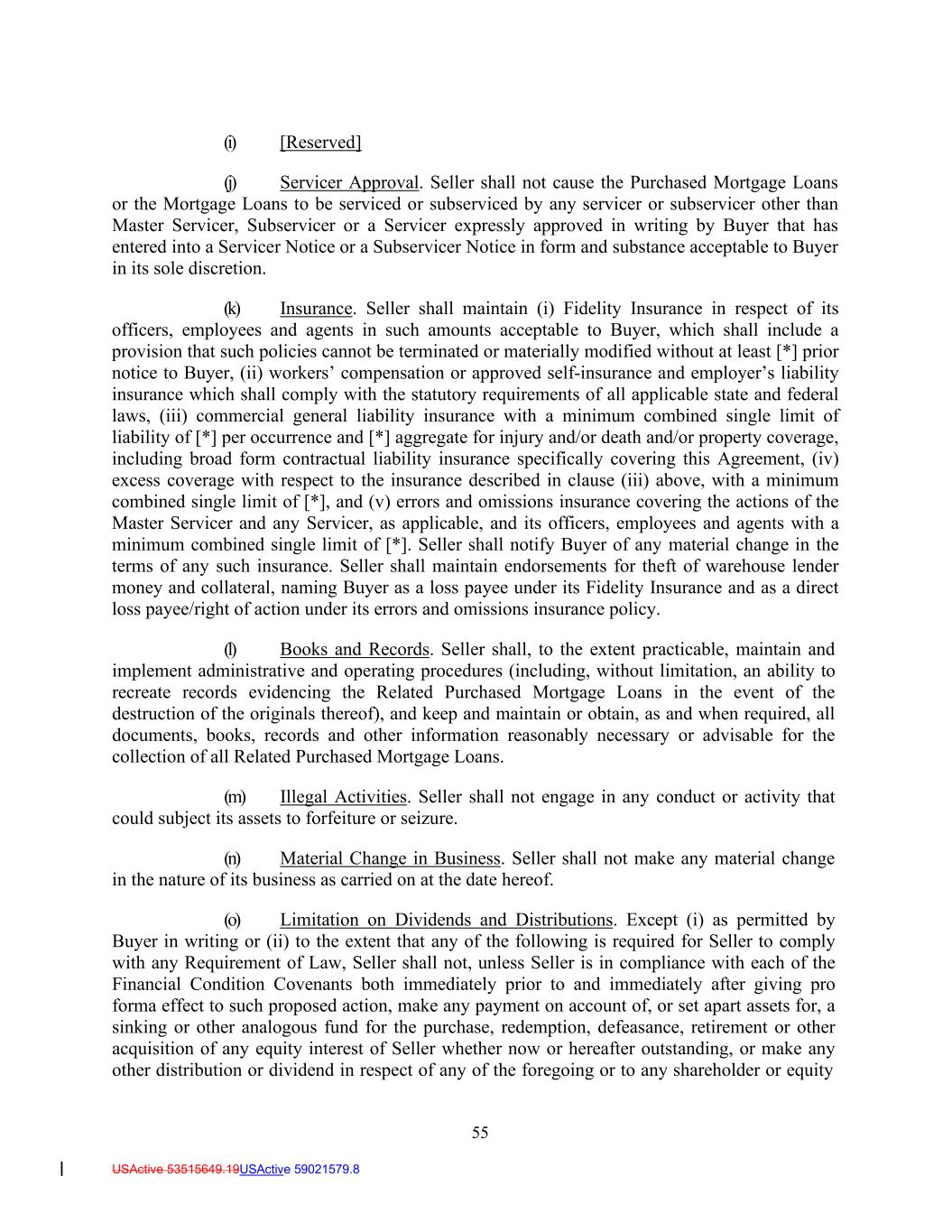 55 USActive 53515649.19USActive 59021579.8 (i) [Reserved] (j) Servicer Approval. Seller shall not cause the Purchased Mortgage Loans or the Mortgage Loans to be serviced or subserviced by any servicer or subservicer other than Master Servicer, Subservicer or a Servicer expressly approved in writing by Buyer that has entered into a Servicer Notice or a Subservicer Notice in form and substance acceptable to Buyer in its sole discretion. (k) Insurance. Seller shall maintain (i) Fidelity Insurance in respect of its officers, employees and agents in such amounts acceptable to Buyer, which shall include a provision that such policies cannot be terminated or materially modified without at least [*] prior notice to Buyer, (ii) workers’ compensation or approved self-insurance and employer’s liability insurance which shall comply with the statutory requirements of all applicable state and federal laws, (iii) commercial general liability insurance with a minimum combined single limit of liability of [*] per occurrence and [*] aggregate for injury and/or death and/or property coverage, including broad form contractual liability insurance specifically covering this Agreement, (iv) excess coverage with respect to the insurance described in clause (iii) above, with a minimum combined single limit of [*], and (v) errors and omissions insurance covering the actions of the Master Servicer and any Servicer, as applicable, and its officers, employees and agents with a minimum combined single limit of [*]. Seller shall notify Buyer of any material change in the terms of any such insurance. Seller shall maintain endorsements for theft of warehouse lender money and collateral, naming Buyer as a loss payee under its Fidelity Insurance and as a direct loss payee/right of action under its errors and omissions insurance policy. (l) Books and Records. Seller shall, to the extent practicable, maintain and implement administrative and operating procedures (including, without limitation, an ability to recreate records evidencing the Related Purchased Mortgage Loans in the event of the destruction of the originals thereof), and keep and maintain or obtain, as and when required, all documents, books, records and other information reasonably necessary or advisable for the collection of all Related Purchased Mortgage Loans. (m) Illegal Activities. Seller shall not engage in any conduct or activity that could subject its assets to forfeiture or seizure. (n) Material Change in Business. Seller shall not make any material change in the nature of its business as carried on at the date hereof. (o) Limitation on Dividends and Distributions. Except (i) as permitted by Buyer in writing or (ii) to the extent that any of the following is required for Seller to comply with any Requirement of Law, Seller shall not, unless Seller is in compliance with each of the Financial Condition Covenants both immediately prior to and immediately after giving pro forma effect to such proposed action, make any payment on account of, or set apart assets for, a sinking or other analogous fund for the purchase, redemption, defeasance, retirement or other acquisition of any equity interest of Seller whether now or hereafter outstanding, or make any other distribution or dividend in respect of any of the foregoing or to any shareholder or equity