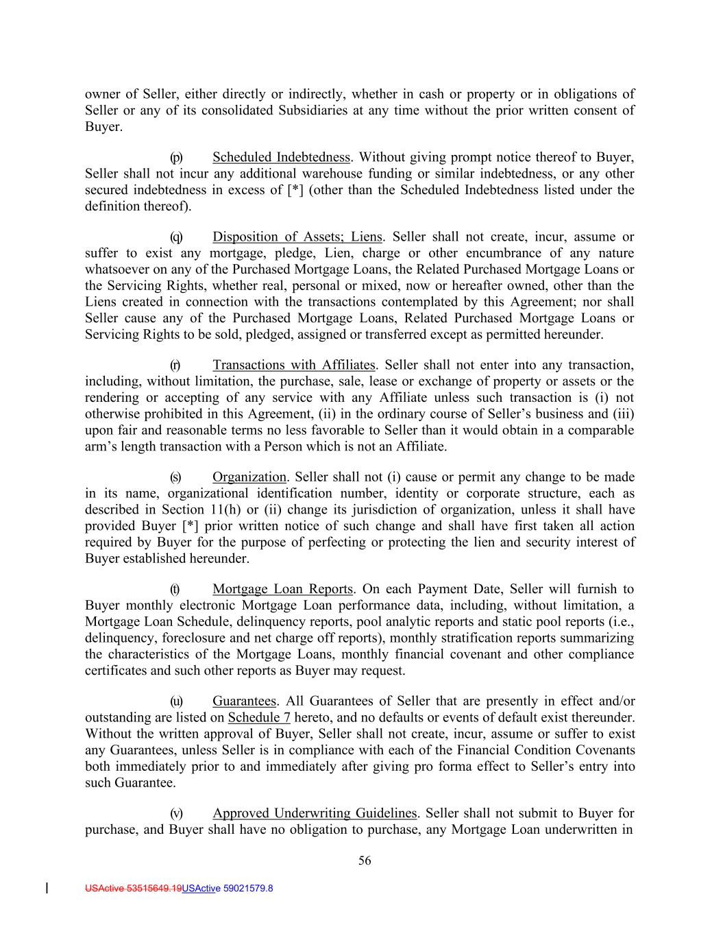 56 USActive 53515649.19USActive 59021579.8 owner of Seller, either directly or indirectly, whether in cash or property or in obligations of Seller or any of its consolidated Subsidiaries at any time without the prior written consent of Buyer. (p) Scheduled Indebtedness. Without giving prompt notice thereof to Buyer, Seller shall not incur any additional warehouse funding or similar indebtedness, or any other secured indebtedness in excess of [*] (other than the Scheduled Indebtedness listed under the definition thereof). (q) Disposition of Assets; Liens. Seller shall not create, incur, assume or suffer to exist any mortgage, pledge, Lien, charge or other encumbrance of any nature whatsoever on any of the Purchased Mortgage Loans, the Related Purchased Mortgage Loans or the Servicing Rights, whether real, personal or mixed, now or hereafter owned, other than the Liens created in connection with the transactions contemplated by this Agreement; nor shall Seller cause any of the Purchased Mortgage Loans, Related Purchased Mortgage Loans or Servicing Rights to be sold, pledged, assigned or transferred except as permitted hereunder. (r) Transactions with Affiliates. Seller shall not enter into any transaction, including, without limitation, the purchase, sale, lease or exchange of property or assets or the rendering or accepting of any service with any Affiliate unless such transaction is (i) not otherwise prohibited in this Agreement, (ii) in the ordinary course of Seller’s business and (iii) upon fair and reasonable terms no less favorable to Seller than it would obtain in a comparable arm’s length transaction with a Person which is not an Affiliate. (s) Organization. Seller shall not (i) cause or permit any change to be made in its name, organizational identification number, identity or corporate structure, each as described in Section 11(h) or (ii) change its jurisdiction of organization, unless it shall have provided Buyer [*] prior written notice of such change and shall have first taken all action required by Buyer for the purpose of perfecting or protecting the lien and security interest of Buyer established hereunder. (t) Mortgage Loan Reports. On each Payment Date, Seller will furnish to Buyer monthly electronic Mortgage Loan performance data, including, without limitation, a Mortgage Loan Schedule, delinquency reports, pool analytic reports and static pool reports (i.e., delinquency, foreclosure and net charge off reports), monthly stratification reports summarizing the characteristics of the Mortgage Loans, monthly financial covenant and other compliance certificates and such other reports as Buyer may request. (u) Guarantees. All Guarantees of Seller that are presently in effect and/or outstanding are listed on Schedule 7 hereto, and no defaults or events of default exist thereunder. Without the written approval of Buyer, Seller shall not create, incur, assume or suffer to exist any Guarantees, unless Seller is in compliance with each of the Financial Condition Covenants both immediately prior to and immediately after giving pro forma effect to Seller’s entry into such Guarantee. (v) Approved Underwriting Guidelines. Seller shall not submit to Buyer for purchase, and Buyer shall have no obligation to purchase, any Mortgage Loan underwritten in