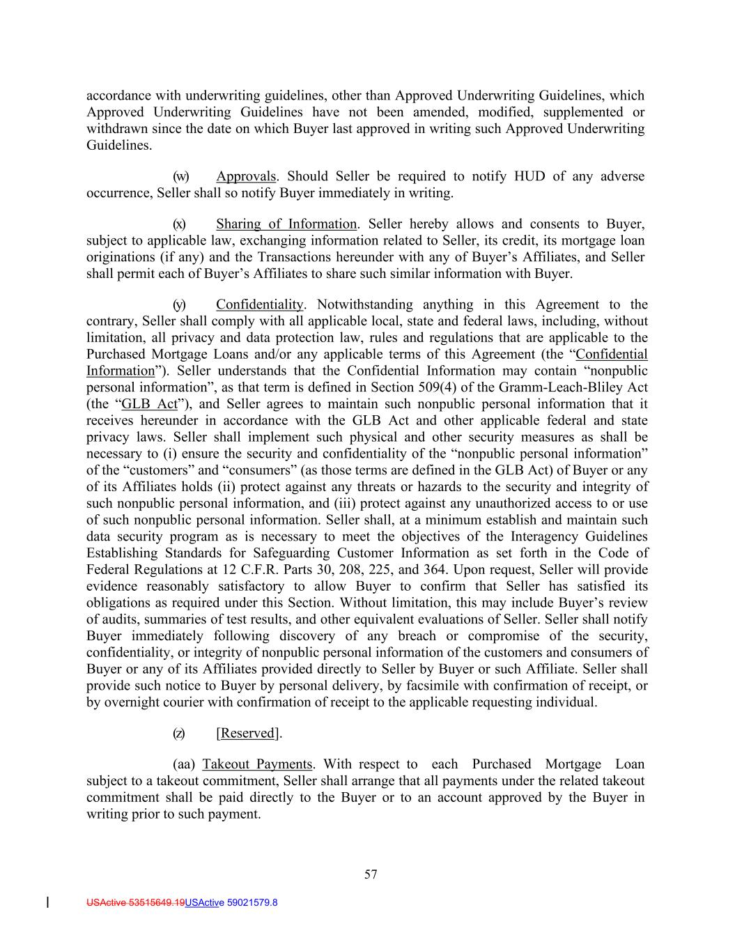57 USActive 53515649.19USActive 59021579.8 accordance with underwriting guidelines, other than Approved Underwriting Guidelines, which Approved Underwriting Guidelines have not been amended, modified, supplemented or withdrawn since the date on which Buyer last approved in writing such Approved Underwriting Guidelines. (w) Approvals. Should Seller be required to notify HUD of any adverse occurrence, Seller shall so notify Buyer immediately in writing. (x) Sharing of Information. Seller hereby allows and consents to Buyer, subject to applicable law, exchanging information related to Seller, its credit, its mortgage loan originations (if any) and the Transactions hereunder with any of Buyer’s Affiliates, and Seller shall permit each of Buyer’s Affiliates to share such similar information with Buyer. (y) Confidentiality. Notwithstanding anything in this Agreement to the contrary, Seller shall comply with all applicable local, state and federal laws, including, without limitation, all privacy and data protection law, rules and regulations that are applicable to the Purchased Mortgage Loans and/or any applicable terms of this Agreement (the “Confidential Information”). Seller understands that the Confidential Information may contain “nonpublic personal information”, as that term is defined in Section 509(4) of the Gramm-Leach-Bliley Act (the “GLB Act”), and Seller agrees to maintain such nonpublic personal information that it receives hereunder in accordance with the GLB Act and other applicable federal and state privacy laws. Seller shall implement such physical and other security measures as shall be necessary to (i) ensure the security and confidentiality of the “nonpublic personal information” of the “customers” and “consumers” (as those terms are defined in the GLB Act) of Buyer or any of its Affiliates holds (ii) protect against any threats or hazards to the security and integrity of such nonpublic personal information, and (iii) protect against any unauthorized access to or use of such nonpublic personal information. Seller shall, at a minimum establish and maintain such data security program as is necessary to meet the objectives of the Interagency Guidelines Establishing Standards for Safeguarding Customer Information as set forth in the Code of Federal Regulations at 12 C.F.R. Parts 30, 208, 225, and 364. Upon request, Seller will provide evidence reasonably satisfactory to allow Buyer to confirm that Seller has satisfied its obligations as required under this Section. Without limitation, this may include Buyer’s review of audits, summaries of test results, and other equivalent evaluations of Seller. Seller shall notify Buyer immediately following discovery of any breach or compromise of the security, confidentiality, or integrity of nonpublic personal information of the customers and consumers of Buyer or any of its Affiliates provided directly to Seller by Buyer or such Affiliate. Seller shall provide such notice to Buyer by personal delivery, by facsimile with confirmation of receipt, or by overnight courier with confirmation of receipt to the applicable requesting individual. (z) [Reserved]. (aa) Takeout Payments. With respect to each Purchased Mortgage Loan subject to a takeout commitment, Seller shall arrange that all payments under the related takeout commitment shall be paid directly to the Buyer or to an account approved by the Buyer in writing prior to such payment.