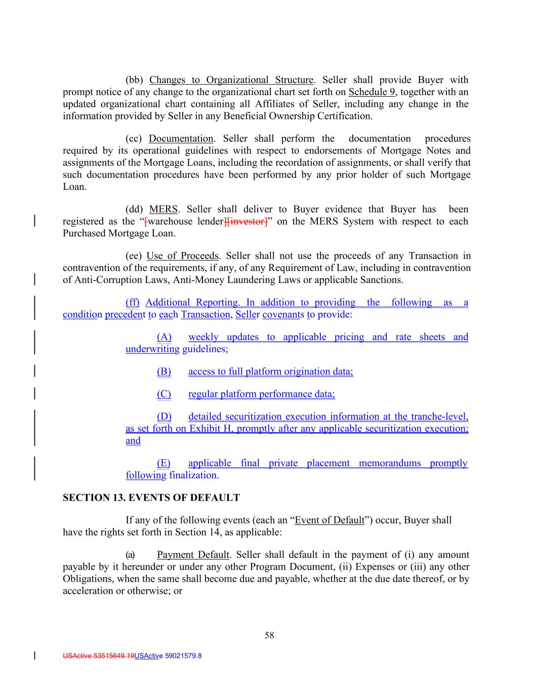58 USActive 53515649.19USActive 59021579.8 (bb) Changes to Organizational Structure. Seller shall provide Buyer with prompt notice of any change to the organizational chart set forth on Schedule 9, together with an updated organizational chart containing all Affiliates of Seller, including any change in the information provided by Seller in any Beneficial Ownership Certification. (cc) Documentation. Seller shall perform the documentation procedures required by its operational guidelines with respect to endorsements of Mortgage Notes and assignments of the Mortgage Loans, including the recordation of assignments, or shall verify that such documentation procedures have been performed by any prior holder of such Mortgage Loan. (dd) MERS. Seller shall deliver to Buyer evidence that Buyer has been registered as the “[warehouse lender][investor]” on the MERS System with respect to each Purchased Mortgage Loan. (ee) Use of Proceeds. Seller shall not use the proceeds of any Transaction in contravention of the requirements, if any, of any Requirement of Law, including in contravention of Anti-Corruption Laws, Anti-Money Laundering Laws or applicable Sanctions. (ff) Additional Reporting. In addition to providing the following as a condition precedent to each Transaction, Seller covenants to provide: (A) weekly updates to applicable pricing and rate sheets and underwriting guidelines; (B) access to full platform origination data; (C) regular platform performance data; (D) detailed securitization execution information at the tranche-level, as set forth on Exhibit H, promptly after any applicable securitization execution; and (E) applicable final private placement memorandums promptly following finalization. SECTION 13. EVENTS OF DEFAULT If any of the following events (each an “Event of Default”) occur, Buyer shall have the rights set forth in Section 14, as applicable: (a) Payment Default. Seller shall default in the payment of (i) any amount payable by it hereunder or under any other Program Document, (ii) Expenses or (iii) any other Obligations, when the same shall become due and payable, whether at the due date thereof, or by acceleration or otherwise; or
