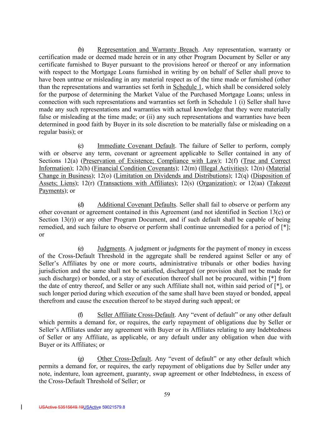59 USActive 53515649.19USActive 59021579.8 (b) Representation and Warranty Breach. Any representation, warranty or certification made or deemed made herein or in any other Program Document by Seller or any certificate furnished to Buyer pursuant to the provisions hereof or thereof or any information with respect to the Mortgage Loans furnished in writing by on behalf of Seller shall prove to have been untrue or misleading in any material respect as of the time made or furnished (other than the representations and warranties set forth in Schedule 1, which shall be considered solely for the purpose of determining the Market Value of the Purchased Mortgage Loans; unless in connection with such representations and warranties set forth in Schedule 1 (i) Seller shall have made any such representations and warranties with actual knowledge that they were materially false or misleading at the time made; or (ii) any such representations and warranties have been determined in good faith by Buyer in its sole discretion to be materially false or misleading on a regular basis); or (c) Immediate Covenant Default. The failure of Seller to perform, comply with or observe any term, covenant or agreement applicable to Seller contained in any of Sections 12(a) (Preservation of Existence; Compliance with Law); 12(f) (True and Correct Information); 12(h) (Financial Condition Covenants); 12(m) (Illegal Activities); 12(n) (Material Change in Business); 12(o) (Limitation on Dividends and Distributions); 12(q) (Disposition of Assets; Liens); 12(r) (Transactions with Affiliates); 12(s) (Organization); or 12(aa) (Takeout Payments); or (d) Additional Covenant Defaults. Seller shall fail to observe or perform any other covenant or agreement contained in this Agreement (and not identified in Section 13(c) or Section 13(r)) or any other Program Document, and if such default shall be capable of being remedied, and such failure to observe or perform shall continue unremedied for a period of [*]; or (e) Judgments. A judgment or judgments for the payment of money in excess of the Cross-Default Threshold in the aggregate shall be rendered against Seller or any of Seller’s Affiliates by one or more courts, administrative tribunals or other bodies having jurisdiction and the same shall not be satisfied, discharged (or provision shall not be made for such discharge) or bonded, or a stay of execution thereof shall not be procured, within [*] from the date of entry thereof, and Seller or any such Affiliate shall not, within said period of [*], or such longer period during which execution of the same shall have been stayed or bonded, appeal therefrom and cause the execution thereof to be stayed during such appeal; or (f) Seller Affiliate Cross-Default. Any “event of default” or any other default which permits a demand for, or requires, the early repayment of obligations due by Seller or Seller’s Affiliates under any agreement with Buyer or its Affiliates relating to any Indebtedness of Seller or any Affiliate, as applicable, or any default under any obligation when due with Buyer or its Affiliates; or (g) Other Cross-Default. Any “event of default” or any other default which permits a demand for, or requires, the early repayment of obligations due by Seller under any note, indenture, loan agreement, guaranty, swap agreement or other Indebtedness, in excess of the Cross-Default Threshold of Seller; or