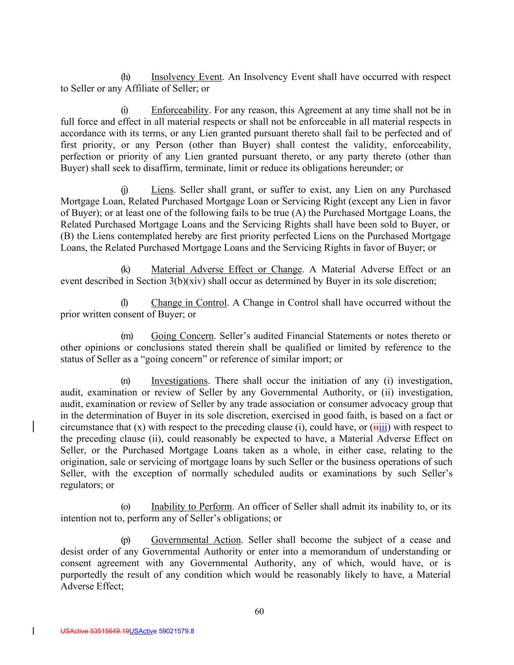 60 USActive 53515649.19USActive 59021579.8 (h) Insolvency Event. An Insolvency Event shall have occurred with respect to Seller or any Affiliate of Seller; or (i) Enforceability. For any reason, this Agreement at any time shall not be in full force and effect in all material respects or shall not be enforceable in all material respects in accordance with its terms, or any Lien granted pursuant thereto shall fail to be perfected and of first priority, or any Person (other than Buyer) shall contest the validity, enforceability, perfection or priority of any Lien granted pursuant thereto, or any party thereto (other than Buyer) shall seek to disaffirm, terminate, limit or reduce its obligations hereunder; or (j) Liens. Seller shall grant, or suffer to exist, any Lien on any Purchased Mortgage Loan, Related Purchased Mortgage Loan or Servicing Right (except any Lien in favor of Buyer); or at least one of the following fails to be true (A) the Purchased Mortgage Loans, the Related Purchased Mortgage Loans and the Servicing Rights shall have been sold to Buyer, or (B) the Liens contemplated hereby are first priority perfected Liens on the Purchased Mortgage Loans, the Related Purchased Mortgage Loans and the Servicing Rights in favor of Buyer; or (k) Material Adverse Effect or Change. A Material Adverse Effect or an event described in Section 3(b)(xiv) shall occur as determined by Buyer in its sole discretion; (l) Change in Control. A Change in Control shall have occurred without the prior written consent of Buyer; or (m) Going Concern. Seller’s audited Financial Statements or notes thereto or other opinions or conclusions stated therein shall be qualified or limited by reference to the status of Seller as a “going concern” or reference of similar import; or (n) Investigations. There shall occur the initiation of any (i) investigation, audit, examination or review of Seller by any Governmental Authority, or (ii) investigation, audit, examination or review of Seller by any trade association or consumer advocacy group that in the determination of Buyer in its sole discretion, exercised in good faith, is based on a fact or circumstance that (x) with respect to the preceding clause (i), could have, or (iiiii) with respect to the preceding clause (ii), could reasonably be expected to have, a Material Adverse Effect on Seller, or the Purchased Mortgage Loans taken as a whole, in either case, relating to the origination, sale or servicing of mortgage loans by such Seller or the business operations of such Seller, with the exception of normally scheduled audits or examinations by such Seller’s regulators; or (o) Inability to Perform. An officer of Seller shall admit its inability to, or its intention not to, perform any of Seller’s obligations; or (p) Governmental Action. Seller shall become the subject of a cease and desist order of any Governmental Authority or enter into a memorandum of understanding or consent agreement with any Governmental Authority, any of which, would have, or is purportedly the result of any condition which would be reasonably likely to have, a Material Adverse Effect;