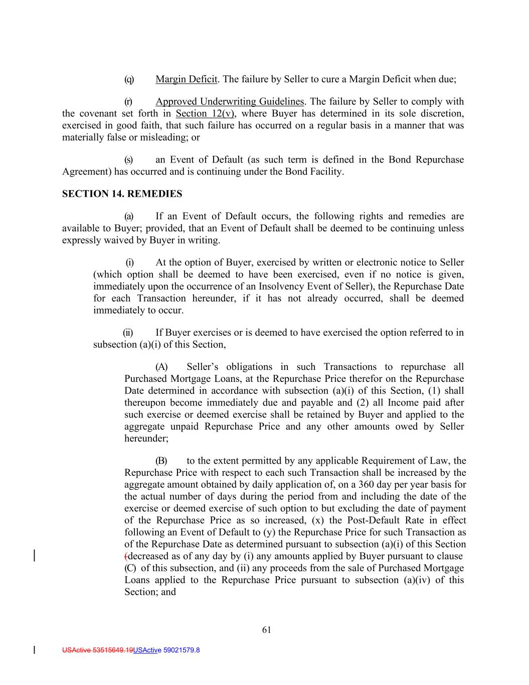 61 USActive 53515649.19USActive 59021579.8 (q) Margin Deficit. The failure by Seller to cure a Margin Deficit when due; (r) Approved Underwriting Guidelines. The failure by Seller to comply with the covenant set forth in Section 12(v), where Buyer has determined in its sole discretion, exercised in good faith, that such failure has occurred on a regular basis in a manner that was materially false or misleading; or (s) an Event of Default (as such term is defined in the Bond Repurchase Agreement) has occurred and is continuing under the Bond Facility. SECTION 14. REMEDIES (a) If an Event of Default occurs, the following rights and remedies are available to Buyer; provided, that an Event of Default shall be deemed to be continuing unless expressly waived by Buyer in writing. (i) At the option of Buyer, exercised by written or electronic notice to Seller (which option shall be deemed to have been exercised, even if no notice is given, immediately upon the occurrence of an Insolvency Event of Seller), the Repurchase Date for each Transaction hereunder, if it has not already occurred, shall be deemed immediately to occur. (ii) If Buyer exercises or is deemed to have exercised the option referred to in subsection (a)(i) of this Section, (A) Seller’s obligations in such Transactions to repurchase all Purchased Mortgage Loans, at the Repurchase Price therefor on the Repurchase Date determined in accordance with subsection (a)(i) of this Section, (1) shall thereupon become immediately due and payable and (2) all Income paid after such exercise or deemed exercise shall be retained by Buyer and applied to the aggregate unpaid Repurchase Price and any other amounts owed by Seller hereunder; (B) to the extent permitted by any applicable Requirement of Law, the Repurchase Price with respect to each such Transaction shall be increased by the aggregate amount obtained by daily application of, on a 360 day per year basis for the actual number of days during the period from and including the date of the exercise or deemed exercise of such option to but excluding the date of payment of the Repurchase Price as so increased, (x) the Post-Default Rate in effect following an Event of Default to (y) the Repurchase Price for such Transaction as of the Repurchase Date as determined pursuant to subsection (a)(i) of this Section (decreased as of any day by (i) any amounts applied by Buyer pursuant to clause (C) of this subsection, and (ii) any proceeds from the sale of Purchased Mortgage Loans applied to the Repurchase Price pursuant to subsection (a)(iv) of this Section; and