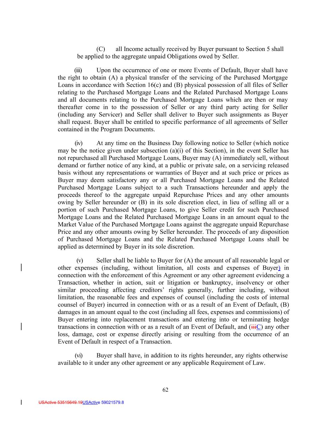 62 USActive 53515649.19USActive 59021579.8 (C) all Income actually received by Buyer pursuant to Section 5 shall be applied to the aggregate unpaid Obligations owed by Seller. (iii) Upon the occurrence of one or more Events of Default, Buyer shall have the right to obtain (A) a physical transfer of the servicing of the Purchased Mortgage Loans in accordance with Section 16(c) and (B) physical possession of all files of Seller relating to the Purchased Mortgage Loans and the Related Purchased Mortgage Loans and all documents relating to the Purchased Mortgage Loans which are then or may thereafter come in to the possession of Seller or any third party acting for Seller (including any Servicer) and Seller shall deliver to Buyer such assignments as Buyer shall request. Buyer shall be entitled to specific performance of all agreements of Seller contained in the Program Documents. (iv) At any time on the Business Day following notice to Seller (which notice may be the notice given under subsection (a)(i) of this Section), in the event Seller has not repurchased all Purchased Mortgage Loans, Buyer may (A) immediately sell, without demand or further notice of any kind, at a public or private sale, on a servicing released basis without any representations or warranties of Buyer and at such price or prices as Buyer may deem satisfactory any or all Purchased Mortgage Loans and the Related Purchased Mortgage Loans subject to a such Transactions hereunder and apply the proceeds thereof to the aggregate unpaid Repurchase Prices and any other amounts owing by Seller hereunder or (B) in its sole discretion elect, in lieu of selling all or a portion of such Purchased Mortgage Loans, to give Seller credit for such Purchased Mortgage Loans and the Related Purchased Mortgage Loans in an amount equal to the Market Value of the Purchased Mortgage Loans against the aggregate unpaid Repurchase Price and any other amounts owing by Seller hereunder. The proceeds of any disposition of Purchased Mortgage Loans and the Related Purchased Mortgage Loans shall be applied as determined by Buyer in its sole discretion. (v) Seller shall be liable to Buyer for (A) the amount of all reasonable legal or other expenses (including, without limitation, all costs and expenses of Buyer) in connection with the enforcement of this Agreement or any other agreement evidencing a Transaction, whether in action, suit or litigation or bankruptcy, insolvency or other similar proceeding affecting creditors’ rights generally, further including, without limitation, the reasonable fees and expenses of counsel (including the costs of internal counsel of Buyer) incurred in connection with or as a result of an Event of Default, (B) damages in an amount equal to the cost (including all fees, expenses and commissions) of Buyer entering into replacement transactions and entering into or terminating hedge transactions in connection with or as a result of an Event of Default, and (iiiC) any other loss, damage, cost or expense directly arising or resulting from the occurrence of an Event of Default in respect of a Transaction. (vi) Buyer shall have, in addition to its rights hereunder, any rights otherwise available to it under any other agreement or any applicable Requirement of Law.