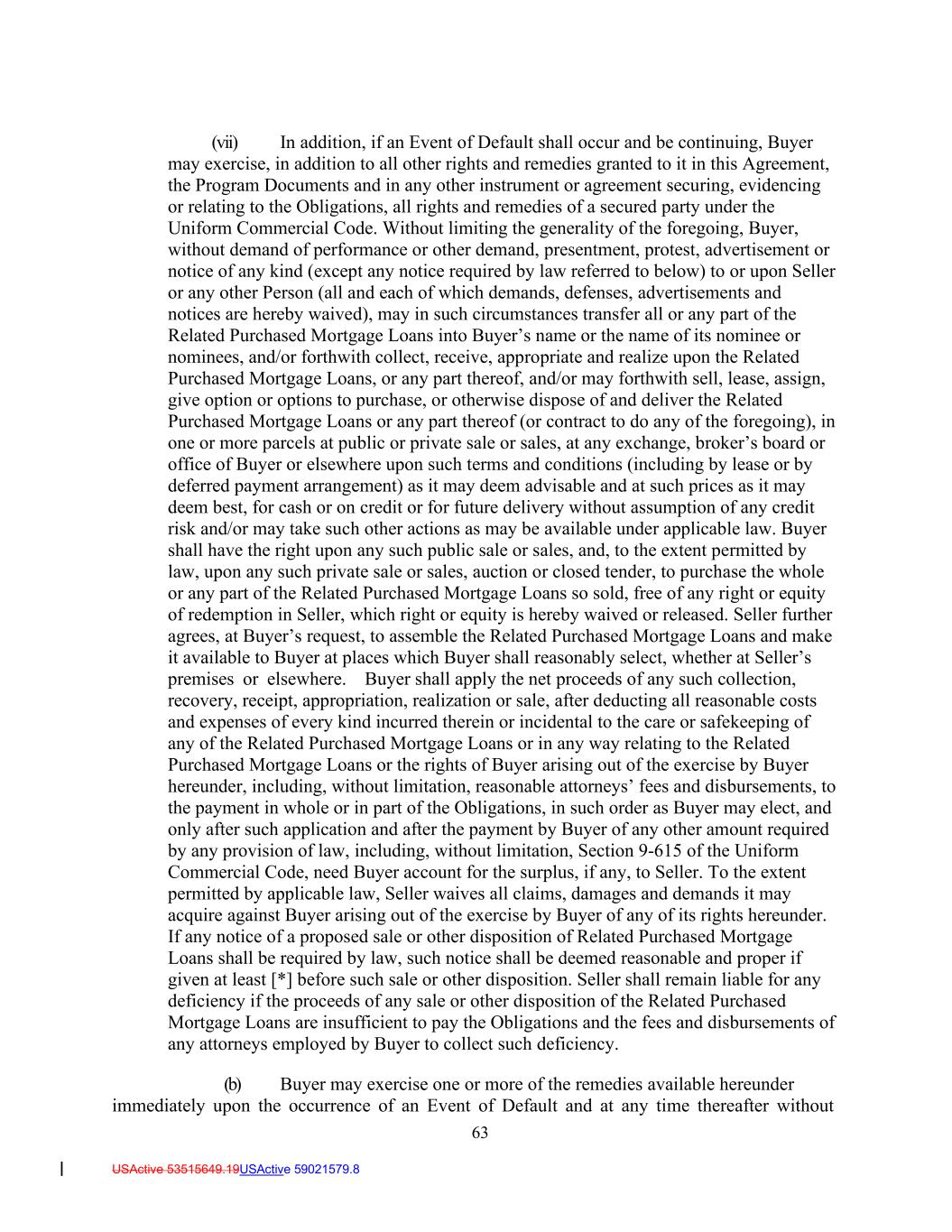 63 USActive 53515649.19USActive 59021579.8 (vii) In addition, if an Event of Default shall occur and be continuing, Buyer may exercise, in addition to all other rights and remedies granted to it in this Agreement, the Program Documents and in any other instrument or agreement securing, evidencing or relating to the Obligations, all rights and remedies of a secured party under the Uniform Commercial Code. Without limiting the generality of the foregoing, Buyer, without demand of performance or other demand, presentment, protest, advertisement or notice of any kind (except any notice required by law referred to below) to or upon Seller or any other Person (all and each of which demands, defenses, advertisements and notices are hereby waived), may in such circumstances transfer all or any part of the Related Purchased Mortgage Loans into Buyer’s name or the name of its nominee or nominees, and/or forthwith collect, receive, appropriate and realize upon the Related Purchased Mortgage Loans, or any part thereof, and/or may forthwith sell, lease, assign, give option or options to purchase, or otherwise dispose of and deliver the Related Purchased Mortgage Loans or any part thereof (or contract to do any of the foregoing), in one or more parcels at public or private sale or sales, at any exchange, broker’s board or office of Buyer or elsewhere upon such terms and conditions (including by lease or by deferred payment arrangement) as it may deem advisable and at such prices as it may deem best, for cash or on credit or for future delivery without assumption of any credit risk and/or may take such other actions as may be available under applicable law. Buyer shall have the right upon any such public sale or sales, and, to the extent permitted by law, upon any such private sale or sales, auction or closed tender, to purchase the whole or any part of the Related Purchased Mortgage Loans so sold, free of any right or equity of redemption in Seller, which right or equity is hereby waived or released. Seller further agrees, at Buyer’s request, to assemble the Related Purchased Mortgage Loans and make it available to Buyer at places which Buyer shall reasonably select, whether at Seller’s premises or elsewhere. Buyer shall apply the net proceeds of any such collection, recovery, receipt, appropriation, realization or sale, after deducting all reasonable costs and expenses of every kind incurred therein or incidental to the care or safekeeping of any of the Related Purchased Mortgage Loans or in any way relating to the Related Purchased Mortgage Loans or the rights of Buyer arising out of the exercise by Buyer hereunder, including, without limitation, reasonable attorneys’ fees and disbursements, to the payment in whole or in part of the Obligations, in such order as Buyer may elect, and only after such application and after the payment by Buyer of any other amount required by any provision of law, including, without limitation, Section 9-615 of the Uniform Commercial Code, need Buyer account for the surplus, if any, to Seller. To the extent permitted by applicable law, Seller waives all claims, damages and demands it may acquire against Buyer arising out of the exercise by Buyer of any of its rights hereunder. If any notice of a proposed sale or other disposition of Related Purchased Mortgage Loans shall be required by law, such notice shall be deemed reasonable and proper if given at least [*] before such sale or other disposition. Seller shall remain liable for any deficiency if the proceeds of any sale or other disposition of the Related Purchased Mortgage Loans are insufficient to pay the Obligations and the fees and disbursements of any attorneys employed by Buyer to collect such deficiency. (b) Buyer may exercise one or more of the remedies available hereunder immediately upon the occurrence of an Event of Default and at any time thereafter without
