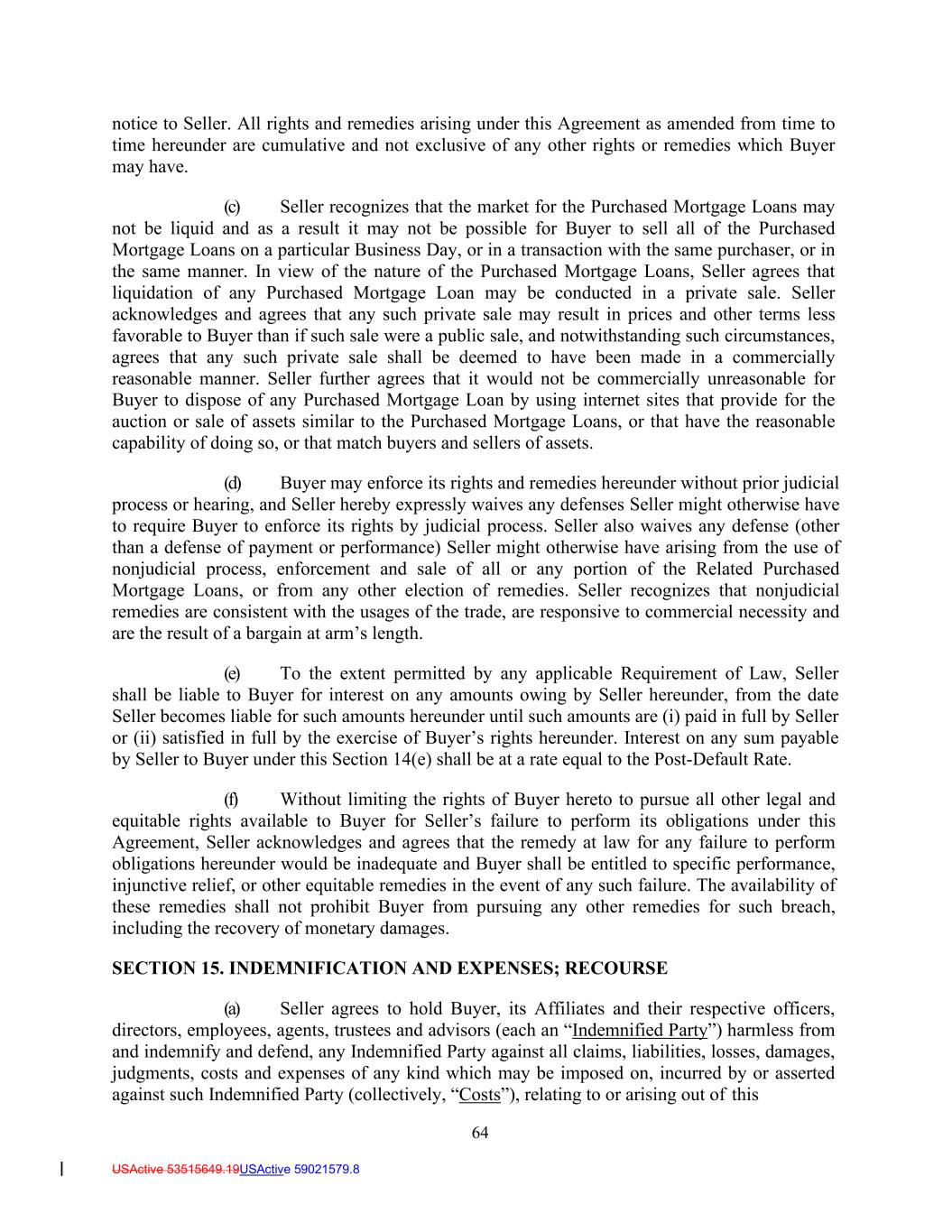 64 USActive 53515649.19USActive 59021579.8 notice to Seller. All rights and remedies arising under this Agreement as amended from time to time hereunder are cumulative and not exclusive of any other rights or remedies which Buyer may have. (c) Seller recognizes that the market for the Purchased Mortgage Loans may not be liquid and as a result it may not be possible for Buyer to sell all of the Purchased Mortgage Loans on a particular Business Day, or in a transaction with the same purchaser, or in the same manner. In view of the nature of the Purchased Mortgage Loans, Seller agrees that liquidation of any Purchased Mortgage Loan may be conducted in a private sale. Seller acknowledges and agrees that any such private sale may result in prices and other terms less favorable to Buyer than if such sale were a public sale, and notwithstanding such circumstances, agrees that any such private sale shall be deemed to have been made in a commercially reasonable manner. Seller further agrees that it would not be commercially unreasonable for Buyer to dispose of any Purchased Mortgage Loan by using internet sites that provide for the auction or sale of assets similar to the Purchased Mortgage Loans, or that have the reasonable capability of doing so, or that match buyers and sellers of assets. (d) Buyer may enforce its rights and remedies hereunder without prior judicial process or hearing, and Seller hereby expressly waives any defenses Seller might otherwise have to require Buyer to enforce its rights by judicial process. Seller also waives any defense (other than a defense of payment or performance) Seller might otherwise have arising from the use of nonjudicial process, enforcement and sale of all or any portion of the Related Purchased Mortgage Loans, or from any other election of remedies. Seller recognizes that nonjudicial remedies are consistent with the usages of the trade, are responsive to commercial necessity and are the result of a bargain at arm’s length. (e) To the extent permitted by any applicable Requirement of Law, Seller shall be liable to Buyer for interest on any amounts owing by Seller hereunder, from the date Seller becomes liable for such amounts hereunder until such amounts are (i) paid in full by Seller or (ii) satisfied in full by the exercise of Buyer’s rights hereunder. Interest on any sum payable by Seller to Buyer under this Section 14(e) shall be at a rate equal to the Post-Default Rate. (f) Without limiting the rights of Buyer hereto to pursue all other legal and equitable rights available to Buyer for Seller’s failure to perform its obligations under this Agreement, Seller acknowledges and agrees that the remedy at law for any failure to perform obligations hereunder would be inadequate and Buyer shall be entitled to specific performance, injunctive relief, or other equitable remedies in the event of any such failure. The availability of these remedies shall not prohibit Buyer from pursuing any other remedies for such breach, including the recovery of monetary damages. SECTION 15. INDEMNIFICATION AND EXPENSES; RECOURSE (a) Seller agrees to hold Buyer, its Affiliates and their respective officers, directors, employees, agents, trustees and advisors (each an “Indemnified Party”) harmless from and indemnify and defend, any Indemnified Party against all claims, liabilities, losses, damages, judgments, costs and expenses of any kind which may be imposed on, incurred by or asserted against such Indemnified Party (collectively, “Costs”), relating to or arising out of this