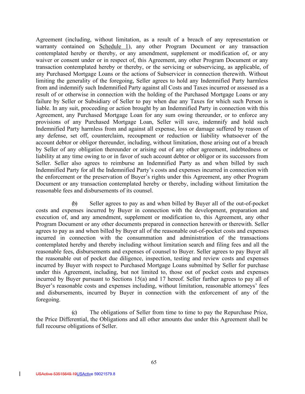 65 USActive 53515649.19USActive 59021579.8 Agreement (including, without limitation, as a result of a breach of any representation or warranty contained on Schedule 1), any other Program Document or any transaction contemplated hereby or thereby, or any amendment, supplement or modification of, or any waiver or consent under or in respect of, this Agreement, any other Program Document or any transaction contemplated hereby or thereby, or the servicing or subservicing, as applicable, of any Purchased Mortgage Loans or the actions of Subservicer in connection therewith. Without limiting the generality of the foregoing, Seller agrees to hold any Indemnified Party harmless from and indemnify such Indemnified Party against all Costs and Taxes incurred or assessed as a result of or otherwise in connection with the holding of the Purchased Mortgage Loans or any failure by Seller or Subsidiary of Seller to pay when due any Taxes for which such Person is liable. In any suit, proceeding or action brought by an Indemnified Party in connection with this Agreement, any Purchased Mortgage Loan for any sum owing thereunder, or to enforce any provisions of any Purchased Mortgage Loan, Seller will save, indemnify and hold such Indemnified Party harmless from and against all expense, loss or damage suffered by reason of any defense, set off, counterclaim, recoupment or reduction or liability whatsoever of the account debtor or obligor thereunder, including, without limitation, those arising out of a breach by Seller of any obligation thereunder or arising out of any other agreement, indebtedness or liability at any time owing to or in favor of such account debtor or obligor or its successors from Seller. Seller also agrees to reimburse an Indemnified Party as and when billed by such Indemnified Party for all the Indemnified Party’s costs and expenses incurred in connection with the enforcement or the preservation of Buyer’s rights under this Agreement, any other Program Document or any transaction contemplated hereby or thereby, including without limitation the reasonable fees and disbursements of its counsel. (b) Seller agrees to pay as and when billed by Buyer all of the out-of-pocket costs and expenses incurred by Buyer in connection with the development, preparation and execution of, and any amendment, supplement or modification to, this Agreement, any other Program Document or any other documents prepared in connection herewith or therewith. Seller agrees to pay as and when billed by Buyer all of the reasonable out-of-pocket costs and expenses incurred in connection with the consummation and administration of the transactions contemplated hereby and thereby including without limitation search and filing fees and all the reasonable fees, disbursements and expenses of counsel to Buyer. Seller agrees to pay Buyer all the reasonable out of pocket due diligence, inspection, testing and review costs and expenses incurred by Buyer with respect to Purchased Mortgage Loans submitted by Seller for purchase under this Agreement, including, but not limited to, those out of pocket costs and expenses incurred by Buyer pursuant to Sections 15(a) and 17 hereof. Seller further agrees to pay all of Buyer’s reasonable costs and expenses including, without limitation, reasonable attorneys’ fees and disbursements, incurred by Buyer in connection with the enforcement of any of the foregoing. (c) The obligations of Seller from time to time to pay the Repurchase Price, the Price Differential, the Obligations and all other amounts due under this Agreement shall be full recourse obligations of Seller.