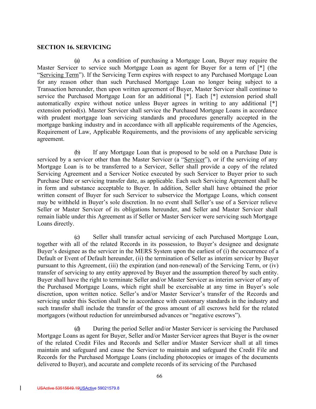 66 USActive 53515649.19USActive 59021579.8 SECTION 16. SERVICING (a) As a condition of purchasing a Mortgage Loan, Buyer may require the Master Servicer to service such Mortgage Loan as agent for Buyer for a term of [*] (the “Servicing Term”). If the Servicing Term expires with respect to any Purchased Mortgage Loan for any reason other than such Purchased Mortgage Loan no longer being subject to a Transaction hereunder, then upon written agreement of Buyer, Master Servicer shall continue to service the Purchased Mortgage Loan for an additional [*]. Each [*] extension period shall automatically expire without notice unless Buyer agrees in writing to any additional [*] extension period(s). Master Servicer shall service the Purchased Mortgage Loans in accordance with prudent mortgage loan servicing standards and procedures generally accepted in the mortgage banking industry and in accordance with all applicable requirements of the Agencies, Requirement of Law, Applicable Requirements, and the provisions of any applicable servicing agreement. (b) If any Mortgage Loan that is proposed to be sold on a Purchase Date is serviced by a servicer other than the Master Servicer (a “Servicer”), or if the servicing of any Mortgage Loan is to be transferred to a Servicer, Seller shall provide a copy of the related Servicing Agreement and a Servicer Notice executed by such Servicer to Buyer prior to such Purchase Date or servicing transfer date, as applicable. Each such Servicing Agreement shall be in form and substance acceptable to Buyer. In addition, Seller shall have obtained the prior written consent of Buyer for such Servicer to subservice the Mortgage Loans, which consent may be withheld in Buyer’s sole discretion. In no event shall Seller’s use of a Servicer relieve Seller or Master Servicer of its obligations hereunder, and Seller and Master Servicer shall remain liable under this Agreement as if Seller or Master Servicer were servicing such Mortgage Loans directly. (c) Seller shall transfer actual servicing of each Purchased Mortgage Loan, together with all of the related Records in its possession, to Buyer’s designee and designate Buyer’s designee as the servicer in the MERS System upon the earliest of (i) the occurrence of a Default or Event of Default hereunder, (ii) the termination of Seller as interim servicer by Buyer pursuant to this Agreement, (iii) the expiration (and non-renewal) of the Servicing Term, or (iv) transfer of servicing to any entity approved by Buyer and the assumption thereof by such entity. Buyer shall have the right to terminate Seller and/or Master Servicer as interim servicer of any of the Purchased Mortgage Loans, which right shall be exercisable at any time in Buyer’s sole discretion, upon written notice. Seller’s and/or Master Servicer’s transfer of the Records and servicing under this Section shall be in accordance with customary standards in the industry and such transfer shall include the transfer of the gross amount of all escrows held for the related mortgagors (without reduction for unreimbursed advances or “negative escrows”). (d) During the period Seller and/or Master Servicer is servicing the Purchased Mortgage Loans as agent for Buyer, Seller and/or Master Servicer agrees that Buyer is the owner of the related Credit Files and Records and Seller and/or Master Servicer shall at all times maintain and safeguard and cause the Servicer to maintain and safeguard the Credit File and Records for the Purchased Mortgage Loans (including photocopies or images of the documents delivered to Buyer), and accurate and complete records of its servicing of the Purchased