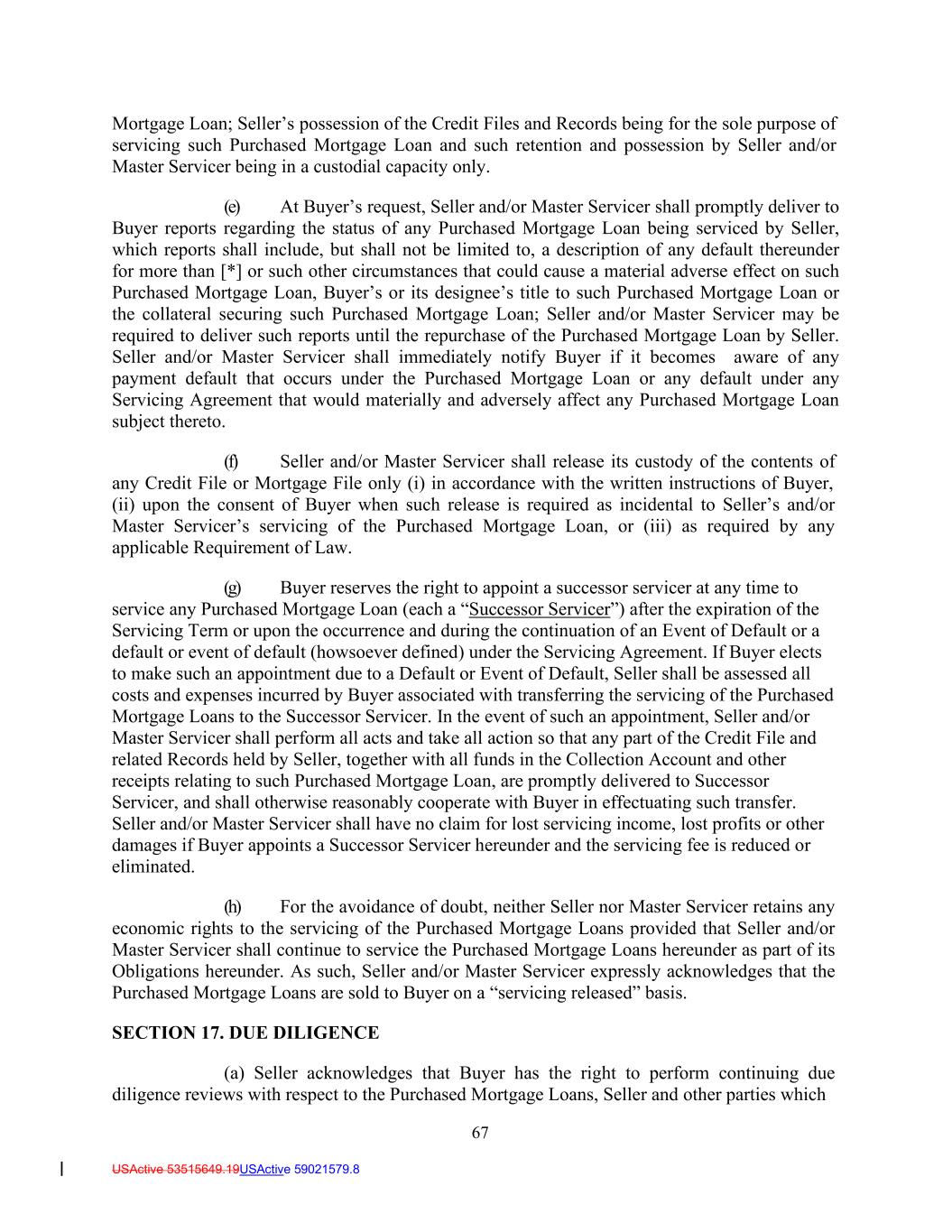 67 USActive 53515649.19USActive 59021579.8 Mortgage Loan; Seller’s possession of the Credit Files and Records being for the sole purpose of servicing such Purchased Mortgage Loan and such retention and possession by Seller and/or Master Servicer being in a custodial capacity only. (e) At Buyer’s request, Seller and/or Master Servicer shall promptly deliver to Buyer reports regarding the status of any Purchased Mortgage Loan being serviced by Seller, which reports shall include, but shall not be limited to, a description of any default thereunder for more than [*] or such other circumstances that could cause a material adverse effect on such Purchased Mortgage Loan, Buyer’s or its designee’s title to such Purchased Mortgage Loan or the collateral securing such Purchased Mortgage Loan; Seller and/or Master Servicer may be required to deliver such reports until the repurchase of the Purchased Mortgage Loan by Seller. Seller and/or Master Servicer shall immediately notify Buyer if it becomes aware of any payment default that occurs under the Purchased Mortgage Loan or any default under any Servicing Agreement that would materially and adversely affect any Purchased Mortgage Loan subject thereto. (f) Seller and/or Master Servicer shall release its custody of the contents of any Credit File or Mortgage File only (i) in accordance with the written instructions of Buyer, (ii) upon the consent of Buyer when such release is required as incidental to Seller’s and/or Master Servicer’s servicing of the Purchased Mortgage Loan, or (iii) as required by any applicable Requirement of Law. (g) Buyer reserves the right to appoint a successor servicer at any time to service any Purchased Mortgage Loan (each a “Successor Servicer”) after the expiration of the Servicing Term or upon the occurrence and during the continuation of an Event of Default or a default or event of default (howsoever defined) under the Servicing Agreement. If Buyer elects to make such an appointment due to a Default or Event of Default, Seller shall be assessed all costs and expenses incurred by Buyer associated with transferring the servicing of the Purchased Mortgage Loans to the Successor Servicer. In the event of such an appointment, Seller and/or Master Servicer shall perform all acts and take all action so that any part of the Credit File and related Records held by Seller, together with all funds in the Collection Account and other receipts relating to such Purchased Mortgage Loan, are promptly delivered to Successor Servicer, and shall otherwise reasonably cooperate with Buyer in effectuating such transfer. Seller and/or Master Servicer shall have no claim for lost servicing income, lost profits or other damages if Buyer appoints a Successor Servicer hereunder and the servicing fee is reduced or eliminated. (h) For the avoidance of doubt, neither Seller nor Master Servicer retains any economic rights to the servicing of the Purchased Mortgage Loans provided that Seller and/or Master Servicer shall continue to service the Purchased Mortgage Loans hereunder as part of its Obligations hereunder. As such, Seller and/or Master Servicer expressly acknowledges that the Purchased Mortgage Loans are sold to Buyer on a “servicing released” basis. SECTION 17. DUE DILIGENCE (a) Seller acknowledges that Buyer has the right to perform continuing due diligence reviews with respect to the Purchased Mortgage Loans, Seller and other parties which