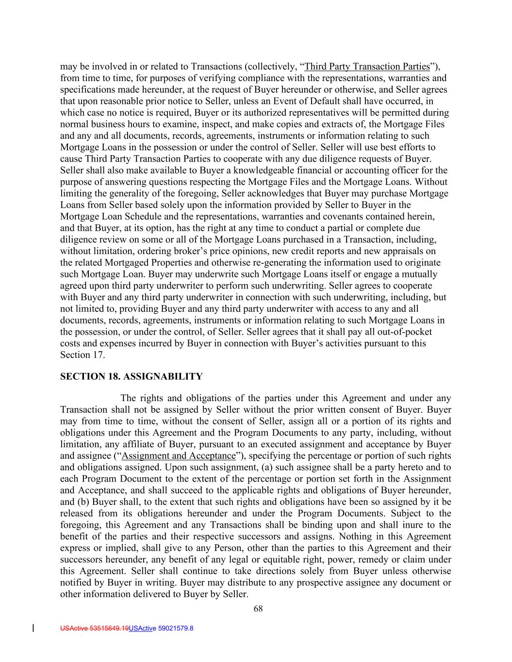 68 USActive 53515649.19USActive 59021579.8 may be involved in or related to Transactions (collectively, “Third Party Transaction Parties”), from time to time, for purposes of verifying compliance with the representations, warranties and specifications made hereunder, at the request of Buyer hereunder or otherwise, and Seller agrees that upon reasonable prior notice to Seller, unless an Event of Default shall have occurred, in which case no notice is required, Buyer or its authorized representatives will be permitted during normal business hours to examine, inspect, and make copies and extracts of, the Mortgage Files and any and all documents, records, agreements, instruments or information relating to such Mortgage Loans in the possession or under the control of Seller. Seller will use best efforts to cause Third Party Transaction Parties to cooperate with any due diligence requests of Buyer. Seller shall also make available to Buyer a knowledgeable financial or accounting officer for the purpose of answering questions respecting the Mortgage Files and the Mortgage Loans. Without limiting the generality of the foregoing, Seller acknowledges that Buyer may purchase Mortgage Loans from Seller based solely upon the information provided by Seller to Buyer in the Mortgage Loan Schedule and the representations, warranties and covenants contained herein, and that Buyer, at its option, has the right at any time to conduct a partial or complete due diligence review on some or all of the Mortgage Loans purchased in a Transaction, including, without limitation, ordering broker’s price opinions, new credit reports and new appraisals on the related Mortgaged Properties and otherwise re-generating the information used to originate such Mortgage Loan. Buyer may underwrite such Mortgage Loans itself or engage a mutually agreed upon third party underwriter to perform such underwriting. Seller agrees to cooperate with Buyer and any third party underwriter in connection with such underwriting, including, but not limited to, providing Buyer and any third party underwriter with access to any and all documents, records, agreements, instruments or information relating to such Mortgage Loans in the possession, or under the control, of Seller. Seller agrees that it shall pay all out-of-pocket costs and expenses incurred by Buyer in connection with Buyer’s activities pursuant to this Section 17. SECTION 18. ASSIGNABILITY The rights and obligations of the parties under this Agreement and under any Transaction shall not be assigned by Seller without the prior written consent of Buyer. Buyer may from time to time, without the consent of Seller, assign all or a portion of its rights and obligations under this Agreement and the Program Documents to any party, including, without limitation, any affiliate of Buyer, pursuant to an executed assignment and acceptance by Buyer and assignee (“Assignment and Acceptance”), specifying the percentage or portion of such rights and obligations assigned. Upon such assignment, (a) such assignee shall be a party hereto and to each Program Document to the extent of the percentage or portion set forth in the Assignment and Acceptance, and shall succeed to the applicable rights and obligations of Buyer hereunder, and (b) Buyer shall, to the extent that such rights and obligations have been so assigned by it be released from its obligations hereunder and under the Program Documents. Subject to the foregoing, this Agreement and any Transactions shall be binding upon and shall inure to the benefit of the parties and their respective successors and assigns. Nothing in this Agreement express or implied, shall give to any Person, other than the parties to this Agreement and their successors hereunder, any benefit of any legal or equitable right, power, remedy or claim under this Agreement. Seller shall continue to take directions solely from Buyer unless otherwise notified by Buyer in writing. Buyer may distribute to any prospective assignee any document or other information delivered to Buyer by Seller.