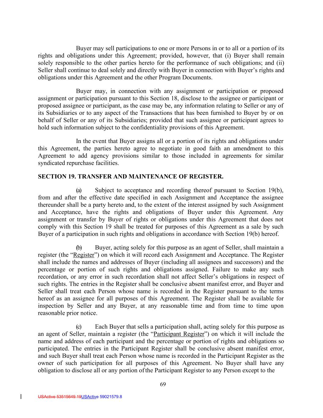 69 USActive 53515649.19USActive 59021579.8 Buyer may sell participations to one or more Persons in or to all or a portion of its rights and obligations under this Agreement; provided, however, that (i) Buyer shall remain solely responsible to the other parties hereto for the performance of such obligations; and (ii) Seller shall continue to deal solely and directly with Buyer in connection with Buyer’s rights and obligations under this Agreement and the other Program Documents. Buyer may, in connection with any assignment or participation or proposed assignment or participation pursuant to this Section 18, disclose to the assignee or participant or proposed assignee or participant, as the case may be, any information relating to Seller or any of its Subsidiaries or to any aspect of the Transactions that has been furnished to Buyer by or on behalf of Seller or any of its Subsidiaries; provided that such assignee or participant agrees to hold such information subject to the confidentiality provisions of this Agreement. In the event that Buyer assigns all or a portion of its rights and obligations under this Agreement, the parties hereto agree to negotiate in good faith an amendment to this Agreement to add agency provisions similar to those included in agreements for similar syndicated repurchase facilities. SECTION 19. TRANSFER AND MAINTENANCE OF REGISTER. (a) Subject to acceptance and recording thereof pursuant to Section 19(b), from and after the effective date specified in each Assignment and Acceptance the assignee thereunder shall be a party hereto and, to the extent of the interest assigned by such Assignment and Acceptance, have the rights and obligations of Buyer under this Agreement. Any assignment or transfer by Buyer of rights or obligations under this Agreement that does not comply with this Section 19 shall be treated for purposes of this Agreement as a sale by such Buyer of a participation in such rights and obligations in accordance with Section 19(b) hereof. (b) Buyer, acting solely for this purpose as an agent of Seller, shall maintain a register (the “Register”) on which it will record each Assignment and Acceptance. The Register shall include the names and addresses of Buyer (including all assignees and successors) and the percentage or portion of such rights and obligations assigned. Failure to make any such recordation, or any error in such recordation shall not affect Seller’s obligations in respect of such rights. The entries in the Register shall be conclusive absent manifest error, and Buyer and Seller shall treat each Person whose name is recorded in the Register pursuant to the terms hereof as an assignee for all purposes of this Agreement. The Register shall be available for inspection by Seller and any Buyer, at any reasonable time and from time to time upon reasonable prior notice. (c) Each Buyer that sells a participation shall, acting solely for this purpose as an agent of Seller, maintain a register (the “Participant Register”) on which it will include the name and address of each participant and the percentage or portion of rights and obligations so participated. The entries in the Participant Register shall be conclusive absent manifest error, and such Buyer shall treat each Person whose name is recorded in the Participant Register as the owner of such participation for all purposes of this Agreement. No Buyer shall have any obligation to disclose all or any portion of the Participant Register to any Person except to the