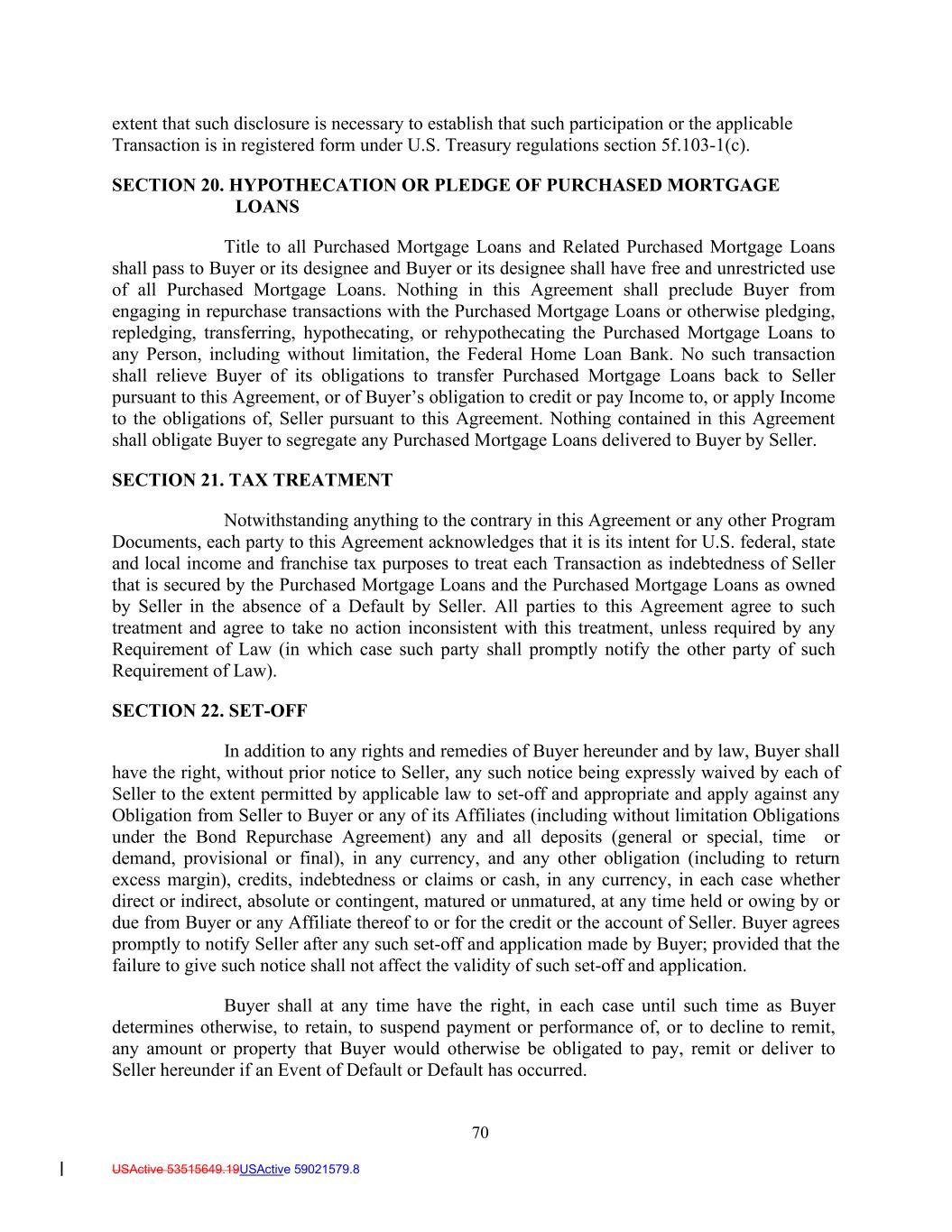 70 USActive 53515649.19USActive 59021579.8 extent that such disclosure is necessary to establish that such participation or the applicable Transaction is in registered form under U.S. Treasury regulations section 5f.103-1(c). SECTION 20. HYPOTHECATION OR PLEDGE OF PURCHASED MORTGAGE LOANS Title to all Purchased Mortgage Loans and Related Purchased Mortgage Loans shall pass to Buyer or its designee and Buyer or its designee shall have free and unrestricted use of all Purchased Mortgage Loans. Nothing in this Agreement shall preclude Buyer from engaging in repurchase transactions with the Purchased Mortgage Loans or otherwise pledging, repledging, transferring, hypothecating, or rehypothecating the Purchased Mortgage Loans to any Person, including without limitation, the Federal Home Loan Bank. No such transaction shall relieve Buyer of its obligations to transfer Purchased Mortgage Loans back to Seller pursuant to this Agreement, or of Buyer’s obligation to credit or pay Income to, or apply Income to the obligations of, Seller pursuant to this Agreement. Nothing contained in this Agreement shall obligate Buyer to segregate any Purchased Mortgage Loans delivered to Buyer by Seller. SECTION 21. TAX TREATMENT Notwithstanding anything to the contrary in this Agreement or any other Program Documents, each party to this Agreement acknowledges that it is its intent for U.S. federal, state and local income and franchise tax purposes to treat each Transaction as indebtedness of Seller that is secured by the Purchased Mortgage Loans and the Purchased Mortgage Loans as owned by Seller in the absence of a Default by Seller. All parties to this Agreement agree to such treatment and agree to take no action inconsistent with this treatment, unless required by any Requirement of Law (in which case such party shall promptly notify the other party of such Requirement of Law). SECTION 22. SET-OFF In addition to any rights and remedies of Buyer hereunder and by law, Buyer shall have the right, without prior notice to Seller, any such notice being expressly waived by each of Seller to the extent permitted by applicable law to set-off and appropriate and apply against any Obligation from Seller to Buyer or any of its Affiliates (including without limitation Obligations under the Bond Repurchase Agreement) any and all deposits (general or special, time or demand, provisional or final), in any currency, and any other obligation (including to return excess margin), credits, indebtedness or claims or cash, in any currency, in each case whether direct or indirect, absolute or contingent, matured or unmatured, at any time held or owing by or due from Buyer or any Affiliate thereof to or for the credit or the account of Seller. Buyer agrees promptly to notify Seller after any such set-off and application made by Buyer; provided that the failure to give such notice shall not affect the validity of such set-off and application. Buyer shall at any time have the right, in each case until such time as Buyer determines otherwise, to retain, to suspend payment or performance of, or to decline to remit, any amount or property that Buyer would otherwise be obligated to pay, remit or deliver to Seller hereunder if an Event of Default or Default has occurred.