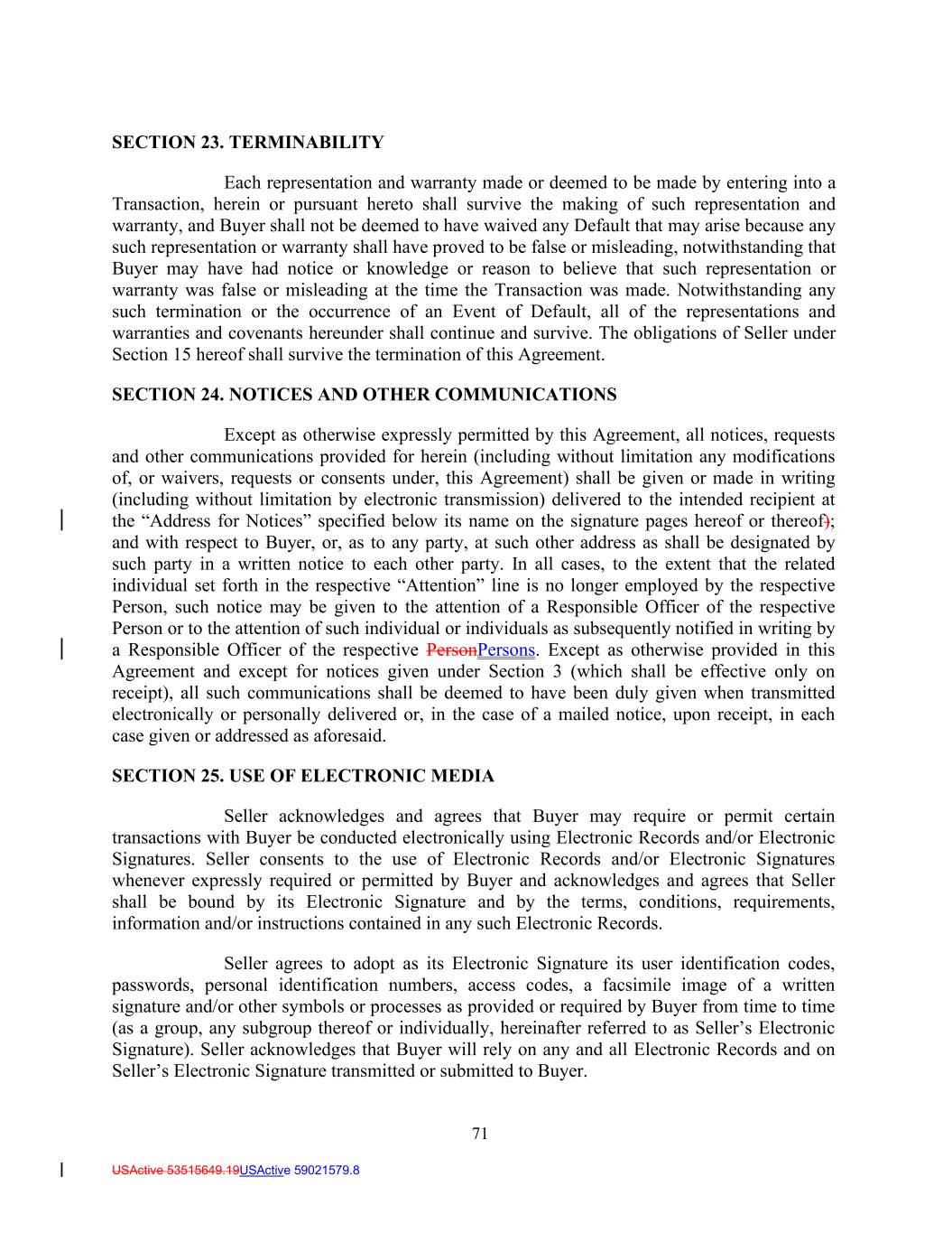 71 USActive 53515649.19USActive 59021579.8 SECTION 23. TERMINABILITY Each representation and warranty made or deemed to be made by entering into a Transaction, herein or pursuant hereto shall survive the making of such representation and warranty, and Buyer shall not be deemed to have waived any Default that may arise because any such representation or warranty shall have proved to be false or misleading, notwithstanding that Buyer may have had notice or knowledge or reason to believe that such representation or warranty was false or misleading at the time the Transaction was made. Notwithstanding any such termination or the occurrence of an Event of Default, all of the representations and warranties and covenants hereunder shall continue and survive. The obligations of Seller under Section 15 hereof shall survive the termination of this Agreement. SECTION 24. NOTICES AND OTHER COMMUNICATIONS Except as otherwise expressly permitted by this Agreement, all notices, requests and other communications provided for herein (including without limitation any modifications of, or waivers, requests or consents under, this Agreement) shall be given or made in writing (including without limitation by electronic transmission) delivered to the intended recipient at the “Address for Notices” specified below its name on the signature pages hereof or thereof); and with respect to Buyer, or, as to any party, at such other address as shall be designated by such party in a written notice to each other party. In all cases, to the extent that the related individual set forth in the respective “Attention” line is no longer employed by the respective Person, such notice may be given to the attention of a Responsible Officer of the respective Person or to the attention of such individual or individuals as subsequently notified in writing by a Responsible Officer of the respective PersonPersons. Except as otherwise provided in this Agreement and except for notices given under Section 3 (which shall be effective only on receipt), all such communications shall be deemed to have been duly given when transmitted electronically or personally delivered or, in the case of a mailed notice, upon receipt, in each case given or addressed as aforesaid. SECTION 25. USE OF ELECTRONIC MEDIA Seller acknowledges and agrees that Buyer may require or permit certain transactions with Buyer be conducted electronically using Electronic Records and/or Electronic Signatures. Seller consents to the use of Electronic Records and/or Electronic Signatures whenever expressly required or permitted by Buyer and acknowledges and agrees that Seller shall be bound by its Electronic Signature and by the terms, conditions, requirements, information and/or instructions contained in any such Electronic Records. Seller agrees to adopt as its Electronic Signature its user identification codes, passwords, personal identification numbers, access codes, a facsimile image of a written signature and/or other symbols or processes as provided or required by Buyer from time to time (as a group, any subgroup thereof or individually, hereinafter referred to as Seller’s Electronic Signature). Seller acknowledges that Buyer will rely on any and all Electronic Records and on Seller’s Electronic Signature transmitted or submitted to Buyer.