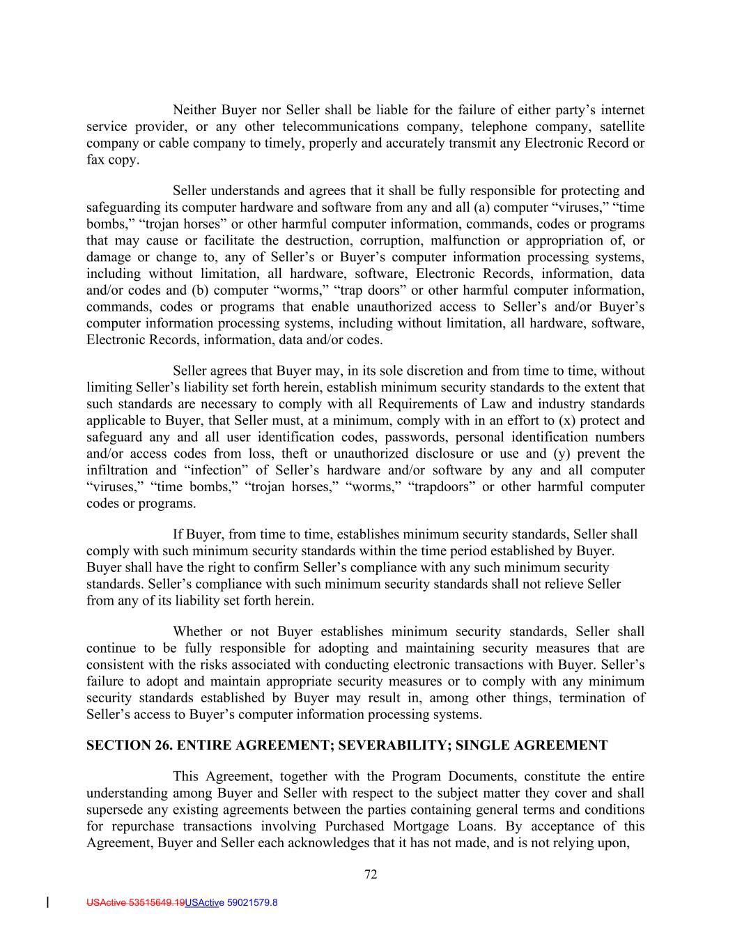 72 USActive 53515649.19USActive 59021579.8 Neither Buyer nor Seller shall be liable for the failure of either party’s internet service provider, or any other telecommunications company, telephone company, satellite company or cable company to timely, properly and accurately transmit any Electronic Record or fax copy. Seller understands and agrees that it shall be fully responsible for protecting and safeguarding its computer hardware and software from any and all (a) computer “viruses,” “time bombs,” “trojan horses” or other harmful computer information, commands, codes or programs that may cause or facilitate the destruction, corruption, malfunction or appropriation of, or damage or change to, any of Seller’s or Buyer’s computer information processing systems, including without limitation, all hardware, software, Electronic Records, information, data and/or codes and (b) computer “worms,” “trap doors” or other harmful computer information, commands, codes or programs that enable unauthorized access to Seller’s and/or Buyer’s computer information processing systems, including without limitation, all hardware, software, Electronic Records, information, data and/or codes. Seller agrees that Buyer may, in its sole discretion and from time to time, without limiting Seller’s liability set forth herein, establish minimum security standards to the extent that such standards are necessary to comply with all Requirements of Law and industry standards applicable to Buyer, that Seller must, at a minimum, comply with in an effort to (x) protect and safeguard any and all user identification codes, passwords, personal identification numbers and/or access codes from loss, theft or unauthorized disclosure or use and (y) prevent the infiltration and “infection” of Seller’s hardware and/or software by any and all computer “viruses,” “time bombs,” “trojan horses,” “worms,” “trapdoors” or other harmful computer codes or programs. If Buyer, from time to time, establishes minimum security standards, Seller shall comply with such minimum security standards within the time period established by Buyer. Buyer shall have the right to confirm Seller’s compliance with any such minimum security standards. Seller’s compliance with such minimum security standards shall not relieve Seller from any of its liability set forth herein. Whether or not Buyer establishes minimum security standards, Seller shall continue to be fully responsible for adopting and maintaining security measures that are consistent with the risks associated with conducting electronic transactions with Buyer. Seller’s failure to adopt and maintain appropriate security measures or to comply with any minimum security standards established by Buyer may result in, among other things, termination of Seller’s access to Buyer’s computer information processing systems. SECTION 26. ENTIRE AGREEMENT; SEVERABILITY; SINGLE AGREEMENT This Agreement, together with the Program Documents, constitute the entire understanding among Buyer and Seller with respect to the subject matter they cover and shall supersede any existing agreements between the parties containing general terms and conditions for repurchase transactions involving Purchased Mortgage Loans. By acceptance of this Agreement, Buyer and Seller each acknowledges that it has not made, and is not relying upon,
