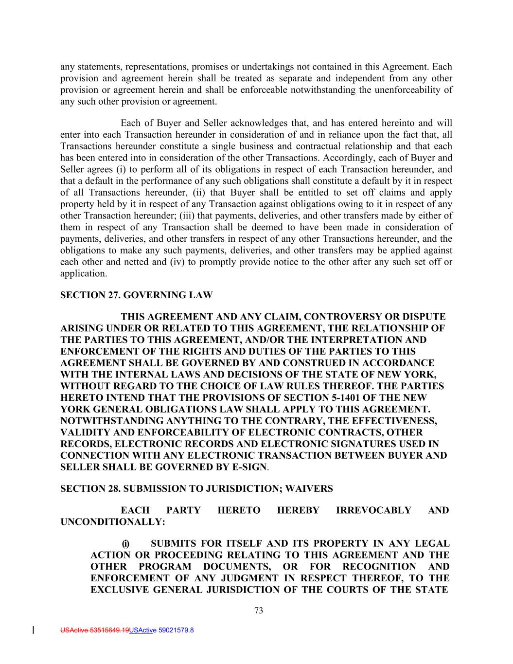 73 USActive 53515649.19USActive 59021579.8 any statements, representations, promises or undertakings not contained in this Agreement. Each provision and agreement herein shall be treated as separate and independent from any other provision or agreement herein and shall be enforceable notwithstanding the unenforceability of any such other provision or agreement. Each of Buyer and Seller acknowledges that, and has entered hereinto and will enter into each Transaction hereunder in consideration of and in reliance upon the fact that, all Transactions hereunder constitute a single business and contractual relationship and that each has been entered into in consideration of the other Transactions. Accordingly, each of Buyer and Seller agrees (i) to perform all of its obligations in respect of each Transaction hereunder, and that a default in the performance of any such obligations shall constitute a default by it in respect of all Transactions hereunder, (ii) that Buyer shall be entitled to set off claims and apply property held by it in respect of any Transaction against obligations owing to it in respect of any other Transaction hereunder; (iii) that payments, deliveries, and other transfers made by either of them in respect of any Transaction shall be deemed to have been made in consideration of payments, deliveries, and other transfers in respect of any other Transactions hereunder, and the obligations to make any such payments, deliveries, and other transfers may be applied against each other and netted and (iv) to promptly provide notice to the other after any such set off or application. SECTION 27. GOVERNING LAW THIS AGREEMENT AND ANY CLAIM, CONTROVERSY OR DISPUTE ARISING UNDER OR RELATED TO THIS AGREEMENT, THE RELATIONSHIP OF THE PARTIES TO THIS AGREEMENT, AND/OR THE INTERPRETATION AND ENFORCEMENT OF THE RIGHTS AND DUTIES OF THE PARTIES TO THIS AGREEMENT SHALL BE GOVERNED BY AND CONSTRUED IN ACCORDANCE WITH THE INTERNAL LAWS AND DECISIONS OF THE STATE OF NEW YORK, WITHOUT REGARD TO THE CHOICE OF LAW RULES THEREOF. THE PARTIES HERETO INTEND THAT THE PROVISIONS OF SECTION 5-1401 OF THE NEW YORK GENERAL OBLIGATIONS LAW SHALL APPLY TO THIS AGREEMENT. NOTWITHSTANDING ANYTHING TO THE CONTRARY, THE EFFECTIVENESS, VALIDITY AND ENFORCEABILITY OF ELECTRONIC CONTRACTS, OTHER RECORDS, ELECTRONIC RECORDS AND ELECTRONIC SIGNATURES USED IN CONNECTION WITH ANY ELECTRONIC TRANSACTION BETWEEN BUYER AND SELLER SHALL BE GOVERNED BY E-SIGN. SECTION 28. SUBMISSION TO JURISDICTION; WAIVERS EACH PARTY HERETO HEREBY IRREVOCABLY AND UNCONDITIONALLY: (i) SUBMITS FOR ITSELF AND ITS PROPERTY IN ANY LEGAL ACTION OR PROCEEDING RELATING TO THIS AGREEMENT AND THE OTHER PROGRAM DOCUMENTS, OR FOR RECOGNITION AND ENFORCEMENT OF ANY JUDGMENT IN RESPECT THEREOF, TO THE EXCLUSIVE GENERAL JURISDICTION OF THE COURTS OF THE STATE