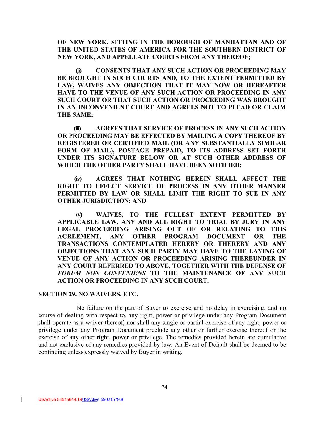 74 USActive 53515649.19USActive 59021579.8 OF NEW YORK, SITTING IN THE BOROUGH OF MANHATTAN AND OF THE UNITED STATES OF AMERICA FOR THE SOUTHERN DISTRICT OF NEW YORK, AND APPELLATE COURTS FROM ANY THEREOF; (ii) CONSENTS THAT ANY SUCH ACTION OR PROCEEDING MAY BE BROUGHT IN SUCH COURTS AND, TO THE EXTENT PERMITTED BY LAW, WAIVES ANY OBJECTION THAT IT MAY NOW OR HEREAFTER HAVE TO THE VENUE OF ANY SUCH ACTION OR PROCEEDING IN ANY SUCH COURT OR THAT SUCH ACTION OR PROCEEDING WAS BROUGHT IN AN INCONVENIENT COURT AND AGREES NOT TO PLEAD OR CLAIM THE SAME; (iii) AGREES THAT SERVICE OF PROCESS IN ANY SUCH ACTION OR PROCEEDING MAY BE EFFECTED BY MAILING A COPY THEREOF BY REGISTERED OR CERTIFIED MAIL (OR ANY SUBSTANTIALLY SIMILAR FORM OF MAIL), POSTAGE PREPAID, TO ITS ADDRESS SET FORTH UNDER ITS SIGNATURE BELOW OR AT SUCH OTHER ADDRESS OF WHICH THE OTHER PARTY SHALL HAVE BEEN NOTIFIED; (iv) AGREES THAT NOTHING HEREIN SHALL AFFECT THE RIGHT TO EFFECT SERVICE OF PROCESS IN ANY OTHER MANNER PERMITTED BY LAW OR SHALL LIMIT THE RIGHT TO SUE IN ANY OTHER JURISDICTION; AND (v) WAIVES, TO THE FULLEST EXTENT PERMITTED BY APPLICABLE LAW, ANY AND ALL RIGHT TO TRIAL BY JURY IN ANY LEGAL PROCEEDING ARISING OUT OF OR RELATING TO THIS AGREEMENT, ANY OTHER PROGRAM DOCUMENT OR THE TRANSACTIONS CONTEMPLATED HEREBY OR THEREBY AND ANY OBJECTIONS THAT ANY SUCH PARTY MAY HAVE TO THE LAYING OF VENUE OF ANY ACTION OR PROCEEDING ARISING THEREUNDER IN ANY COURT REFERRED TO ABOVE, TOGETHER WITH THE DEFENSE OF FORUM NON CONVENIENS TO THE MAINTENANCE OF ANY SUCH ACTION OR PROCEEDING IN ANY SUCH COURT. SECTION 29. NO WAIVERS, ETC. No failure on the part of Buyer to exercise and no delay in exercising, and no course of dealing with respect to, any right, power or privilege under any Program Document shall operate as a waiver thereof, nor shall any single or partial exercise of any right, power or privilege under any Program Document preclude any other or further exercise thereof or the exercise of any other right, power or privilege. The remedies provided herein are cumulative and not exclusive of any remedies provided by law. An Event of Default shall be deemed to be continuing unless expressly waived by Buyer in writing.