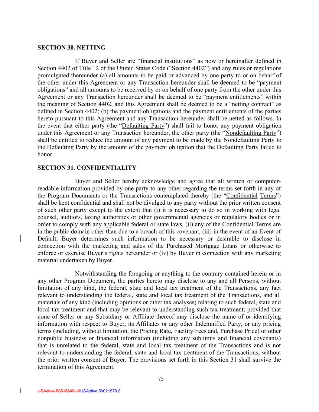 75 USActive 53515649.19USActive 59021579.8 SECTION 30. NETTING If Buyer and Seller are “financial institutions” as now or hereinafter defined in Section 4402 of Title 12 of the United States Code (“Section 4402”) and any rules or regulations promulgated thereunder (a) all amounts to be paid or advanced by one party to or on behalf of the other under this Agreement or any Transaction hereunder shall be deemed to be “payment obligations” and all amounts to be received by or on behalf of one party from the other under this Agreement or any Transaction hereunder shall be deemed to be “payment entitlements” within the meaning of Section 4402, and this Agreement shall be deemed to be a “netting contract” as defined in Section 4402; (b) the payment obligations and the payment entitlements of the parties hereto pursuant to this Agreement and any Transaction hereunder shall be netted as follows. In the event that either party (the “Defaulting Party”) shall fail to honor any payment obligation under this Agreement or any Transaction hereunder, the other party (the “Nondefaulting Party”) shall be entitled to reduce the amount of any payment to be made by the Nondefaulting Party to the Defaulting Party by the amount of the payment obligation that the Defaulting Party failed to honor. SECTION 31. CONFIDENTIALITY Buyer and Seller hereby acknowledge and agree that all written or computer- readable information provided by one party to any other regarding the terms set forth in any of the Program Documents or the Transactions contemplated thereby (the “Confidential Terms”) shall be kept confidential and shall not be divulged to any party without the prior written consent of such other party except to the extent that (i) it is necessary to do so in working with legal counsel, auditors, taxing authorities or other governmental agencies or regulatory bodies or in order to comply with any applicable federal or state laws, (ii) any of the Confidential Terms are in the public domain other than due to a breach of this covenant, (iii) in the event of an Event of Default, Buyer determines such information to be necessary or desirable to disclose in connection with the marketing and sales of the Purchased Mortgage Loans or otherwise to enforce or exercise Buyer’s rights hereunder or (iv) by Buyer in connection with any marketing material undertaken by Buyer. Notwithstanding the foregoing or anything to the contrary contained herein or in any other Program Document, the parties hereto may disclose to any and all Persons, without limitation of any kind, the federal, state and local tax treatment of the Transactions, any fact relevant to understanding the federal, state and local tax treatment of the Transactions, and all materials of any kind (including opinions or other tax analyses) relating to such federal, state and local tax treatment and that may be relevant to understanding such tax treatment; provided that none of Seller or any Subsidiary or Affiliate thereof may disclose the name of or identifying information with respect to Buyer, its Affiliates or any other Indemnified Party, or any pricing terms (including, without limitation, the Pricing Rate, Facility Fees and, Purchase Price) or other nonpublic business or financial information (including any sublimits and financial covenants) that is unrelated to the federal, state and local tax treatment of the Transactions and is not relevant to understanding the federal, state and local tax treatment of the Transactions, without the prior written consent of Buyer. The provisions set forth in this Section 31 shall survive the termination of this Agreement.