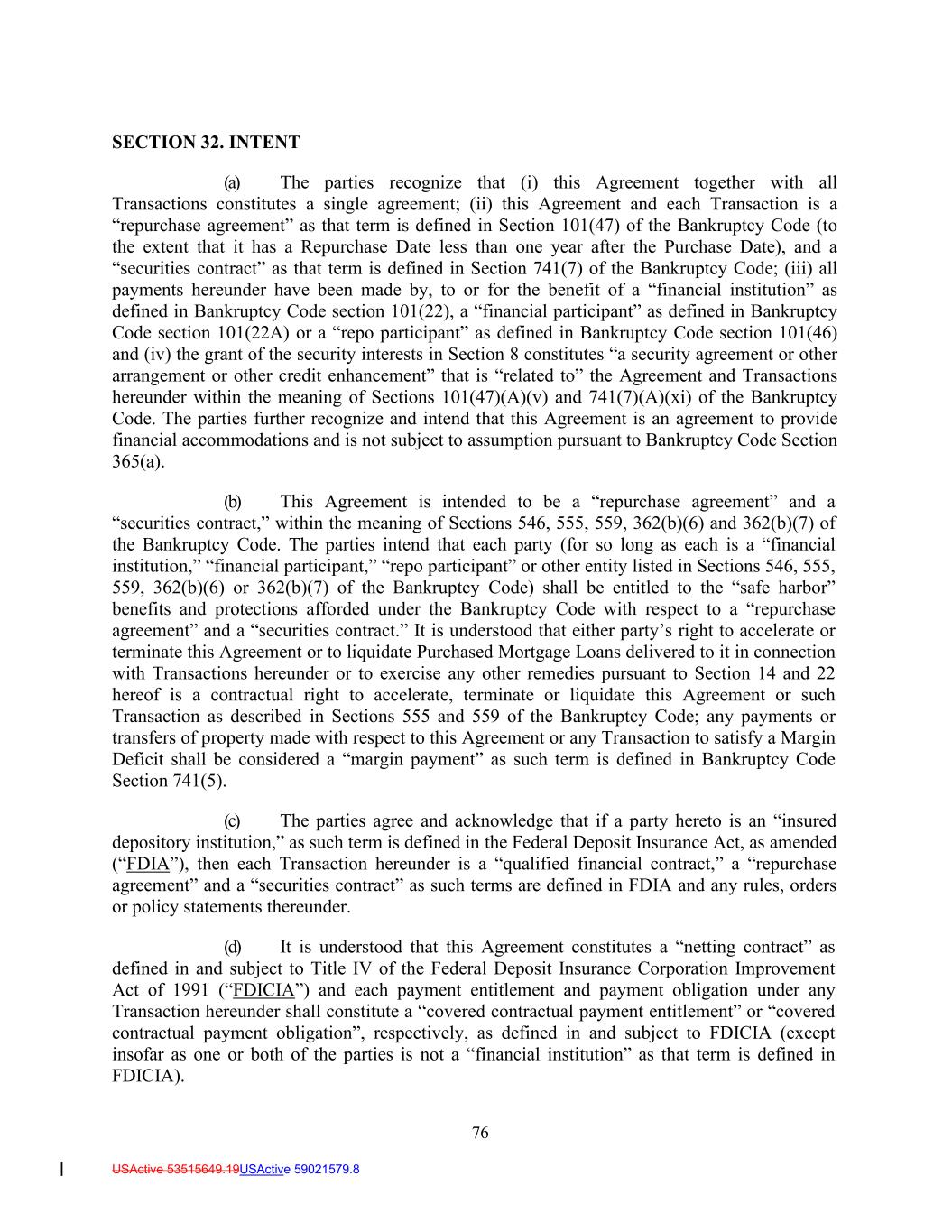 76 USActive 53515649.19USActive 59021579.8 SECTION 32. INTENT (a) The parties recognize that (i) this Agreement together with all Transactions constitutes a single agreement; (ii) this Agreement and each Transaction is a “repurchase agreement” as that term is defined in Section 101(47) of the Bankruptcy Code (to the extent that it has a Repurchase Date less than one year after the Purchase Date), and a “securities contract” as that term is defined in Section 741(7) of the Bankruptcy Code; (iii) all payments hereunder have been made by, to or for the benefit of a “financial institution” as defined in Bankruptcy Code section 101(22), a “financial participant” as defined in Bankruptcy Code section 101(22A) or a “repo participant” as defined in Bankruptcy Code section 101(46) and (iv) the grant of the security interests in Section 8 constitutes “a security agreement or other arrangement or other credit enhancement” that is “related to” the Agreement and Transactions hereunder within the meaning of Sections 101(47)(A)(v) and 741(7)(A)(xi) of the Bankruptcy Code. The parties further recognize and intend that this Agreement is an agreement to provide financial accommodations and is not subject to assumption pursuant to Bankruptcy Code Section 365(a). (b) This Agreement is intended to be a “repurchase agreement” and a “securities contract,” within the meaning of Sections 546, 555, 559, 362(b)(6) and 362(b)(7) of the Bankruptcy Code. The parties intend that each party (for so long as each is a “financial institution,” “financial participant,” “repo participant” or other entity listed in Sections 546, 555, 559, 362(b)(6) or 362(b)(7) of the Bankruptcy Code) shall be entitled to the “safe harbor” benefits and protections afforded under the Bankruptcy Code with respect to a “repurchase agreement” and a “securities contract.” It is understood that either party’s right to accelerate or terminate this Agreement or to liquidate Purchased Mortgage Loans delivered to it in connection with Transactions hereunder or to exercise any other remedies pursuant to Section 14 and 22 hereof is a contractual right to accelerate, terminate or liquidate this Agreement or such Transaction as described in Sections 555 and 559 of the Bankruptcy Code; any payments or transfers of property made with respect to this Agreement or any Transaction to satisfy a Margin Deficit shall be considered a “margin payment” as such term is defined in Bankruptcy Code Section 741(5). (c) The parties agree and acknowledge that if a party hereto is an “insured depository institution,” as such term is defined in the Federal Deposit Insurance Act, as amended (“FDIA”), then each Transaction hereunder is a “qualified financial contract,” a “repurchase agreement” and a “securities contract” as such terms are defined in FDIA and any rules, orders or policy statements thereunder. (d) It is understood that this Agreement constitutes a “netting contract” as defined in and subject to Title IV of the Federal Deposit Insurance Corporation Improvement Act of 1991 (“FDICIA”) and each payment entitlement and payment obligation under any Transaction hereunder shall constitute a “covered contractual payment entitlement” or “covered contractual payment obligation”, respectively, as defined in and subject to FDICIA (except insofar as one or both of the parties is not a “financial institution” as that term is defined in FDICIA).