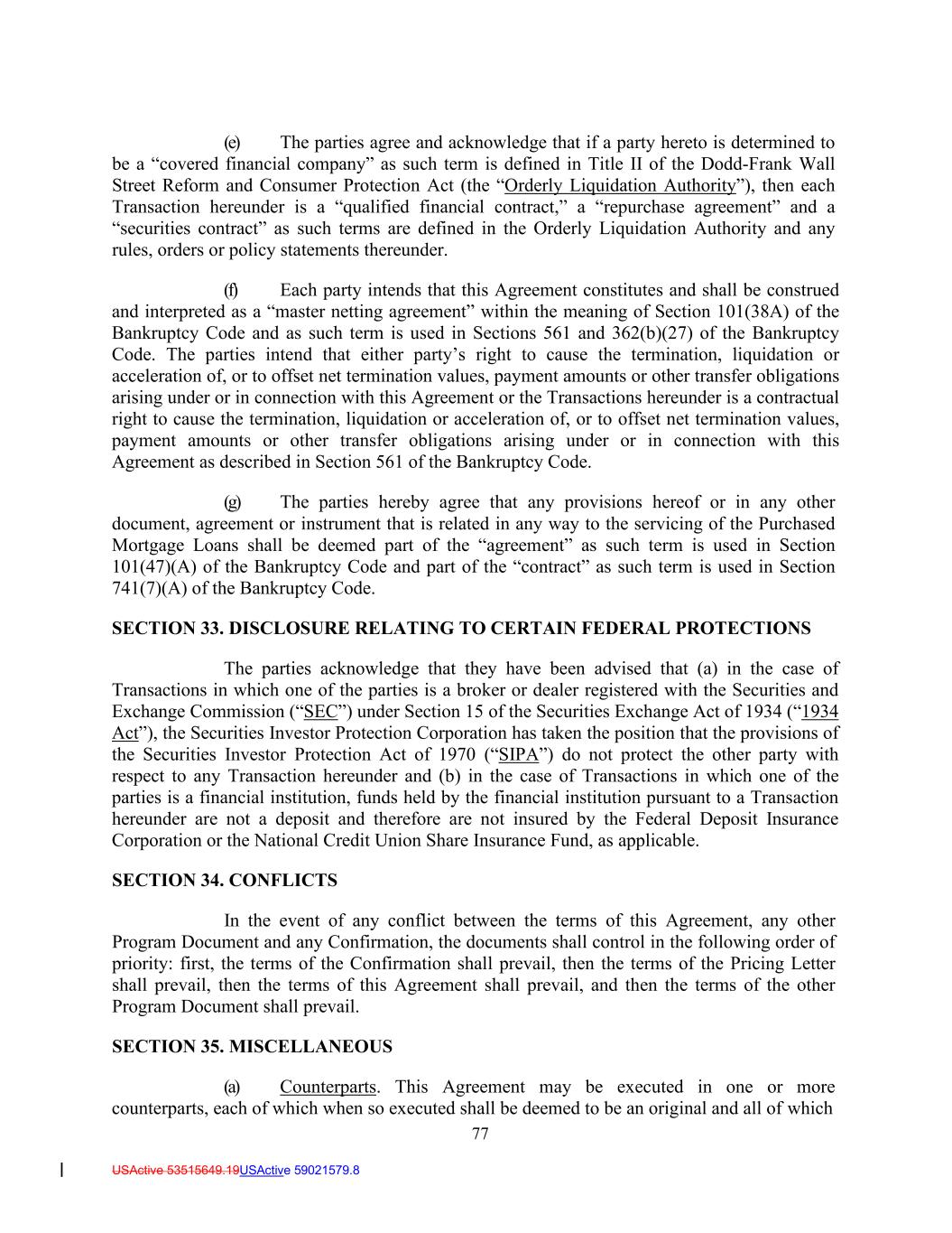 77 USActive 53515649.19USActive 59021579.8 (e) The parties agree and acknowledge that if a party hereto is determined to be a “covered financial company” as such term is defined in Title II of the Dodd-Frank Wall Street Reform and Consumer Protection Act (the “Orderly Liquidation Authority”), then each Transaction hereunder is a “qualified financial contract,” a “repurchase agreement” and a “securities contract” as such terms are defined in the Orderly Liquidation Authority and any rules, orders or policy statements thereunder. (f) Each party intends that this Agreement constitutes and shall be construed and interpreted as a “master netting agreement” within the meaning of Section 101(38A) of the Bankruptcy Code and as such term is used in Sections 561 and 362(b)(27) of the Bankruptcy Code. The parties intend that either party’s right to cause the termination, liquidation or acceleration of, or to offset net termination values, payment amounts or other transfer obligations arising under or in connection with this Agreement or the Transactions hereunder is a contractual right to cause the termination, liquidation or acceleration of, or to offset net termination values, payment amounts or other transfer obligations arising under or in connection with this Agreement as described in Section 561 of the Bankruptcy Code. (g) The parties hereby agree that any provisions hereof or in any other document, agreement or instrument that is related in any way to the servicing of the Purchased Mortgage Loans shall be deemed part of the “agreement” as such term is used in Section 101(47)(A) of the Bankruptcy Code and part of the “contract” as such term is used in Section 741(7)(A) of the Bankruptcy Code. SECTION 33. DISCLOSURE RELATING TO CERTAIN FEDERAL PROTECTIONS The parties acknowledge that they have been advised that (a) in the case of Transactions in which one of the parties is a broker or dealer registered with the Securities and Exchange Commission (“SEC”) under Section 15 of the Securities Exchange Act of 1934 (“1934 Act”), the Securities Investor Protection Corporation has taken the position that the provisions of the Securities Investor Protection Act of 1970 (“SIPA”) do not protect the other party with respect to any Transaction hereunder and (b) in the case of Transactions in which one of the parties is a financial institution, funds held by the financial institution pursuant to a Transaction hereunder are not a deposit and therefore are not insured by the Federal Deposit Insurance Corporation or the National Credit Union Share Insurance Fund, as applicable. SECTION 34. CONFLICTS In the event of any conflict between the terms of this Agreement, any other Program Document and any Confirmation, the documents shall control in the following order of priority: first, the terms of the Confirmation shall prevail, then the terms of the Pricing Letter shall prevail, then the terms of this Agreement shall prevail, and then the terms of the other Program Document shall prevail. SECTION 35. MISCELLANEOUS (a) Counterparts. This Agreement may be executed in one or more counterparts, each of which when so executed shall be deemed to be an original and all of which