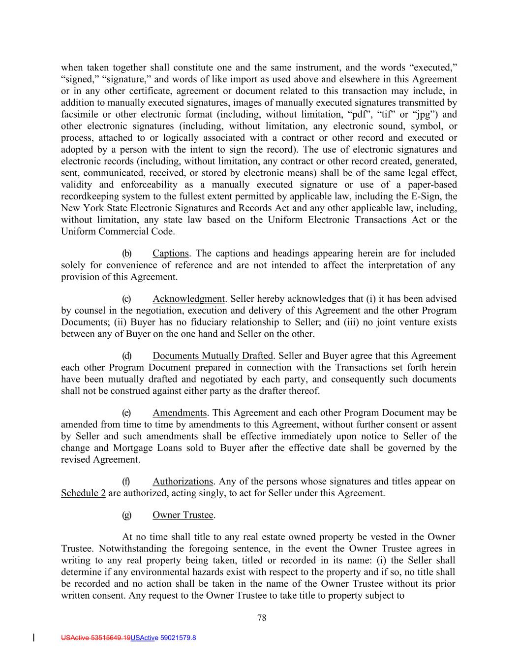 78 USActive 53515649.19USActive 59021579.8 when taken together shall constitute one and the same instrument, and the words “executed,” “signed,” “signature,” and words of like import as used above and elsewhere in this Agreement or in any other certificate, agreement or document related to this transaction may include, in addition to manually executed signatures, images of manually executed signatures transmitted by facsimile or other electronic format (including, without limitation, “pdf”, “tif” or “jpg”) and other electronic signatures (including, without limitation, any electronic sound, symbol, or process, attached to or logically associated with a contract or other record and executed or adopted by a person with the intent to sign the record). The use of electronic signatures and electronic records (including, without limitation, any contract or other record created, generated, sent, communicated, received, or stored by electronic means) shall be of the same legal effect, validity and enforceability as a manually executed signature or use of a paper-based recordkeeping system to the fullest extent permitted by applicable law, including the E-Sign, the New York State Electronic Signatures and Records Act and any other applicable law, including, without limitation, any state law based on the Uniform Electronic Transactions Act or the Uniform Commercial Code. (b) Captions. The captions and headings appearing herein are for included solely for convenience of reference and are not intended to affect the interpretation of any provision of this Agreement. (c) Acknowledgment. Seller hereby acknowledges that (i) it has been advised by counsel in the negotiation, execution and delivery of this Agreement and the other Program Documents; (ii) Buyer has no fiduciary relationship to Seller; and (iii) no joint venture exists between any of Buyer on the one hand and Seller on the other. (d) Documents Mutually Drafted. Seller and Buyer agree that this Agreement each other Program Document prepared in connection with the Transactions set forth herein have been mutually drafted and negotiated by each party, and consequently such documents shall not be construed against either party as the drafter thereof. (e) Amendments. This Agreement and each other Program Document may be amended from time to time by amendments to this Agreement, without further consent or assent by Seller and such amendments shall be effective immediately upon notice to Seller of the change and Mortgage Loans sold to Buyer after the effective date shall be governed by the revised Agreement. (f) Authorizations. Any of the persons whose signatures and titles appear on Schedule 2 are authorized, acting singly, to act for Seller under this Agreement. (g) Owner Trustee. At no time shall title to any real estate owned property be vested in the Owner Trustee. Notwithstanding the foregoing sentence, in the event the Owner Trustee agrees in writing to any real property being taken, titled or recorded in its name: (i) the Seller shall determine if any environmental hazards exist with respect to the property and if so, no title shall be recorded and no action shall be taken in the name of the Owner Trustee without its prior written consent. Any request to the Owner Trustee to take title to property subject to