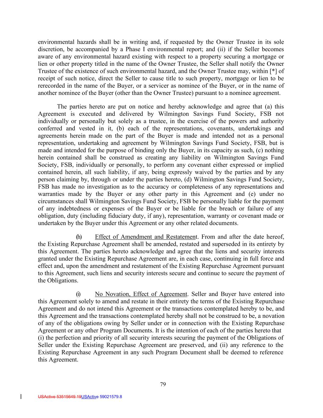 79 USActive 53515649.19USActive 59021579.8 environmental hazards shall be in writing and, if requested by the Owner Trustee in its sole discretion, be accompanied by a Phase I environmental report; and (ii) if the Seller becomes aware of any environmental hazard existing with respect to a property securing a mortgage or lien or other property titled in the name of the Owner Trustee, the Seller shall notify the Owner Trustee of the existence of such environmental hazard, and the Owner Trustee may, within [*] of receipt of such notice, direct the Seller to cause title to such property, mortgage or lien to be rerecorded in the name of the Buyer, or a servicer as nominee of the Buyer, or in the name of another nominee of the Buyer (other than the Owner Trustee) pursuant to a nominee agreement. The parties hereto are put on notice and hereby acknowledge and agree that (a) this Agreement is executed and delivered by Wilmington Savings Fund Society, FSB not individually or personally but solely as a trustee, in the exercise of the powers and authority conferred and vested in it, (b) each of the representations, covenants, undertakings and agreements herein made on the part of the Buyer is made and intended not as a personal representation, undertaking and agreement by Wilmington Savings Fund Society, FSB, but is made and intended for the purpose of binding only the Buyer, in its capacity as such, (c) nothing herein contained shall be construed as creating any liability on Wilmington Savings Fund Society, FSB, individually or personally, to perform any covenant either expressed or implied contained herein, all such liability, if any, being expressly waived by the parties and by any person claiming by, through or under the parties hereto, (d) Wilmington Savings Fund Society, FSB has made no investigation as to the accuracy or completeness of any representations and warranties made by the Buyer or any other party in this Agreement and (e) under no circumstances shall Wilmington Savings Fund Society, FSB be personally liable for the payment of any indebtedness or expenses of the Buyer or be liable for the breach or failure of any obligation, duty (including fiduciary duty, if any), representation, warranty or covenant made or undertaken by the Buyer under this Agreement or any other related documents. (h) Effect of Amendment and Restatement. From and after the date hereof, the Existing Repurchase Agreement shall be amended, restated and superseded in its entirety by this Agreement. The parties hereto acknowledge and agree that the liens and security interests granted under the Existing Repurchase Agreement are, in each case, continuing in full force and effect and, upon the amendment and restatement of the Existing Repurchase Agreement pursuant to this Agreement, such liens and security interests secure and continue to secure the payment of the Obligations. (i) No Novation, Effect of Agreement. Seller and Buyer have entered into this Agreement solely to amend and restate in their entirety the terms of the Existing Repurchase Agreement and do not intend this Agreement or the transactions contemplated hereby to be, and this Agreement and the transactions contemplated hereby shall not be construed to be, a novation of any of the obligations owing by Seller under or in connection with the Existing Repurchase Agreement or any other Program Documents. It is the intention of each of the parties hereto that (i) the perfection and priority of all security interests securing the payment of the Obligations of Seller under the Existing Repurchase Agreement are preserved, and (ii) any reference to the Existing Repurchase Agreement in any such Program Document shall be deemed to reference this Agreement.