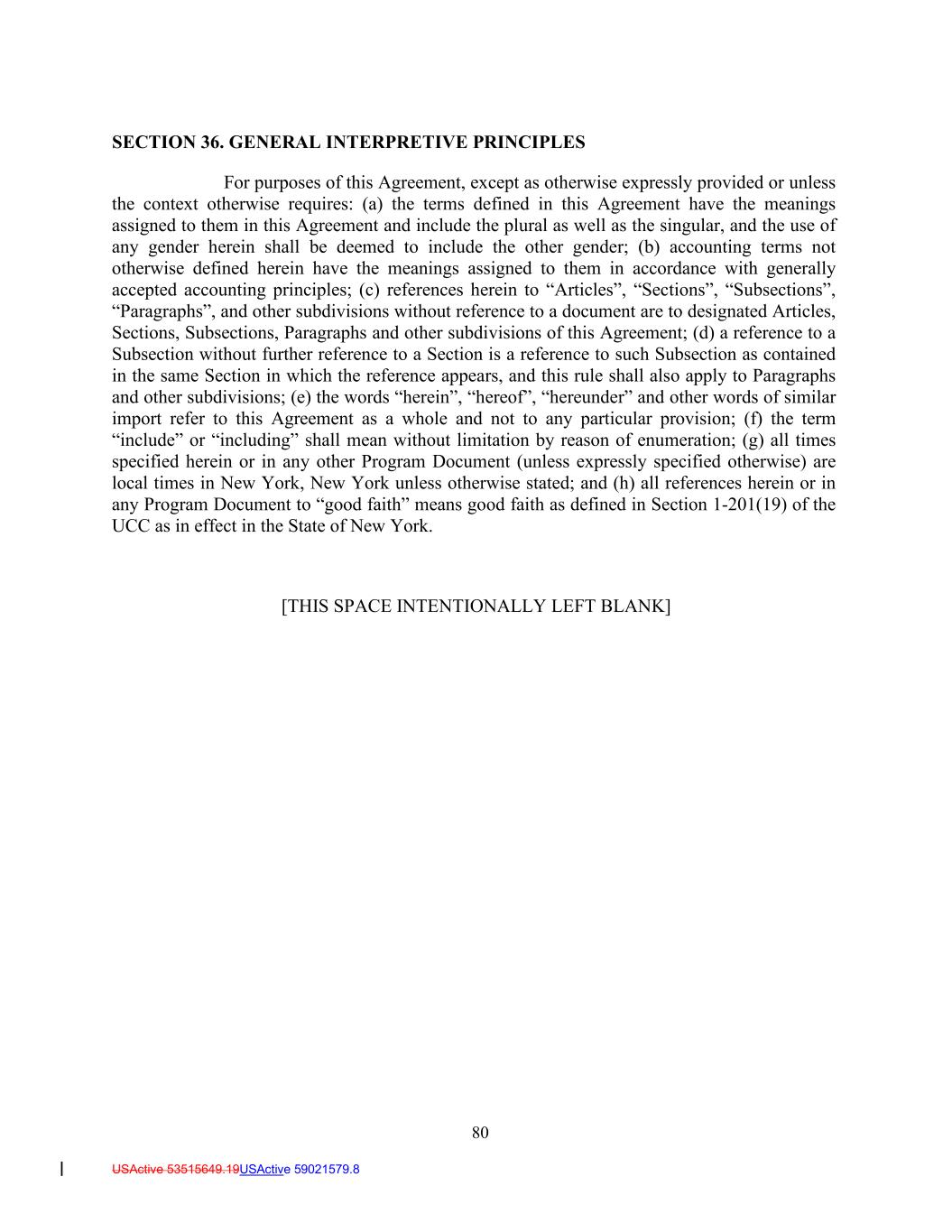 USActive 53515649.19USActive 59021579.8 SECTION 36. GENERAL INTERPRETIVE PRINCIPLES For purposes of this Agreement, except as otherwise expressly provided or unless the context otherwise requires: (a) the terms defined in this Agreement have the meanings assigned to them in this Agreement and include the plural as well as the singular, and the use of any gender herein shall be deemed to include the other gender; (b) accounting terms not otherwise defined herein have the meanings assigned to them in accordance with generally accepted accounting principles; (c) references herein to “Articles”, “Sections”, “Subsections”, “Paragraphs”, and other subdivisions without reference to a document are to designated Articles, Sections, Subsections, Paragraphs and other subdivisions of this Agreement; (d) a reference to a Subsection without further reference to a Section is a reference to such Subsection as contained in the same Section in which the reference appears, and this rule shall also apply to Paragraphs and other subdivisions; (e) the words “herein”, “hereof”, “hereunder” and other words of similar import refer to this Agreement as a whole and not to any particular provision; (f) the term “include” or “including” shall mean without limitation by reason of enumeration; (g) all times specified herein or in any other Program Document (unless expressly specified otherwise) are local times in New York, New York unless otherwise stated; and (h) all references herein or in any Program Document to “good faith” means good faith as defined in Section 1-201(19) of the UCC as in effect in the State of New York. [THIS SPACE INTENTIONALLY LEFT BLANK] 80