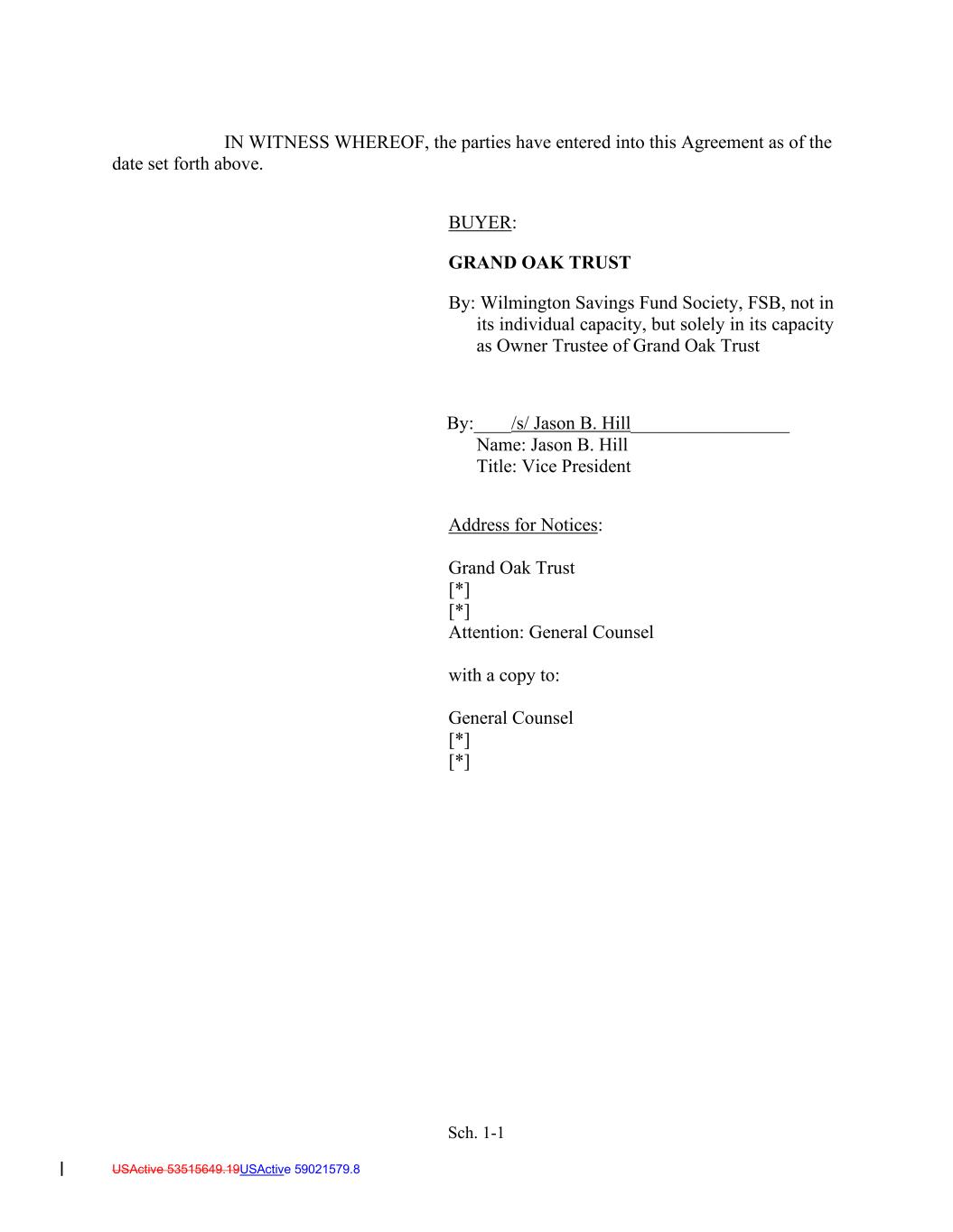 Sch. 1-1 USActive 53515649.19USActive 59021579.8 IN WITNESS WHEREOF, the parties have entered into this Agreement as of the date set forth above. BUYER: GRAND OAK TRUST By: Wilmington Savings Fund Society, FSB, not in its individual capacity, but solely in its capacity as Owner Trustee of Grand Oak Trust By:____/s/ Jason B. Hill_________________ Name: Jason B. Hill Title: Vice President Address for Notices: Grand Oak Trust [*] [*] Attention: General Counsel with a copy to: General Counsel [*] [*]