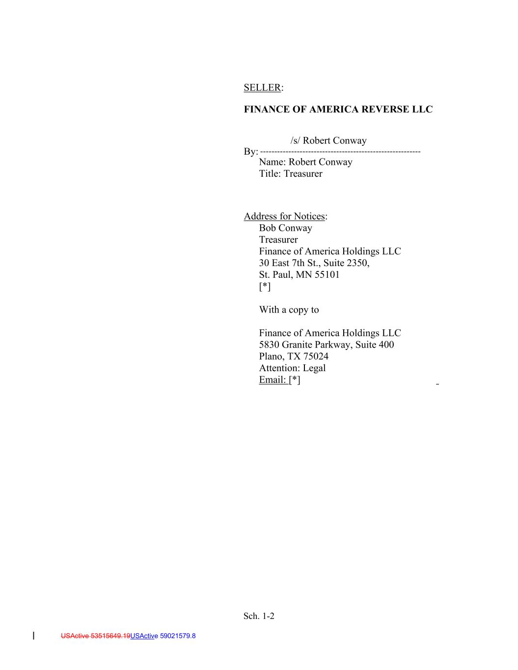 Sch. 1-2 USActive 53515649.19USActive 59021579.8 SELLER: FINANCE OF AMERICA REVERSE LLC By: /s/ Robert Conway --------------------------------------------------------- Name: Robert Conway Title: Treasurer Address for Notices: Bob Conway Treasurer Finance of America Holdings LLC 30 East 7th St., Suite 2350, St. Paul, MN 55101 [*] With a copy to Finance of America Holdings LLC 5830 Granite Parkway, Suite 400 Plano, TX 75024 Attention: Legal Email: [*]